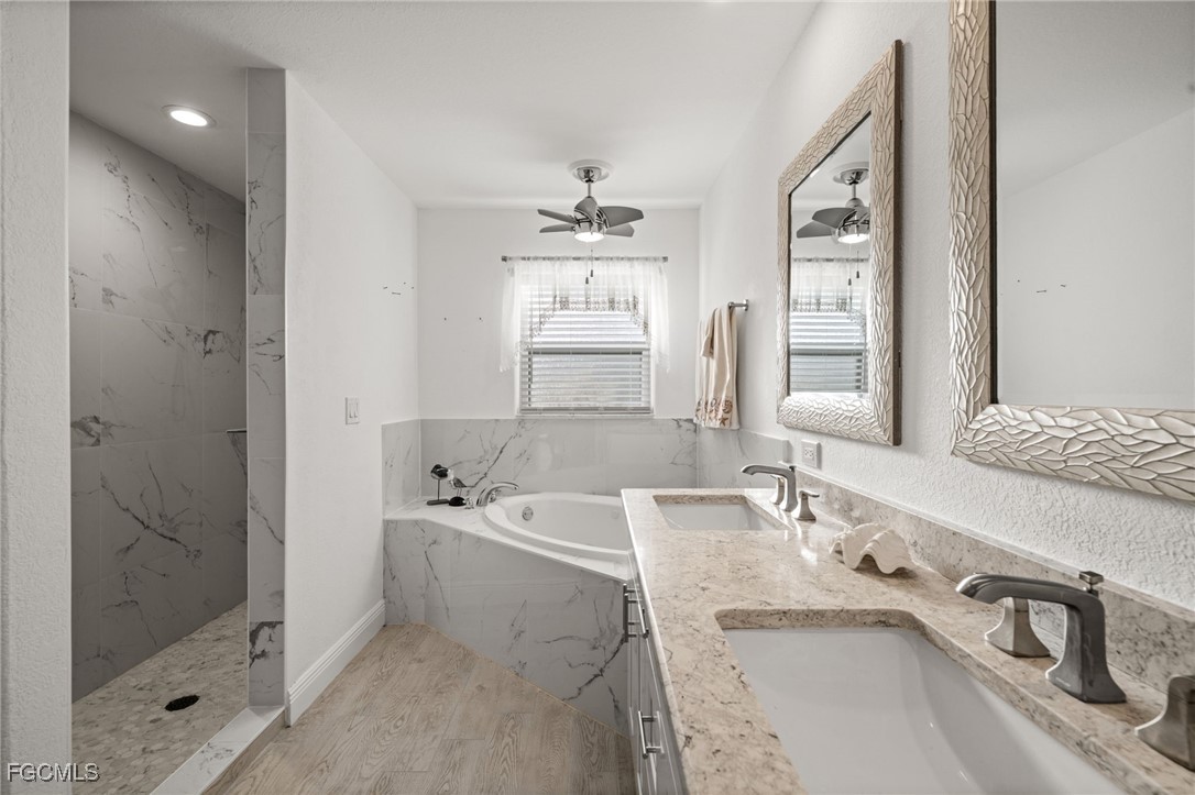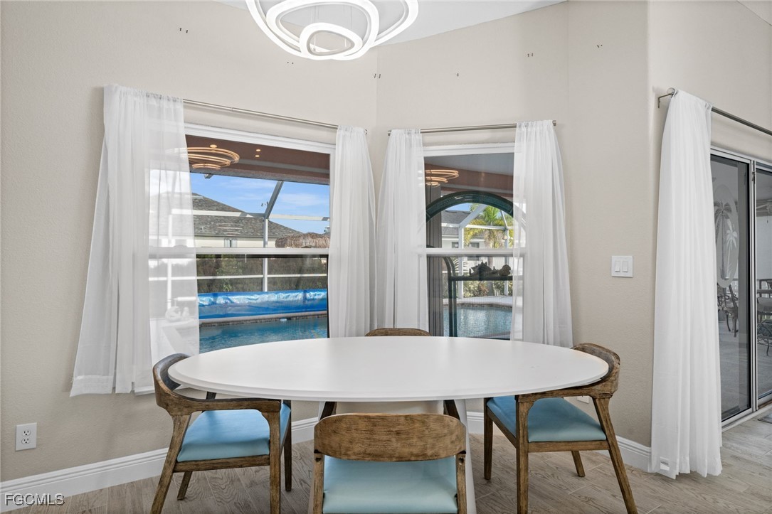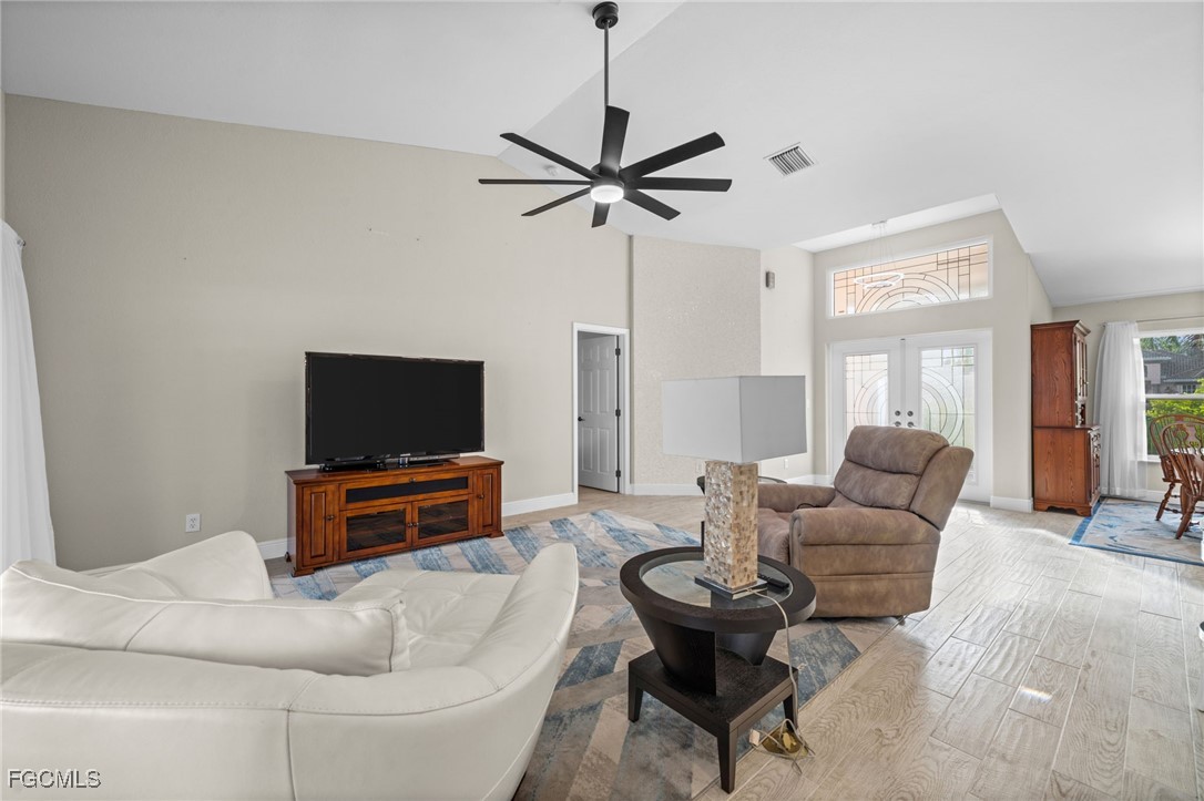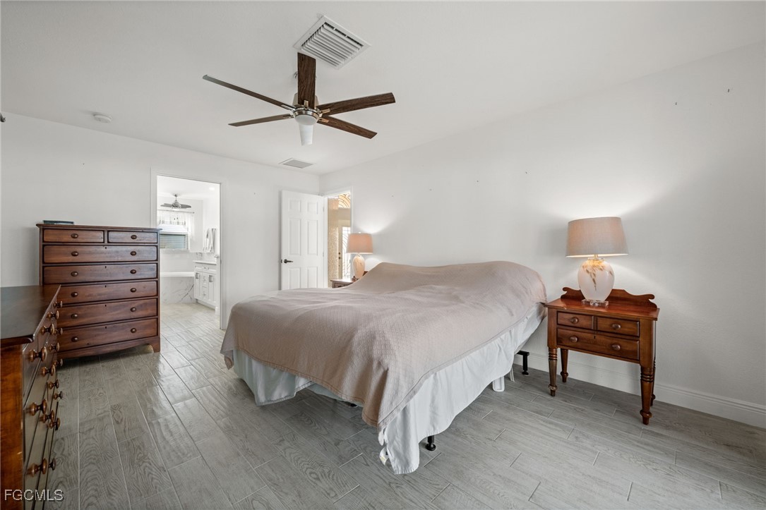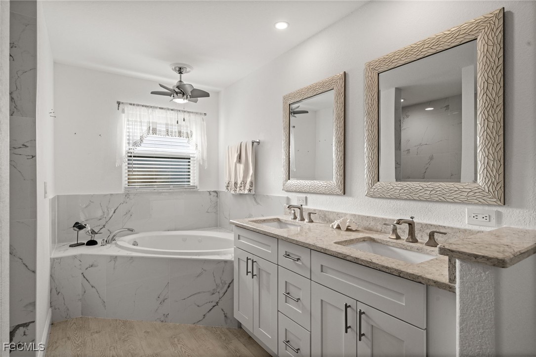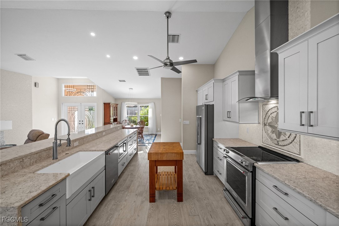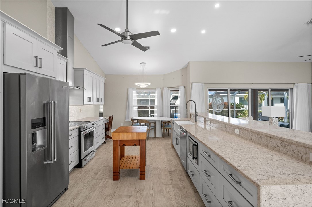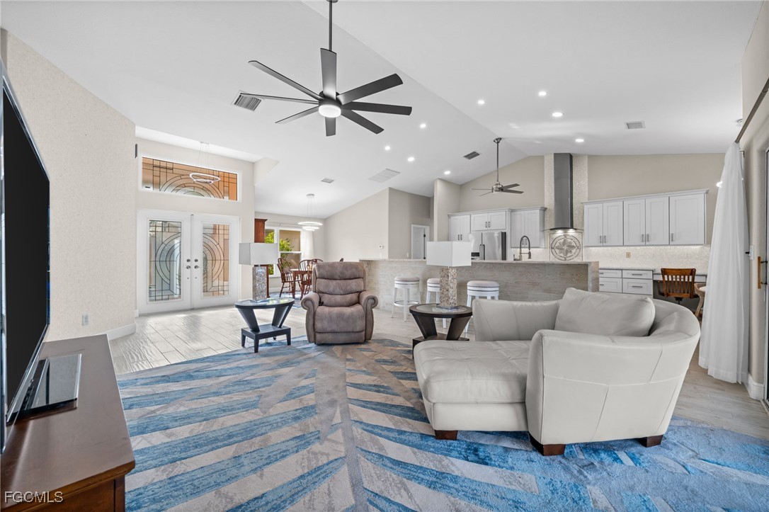 Florida Living at Its Finest! Remodeled 4-bedroom, 3-bath pool home with soaring ceilings and walls of natural light. Open-concept great room with split-bedroom layout and wood plank tile flooring throughout creates an airy, inviting flow perfect for everyday living and entertaining. The show-stopping kitchen features a dramatic quartz waterfall island, premium stainless steel appliances, custom wood cabinetry with pull-outs, and a sleek over-range hood—ideal for chefs and entertaining alike. The private primary suite is a true retreat with sliders to the lanai, a generous walk-in closet, and spa-style bath with walk-in shower, jetted soaking tub, and dual-sink vanities. Guest baths include beautifully tiled walk-in showers and quartz countertops. Outdoor living shines with a pool deck running the full length of the home, a spacious shaded area under truss on the lanai, sunny spots around the pool, and an additional pavered space perfect for BBQs, firepit, or outdoor dining. Set in a community surrounded by golf-access homes, this property combines leisure, lifestyle, and location. Additional highlights include an in-residence laundry room and new roof (2023). This home offers light, space, and the very best of Florida living—inside and out.