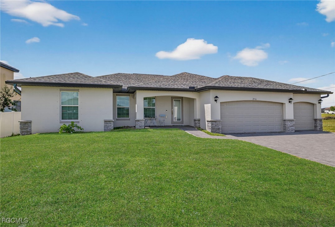 Welcome to Paradise in Cape Coral! Discover this like-new home, perfectly positioned in one of Cape Coral’s most sought-after neighborhoods—surrounded by stunning Gulf-access homes. Enjoy peaceful streets, palm-lined views, and the refreshing coastal breeze that define true Southwest Florida living. This 3-bedroom, 2-bath residence with a 3-car garage showcases exceptional craftsmanship and modern style. The open-concept design features cathedral ceilings, a center-island kitchen with granite countertops, soft-close cabinetry, and stainless steel appliances—ideal for entertaining or everyday comfort. The spacious living area flows effortlessly to a large under-truss lanai, the perfect spot to unwind and take in the tranquil surroundings. Notable features include: Lenox 14 SEER high-efficiency A/C system, PGT Low-E insulated windows, Moen plumbing fixtures, 18” tile flooring in main living areas, Epoxy-coated 3-car garage floors, Stone accents on front elevation. Just minutes from shopping, dining, and Cape Coral’s best boating waters, this home combines modern design with timeless coastal charm. Come see why this neighborhood is one of the city’s hidden gems—surrounded by Gulf-access beauty and breathtaking sunsets.