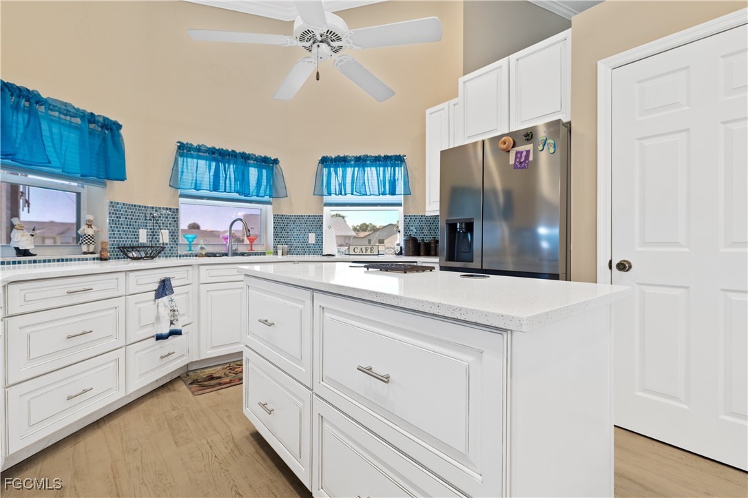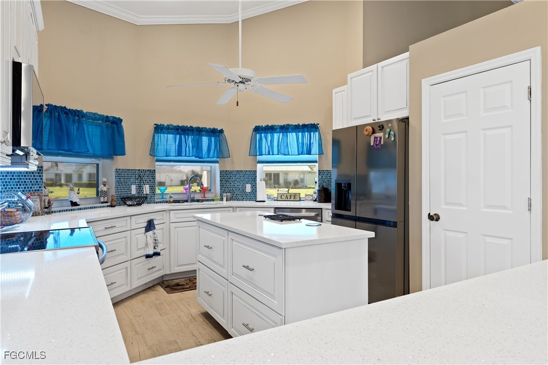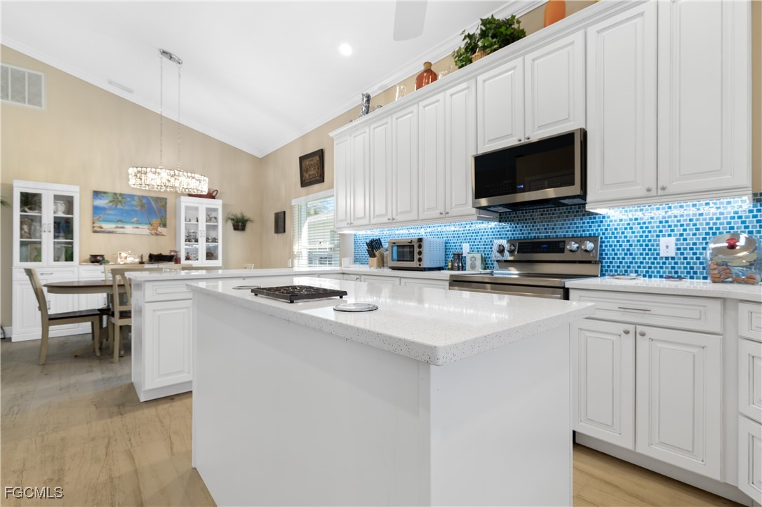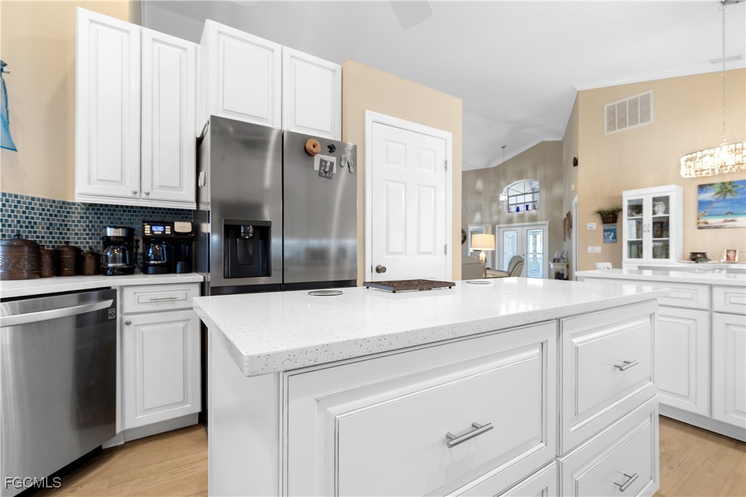 The kitchen has been expanded and re-imagined with custom soft-close cabinetry, slide-out shelving, and a spacious center island—perfect for entertaining. Additional custom cabinets in the laundry room (14" deep for large containers) and both baths provide thoughtful storage throughout. Designer lighting fixtures elevate the dining room and foyer, while all appliances—including refrigerator, stove, microwave, dishwasher, disposal, washer, and dryer—were replaced in 2023. A new HVAC system was installed in 2024 for year-round comfort. Garage is oversized 2 car 24X20.