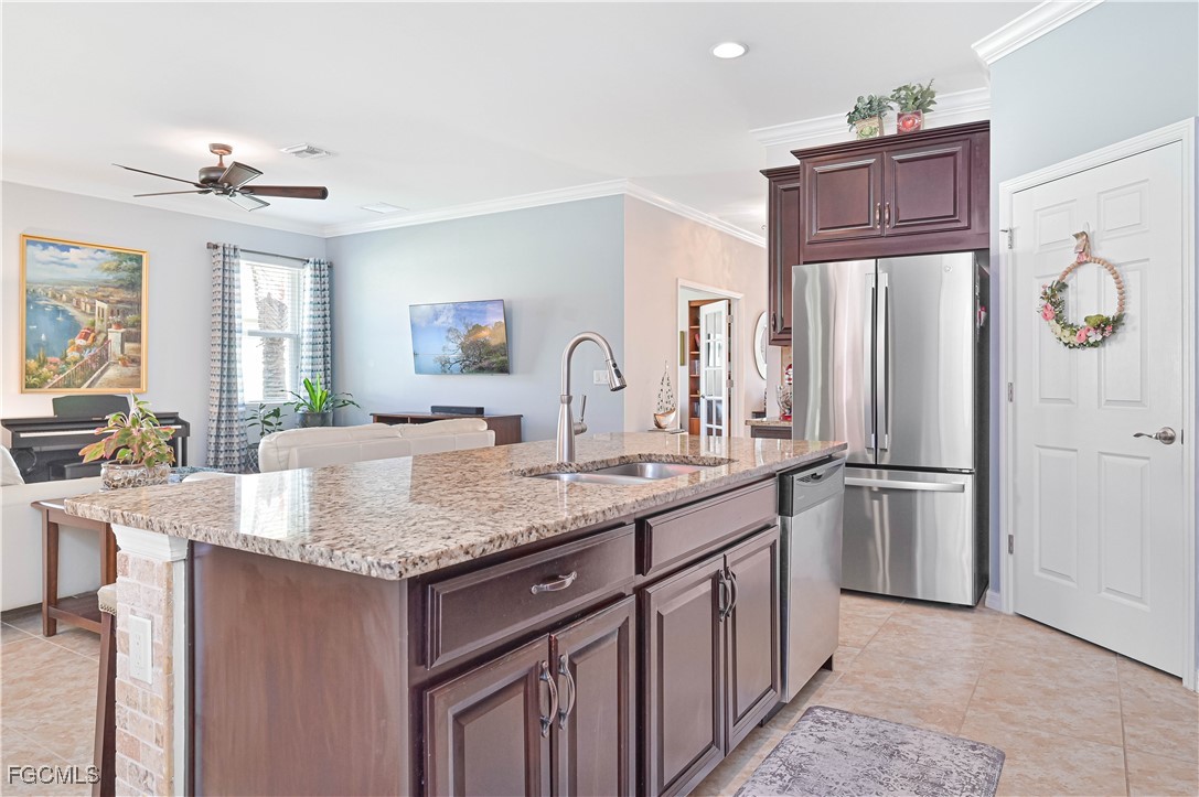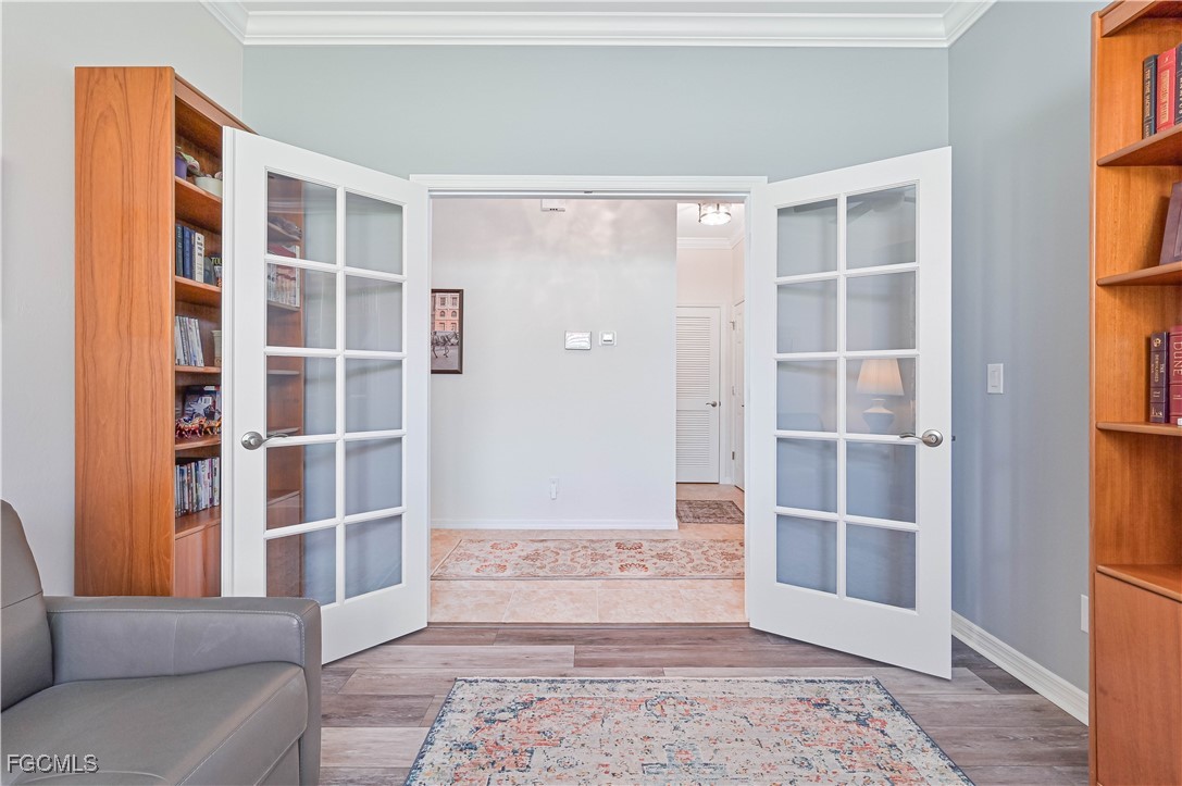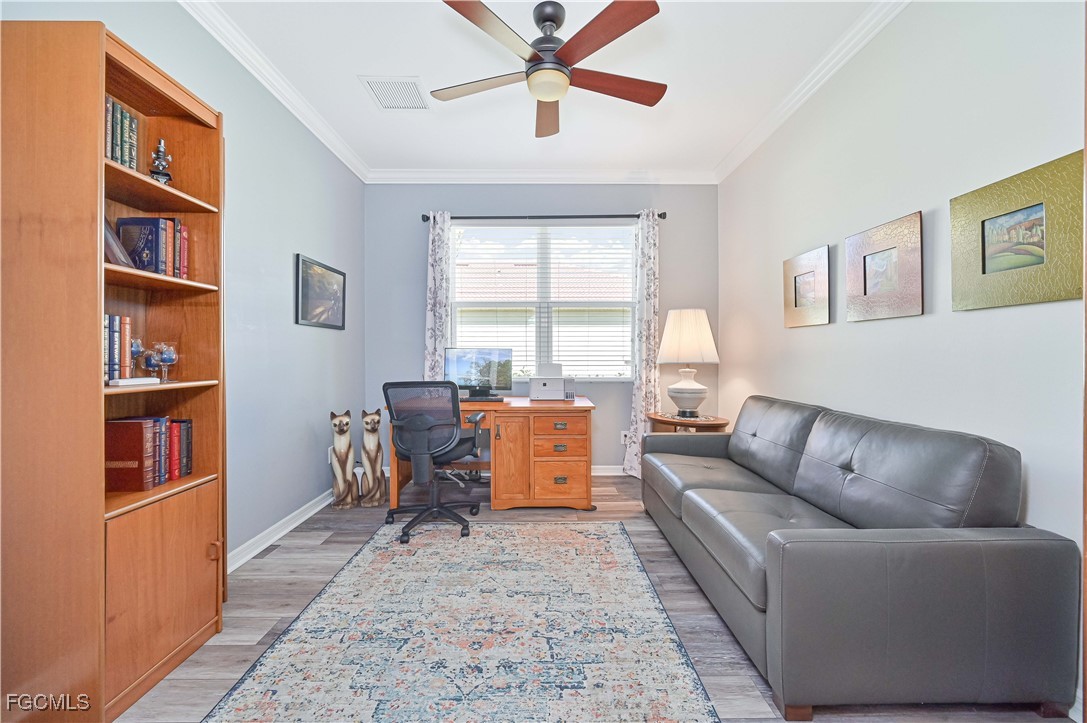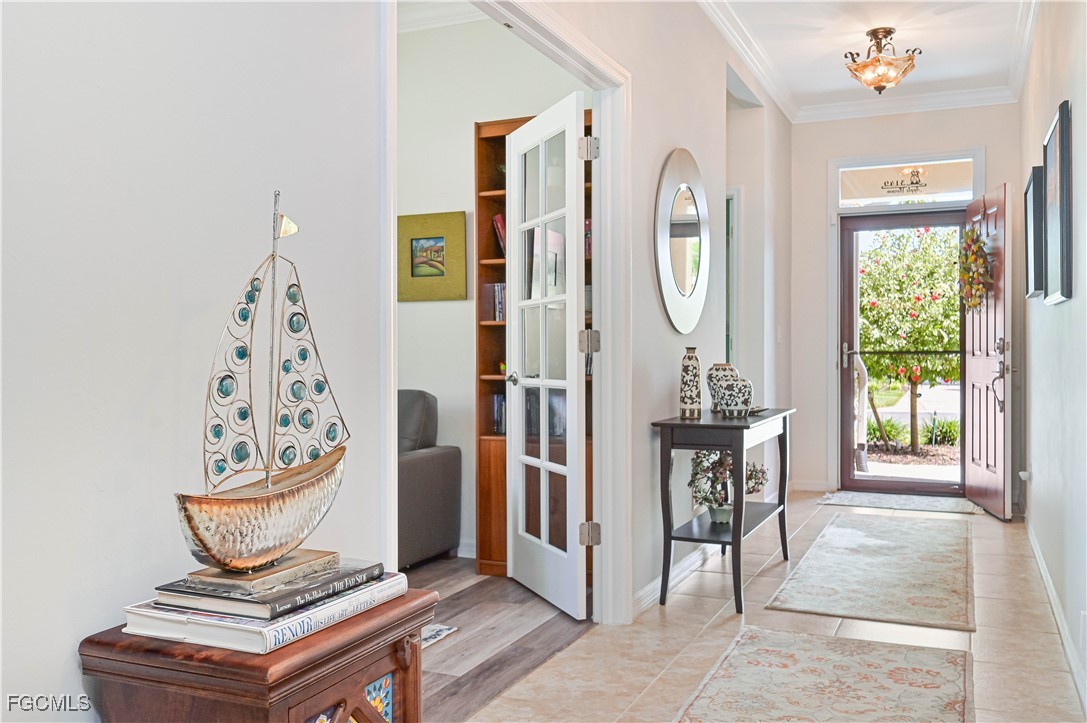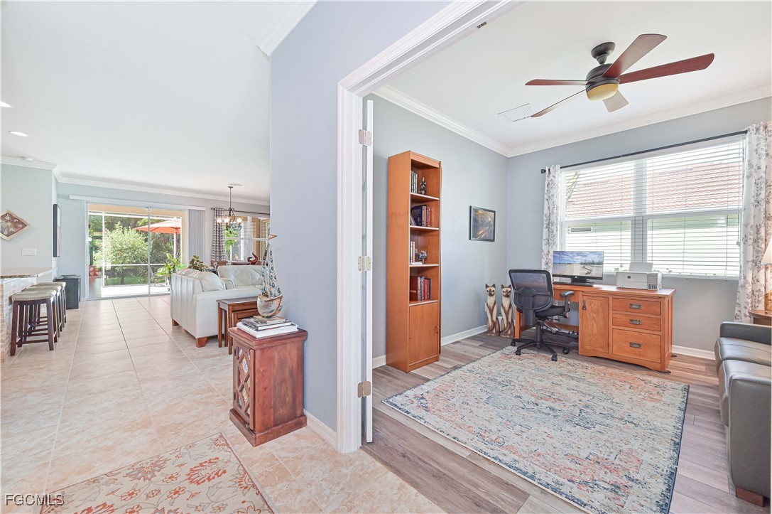 GOLF CART INCLUDED!!! Welcome to your dream home in the Fabulous 55+ community in Cascades at River Hall featuring a large 65’ wide lot for more privacy and space between you and your neighbors. This stunning single-family home boasts 2 bedrooms, 2 bathrooms, den, a spacious 2-car garage and extended lanai with electrical for a hot tub. The interior features a modern office space, stainless steel appliances, a laundry tub, and grab bars in the tub/shower/toilet room for added safety and convenience. The kitchen is equipped with pantry closet shelving/drawers, lower cabinet pull-out drawers, a new fridge, newer induction range and newer microwave. Crown molding and ceiling fans can also be found throughout the home creating a cozy and inviting atmosphere. Enjoy the luxury of a homeowner-owned Kinetico whole house water softening system. For added security, the home is equipped with a Ring doorbell and ADT security system with monitored smoke alarms. The home also includes enhanced hurricane-protection with roll-down Kevlar screens in the lanai and accordion window shutters. The garage offers overhead storage and extra outlets including electrical for a portable generator. The exterior features brick pavers, gutters, downspouts all around, and a widened driveway for convenience. Don't miss out on this incredible opportunity to own a meticulously maintained home with all the upgrades you could ever want!