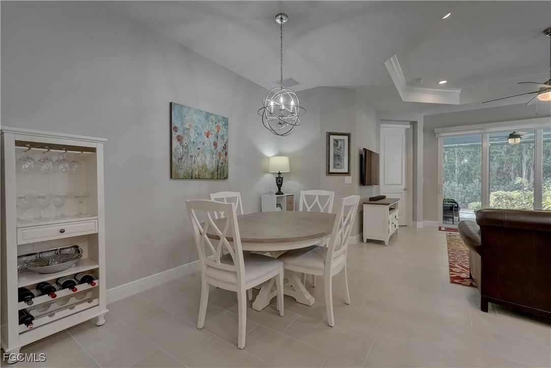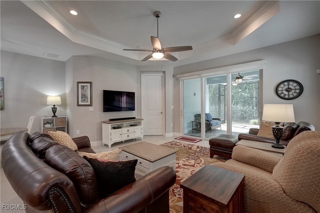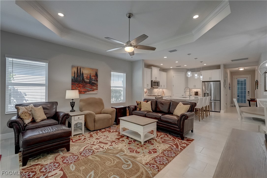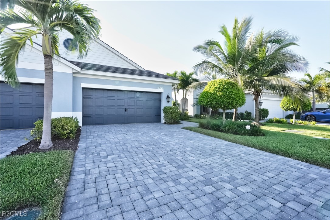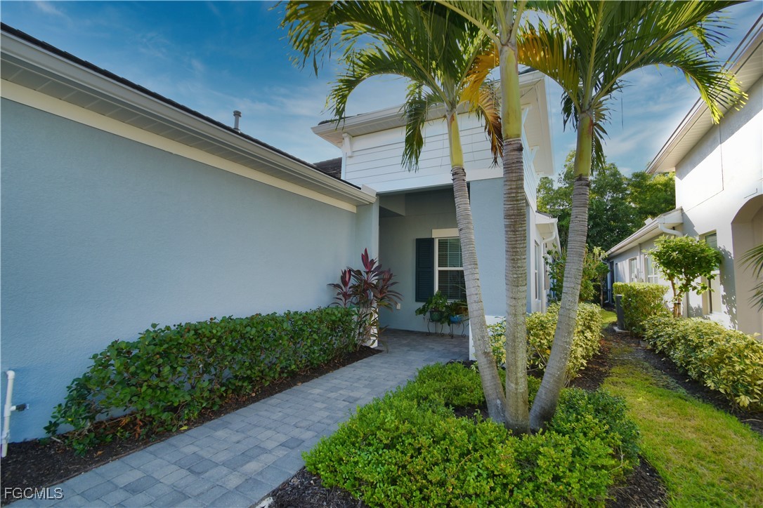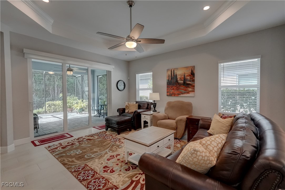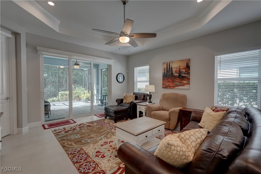 Welcome to this lovely 2 bedroom 2 bath plus den villa in the centrally located community of Windsong. This charming TideWinds villa was built in 2020 by Neal Communities and is thoughtfully designed to live like a single family home affording all the conveniences and upgrades you desire. Gently lived in since 2020 the home is still like new! The open concept design flows naturally from the moment you enter and the split bedroom plan plus the den affords privacy for you and any guests. The sliding doors to the lanai have custom Hunter Douglas remote controlled blinds. A gas connection was installed on lanai for ease of outdoor cooking & BBQ. As well, there is a wall mount for your outdoor TV. The home is situated for privacy for you to enjoy your outdoor space on the screened lanai with a view of trees and greenery. The kitchen is a chef's delight with custom white cabinetry, stainless steel appliances, quartz counter tops and a walk-in pantry plus a large island breakfast bar designed with extra molding trim work. Crown molding, tray ceilings, upgraded pendant lights and chandelier add to the elegance and comfort. The master bedroom suite has ample closet space and a lovely bathroom with private water closet, step in shower and separate sink vanities. The laundry room has extra storage space and also a separate wash basin vanity with washer & dryer included. Comforting to know is that all windows and doors are impact resistant and there is a gas driven whole house full-time stand-by generator. Included also is a monitored security system. In the two car garage you'll see that the garage floor is epoxy painted and is home to the whole house water filtration system. This central location in Ft Myers provides easy access to RSW Airport and I-75, shopping, Sanibel Island & the beaches. Your choice of dining, theaters, entertainment, schools, churches and new venues popping up everywhere will be a convenience and delight for living at Windsong in SW Florida!