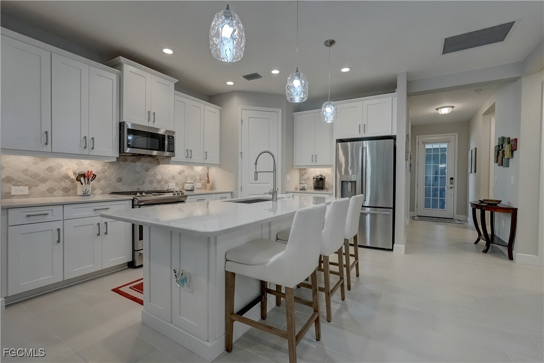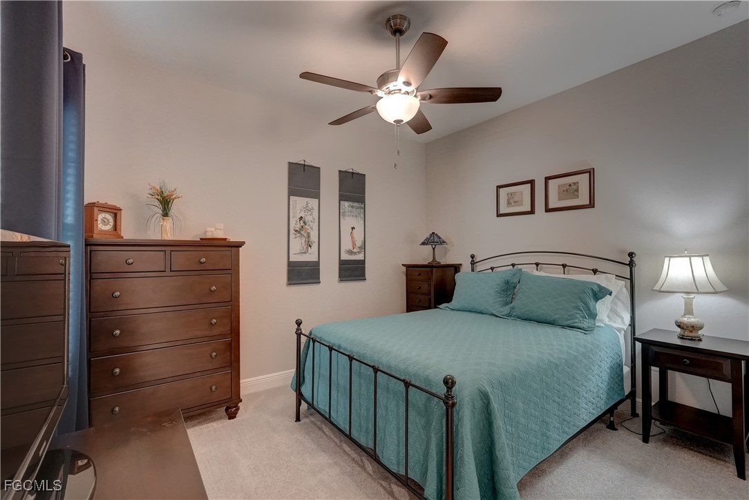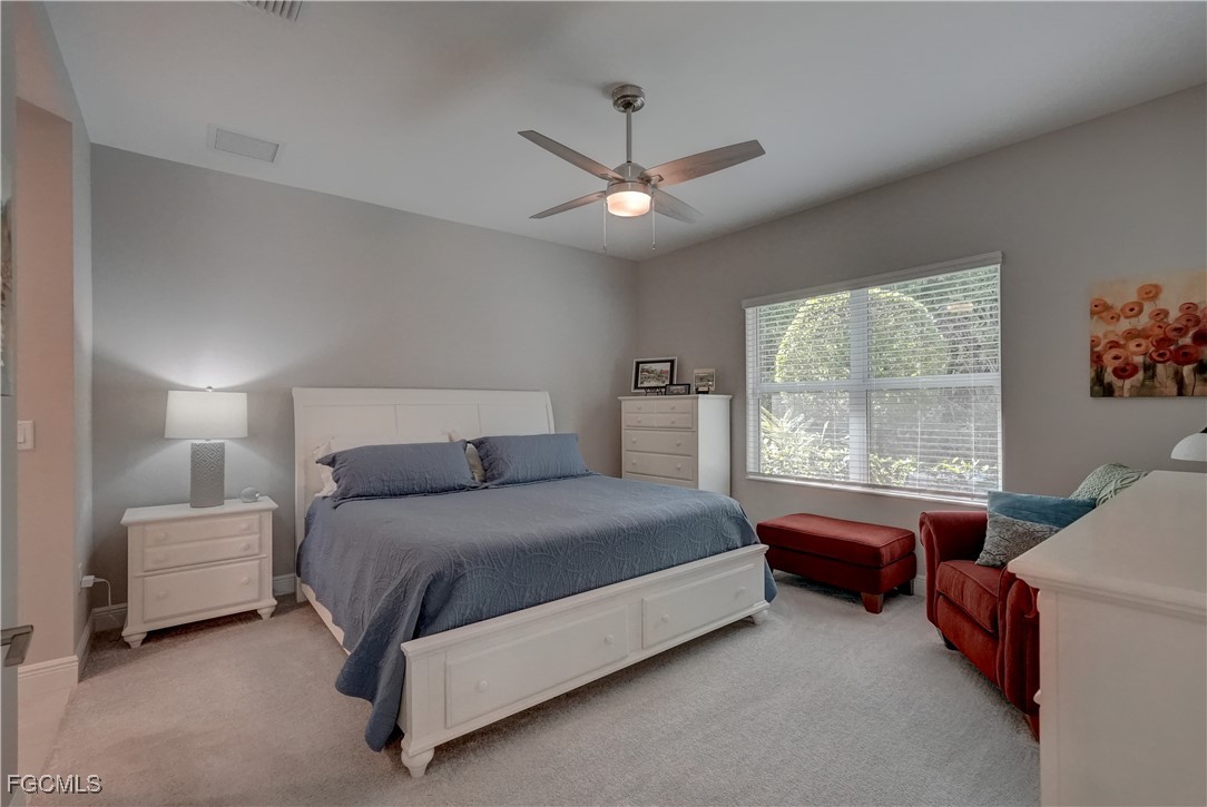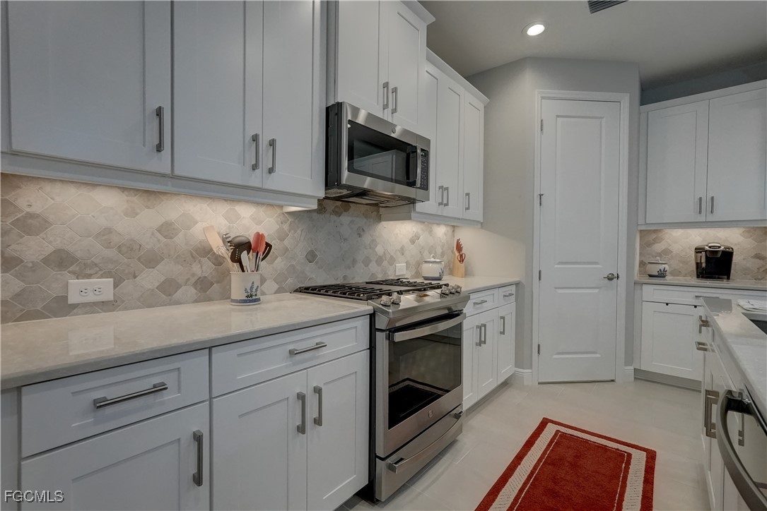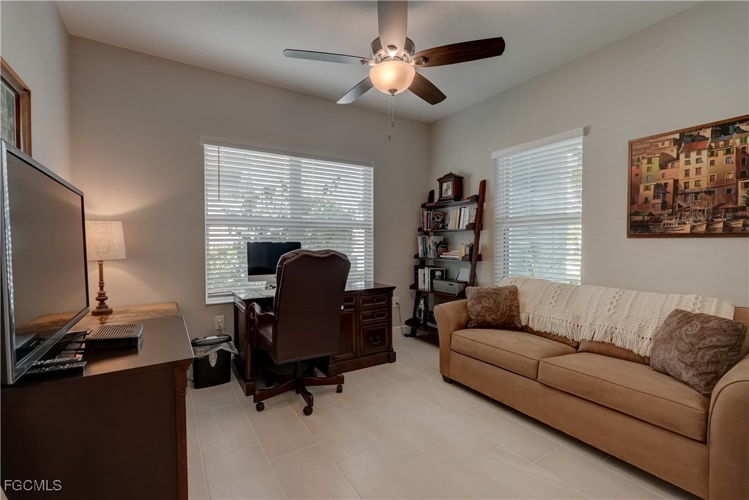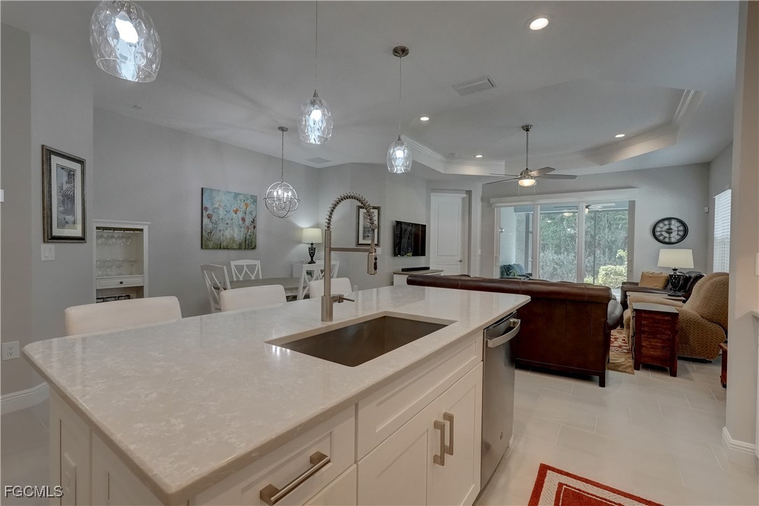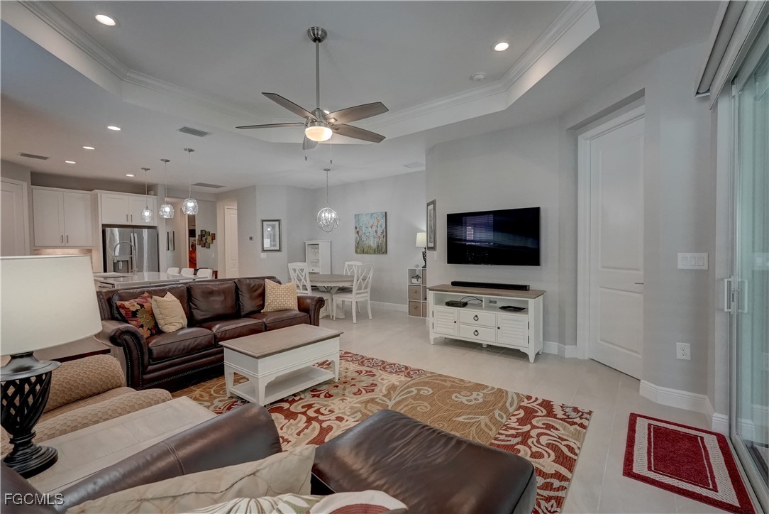 Welcome to this lovely 2 bedroom 2 bath plus den villa in the centrally located community of Windsong. This charming TideWinds villa was built in 2020 by Neal Communities and is thoughtfully designed to live like a single family home affording all the conveniences and upgrades you desire. Gently lived in since 2020 the home is still like new! The open concept design flows naturally from the moment you enter and the split bedroom plan plus the den affords privacy for you and any guests. The sliding doors to the lanai have custom Hunter Douglas remote controlled blinds. A gas connection was installed on lanai for ease of outdoor cooking & BBQ. As well, there is a wall mount for your outdoor TV. The home is situated for privacy for you to enjoy your outdoor space on the screened lanai with a view of trees and greenery. The kitchen is a chef's delight with custom white cabinetry, stainless steel appliances, quartz counter tops and a walk-in pantry plus a large island breakfast bar designed with extra molding trim work. Crown molding, tray ceilings, upgraded pendant lights and chandelier add to the elegance and comfort. The master bedroom suite has ample closet space and a lovely bathroom with private water closet, step in shower and separate sink vanities. The laundry room has extra storage space and also a separate wash basin vanity with washer & dryer included. Comforting to know is that all windows and doors are impact resistant and there is a gas driven whole house full-time stand-by generator. Included also is a monitored security system. In the two car garage you'll see that the garage floor is epoxy painted and is home to the whole house water filtration system. This central location in Ft Myers provides easy access to RSW Airport and I-75, shopping, Sanibel Island & the beaches. Your choice of dining, theaters, entertainment, schools, churches and new venues popping up everywhere will be a convenience and delight for living at Windsong in SW Florida!