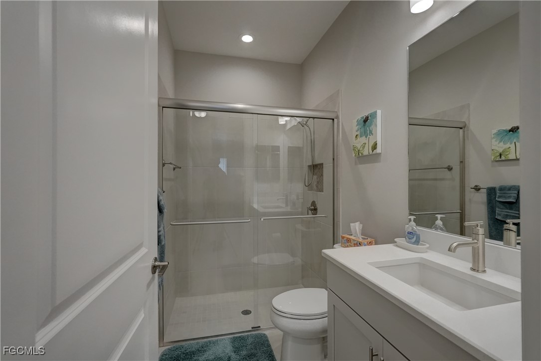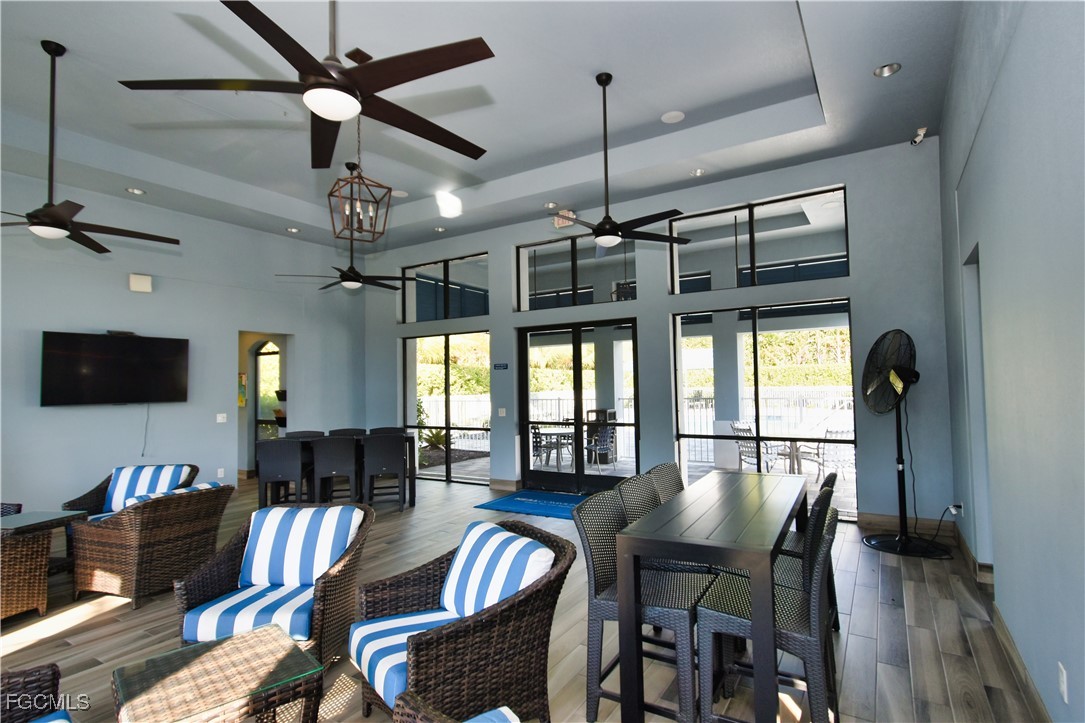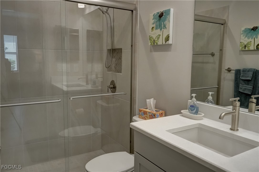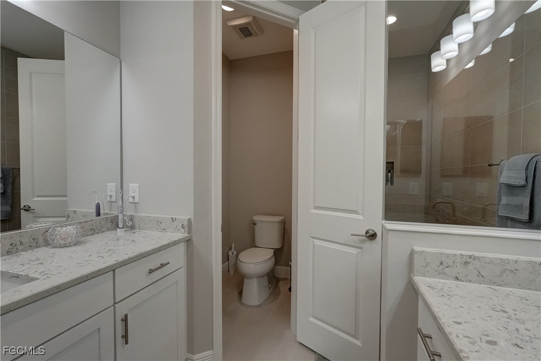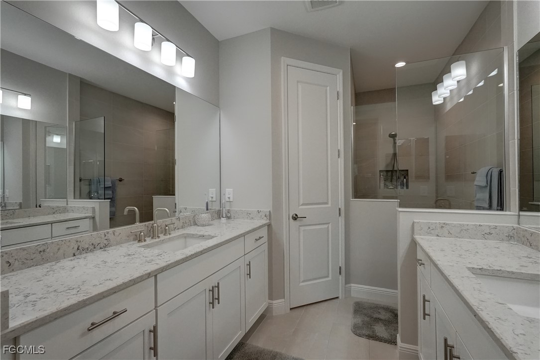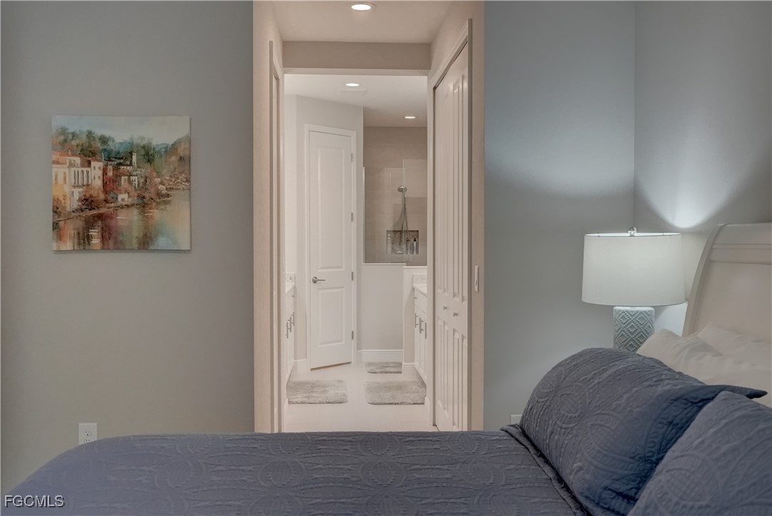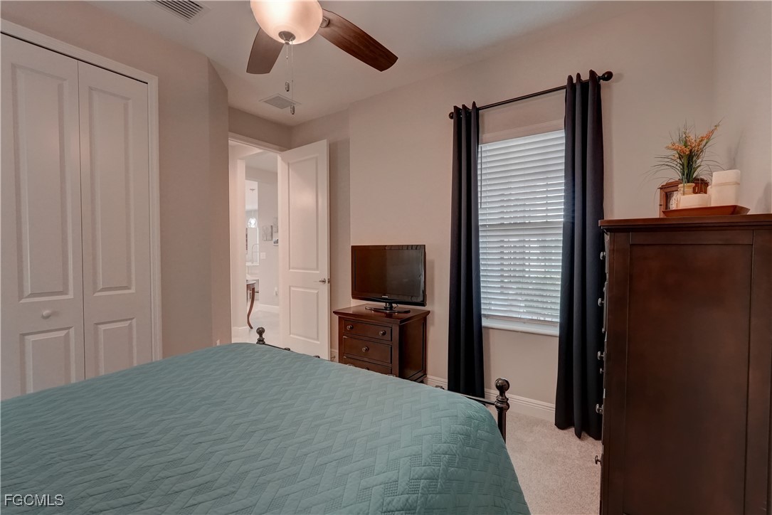Welcome to this lovely 2 bedroom 2 bath plus den villa in the centrally located community of Windsong. This charming TideWinds villa was built in 2020 by Neal Communities and is thoughtfully designed to live like a single family home affording all the conveniences and upgrades you desire. Gently lived in since 2020 the home is still like new! The open concept design flows naturally from the moment you enter and the split bedroom plan plus the den affords privacy for you and any guests. The sliding doors to the lanai have custom Hunter Douglas remote controlled blinds. A gas connection was installed on lanai for ease of outdoor cooking & BBQ. As well, there is a wall mount for your outdoor TV. The home is situated for privacy for you to enjoy your outdoor space on the screened lanai with a view of trees and greenery. The kitchen is a chef's delight with custom white cabinetry, stainless steel appliances, quartz counter tops and a walk-in pantry plus a large island breakfast bar designed with extra molding trim work. Crown molding, tray ceilings, upgraded pendant lights and chandelier add to the elegance and comfort. The master bedroom suite has ample closet space and a lovely bathroom with private water closet, step in shower and separate sink vanities. The laundry room has extra storage space and also a separate wash basin vanity with washer & dryer included. Comforting to know is that all windows and doors are impact resistant and there is a gas driven whole house full-time stand-by generator. Included also is a monitored security system. In the two car garage you'll see that the garage floor is epoxy painted and is home to the whole house water filtration system. This central location in Ft Myers provides easy access to RSW Airport and I-75, shopping, Sanibel Island & the beaches. Your choice of dining, theaters, entertainment, schools, churches and new venues popping up everywhere will be a convenience and delight for living at Windsong in SW Florida!