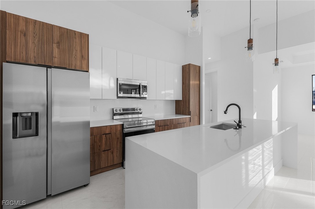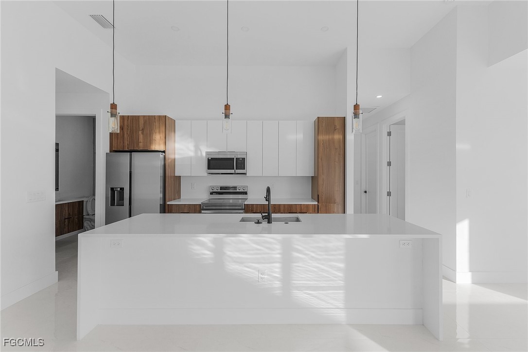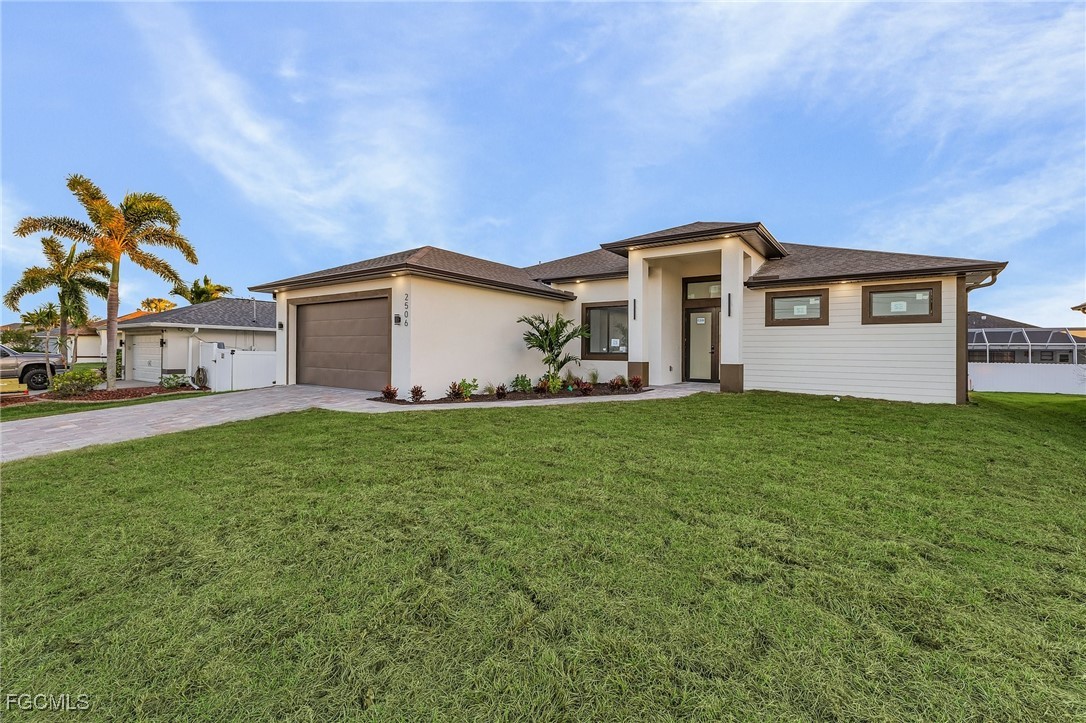 LOCATION LOCATION! Stunning new construction home featuring 4 spacious bedrooms and 3 elegant bathrooms, showcasing modern finishes and exceptional craftsmanship throughout. The open floor plan is designed for both comfort and style, with high ceilings, sleek flooring, and large impact-resistant windows that fill the home with natural light. The gourmet kitchen boasts quartz countertops, soft-close cabinetry, and stainless steel appliances, perfect for entertaining or family living. The master suite offers a luxurious retreat with a spa-inspired bathroom and ample closet space. Located in a prime area of Cape Coral, this home combines contemporary design with everyday functionality—truly a must-see.