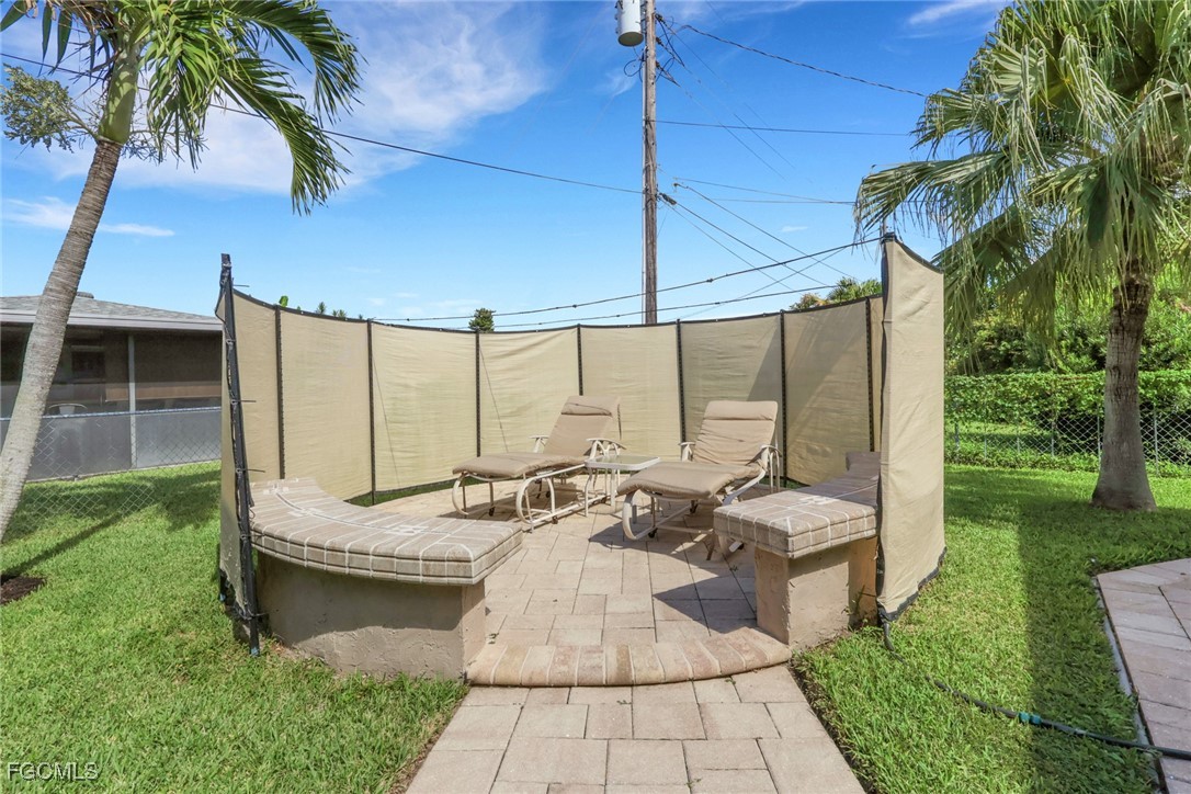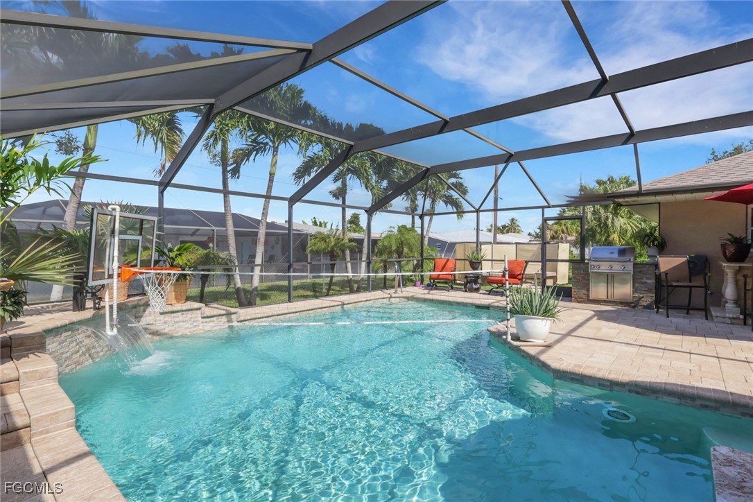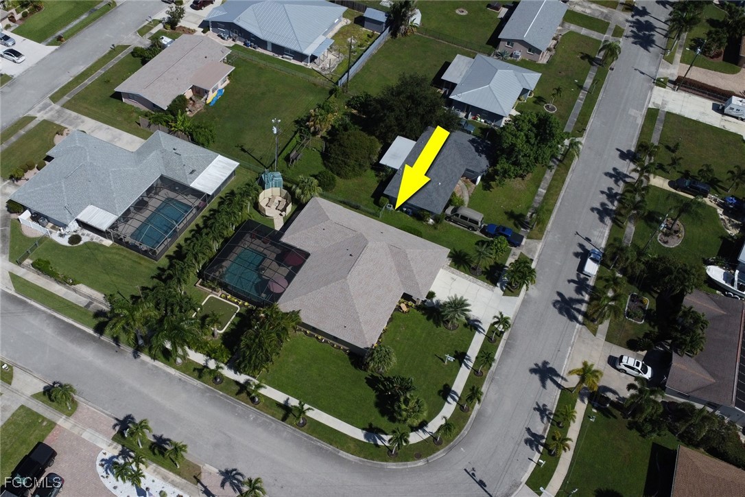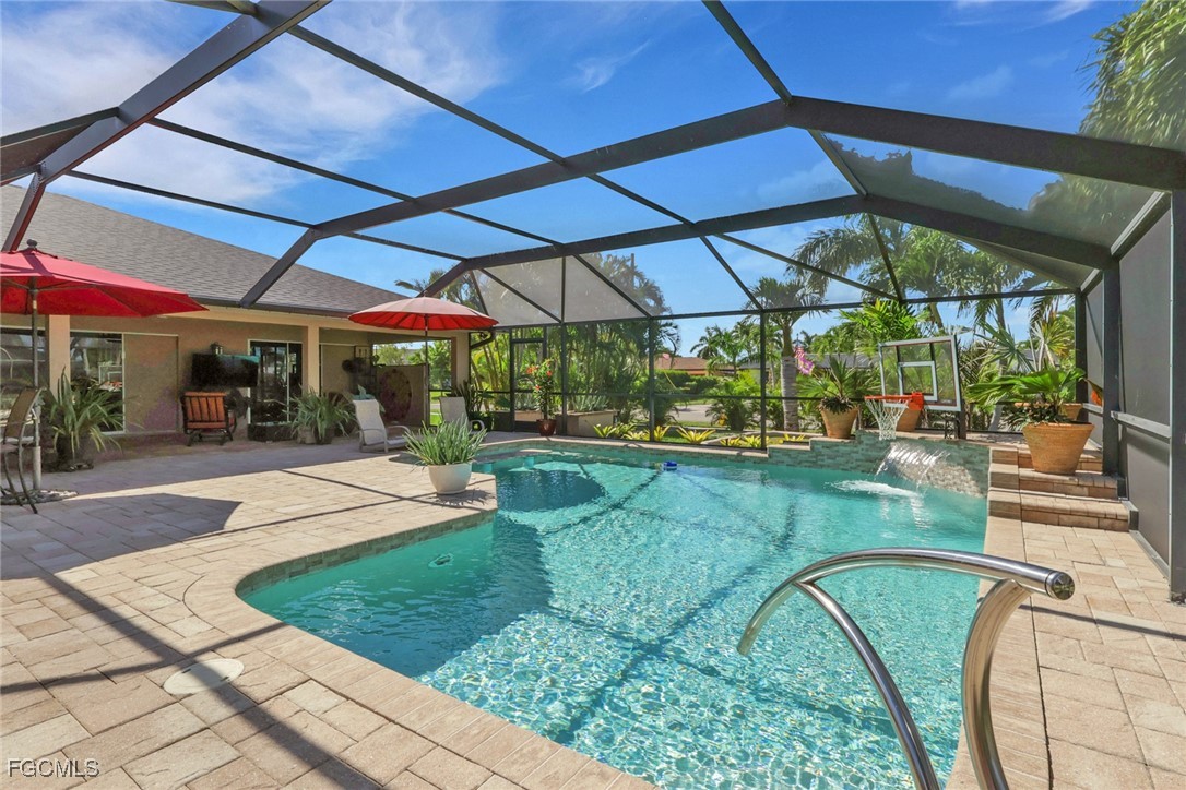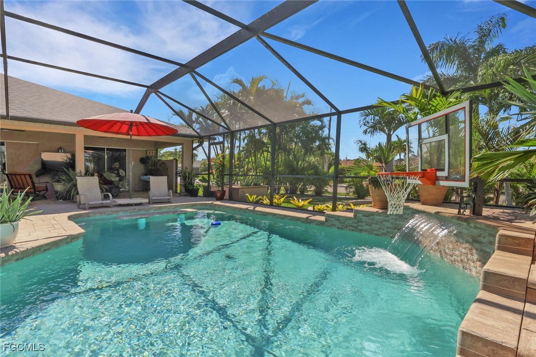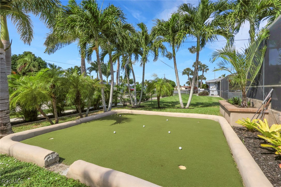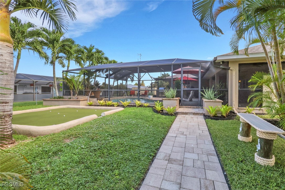 Look no further—this stunning home has it all. Situated on an oversized corner lot in the desirable Waterway Estates community, this property offers the ultimate Florida lifestyle. Pride of ownership shines throughout, as the home has been meticulously maintained and thoughtfully updated. The lushly landscaped yard is a true tropical oasis, featuring dozens of beautiful palm trees that create a private, resort-like atmosphere. The outdoor entertaining area is truly one of a kind, boasting a custom-built saltwater pool complete with a swim-up bar top, a regulation-sized basketball hoop, and a volleyball net—perfect for hosting unforgettable gatherings or enjoying fun in the sun. The space also includes an oversized pavered lanai with a granite-topped bar, your very own putting green, and a paved area in the backyard ideal for a fire pit or sunbathing. The driveway has been widened on both sides, providing ample space for parking and easy access. Inside, the home is in pristine condition and features three bedrooms, two bathrooms, a two-car garage, and a new shingle roof. The solid oak kitchen cabinets and beautiful tile flooring throughout add warmth and elegance. Enjoy both a formal living room and a large family room, perfect for entertaining or relaxing. All city assessments are paid in full, and the sprinkler system runs off the well for low-cost maintenance. Located in a quiet, well-regarded neighborhood with sidewalks and streetlights, this home is just a short walk or bike ride to golf courses, marinas, and the Publix shopping center. Truly move-in ready—just unpack and start living the Florida dream!