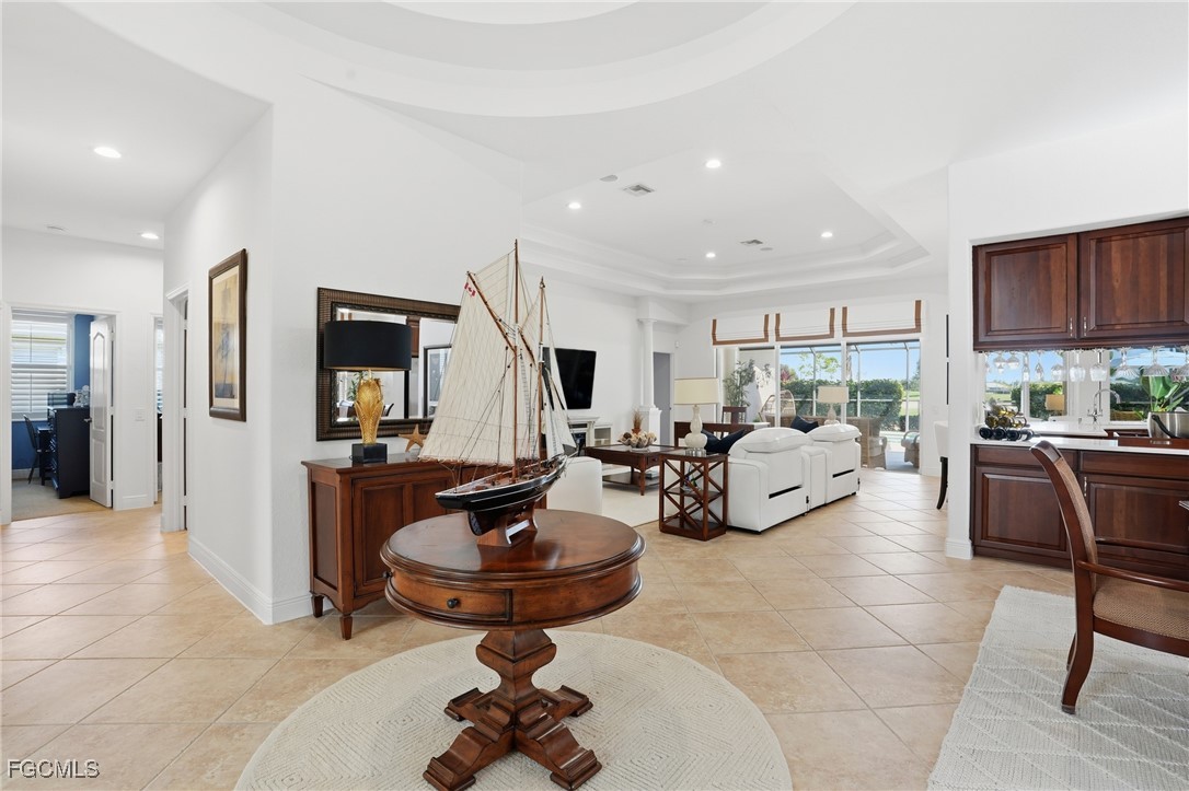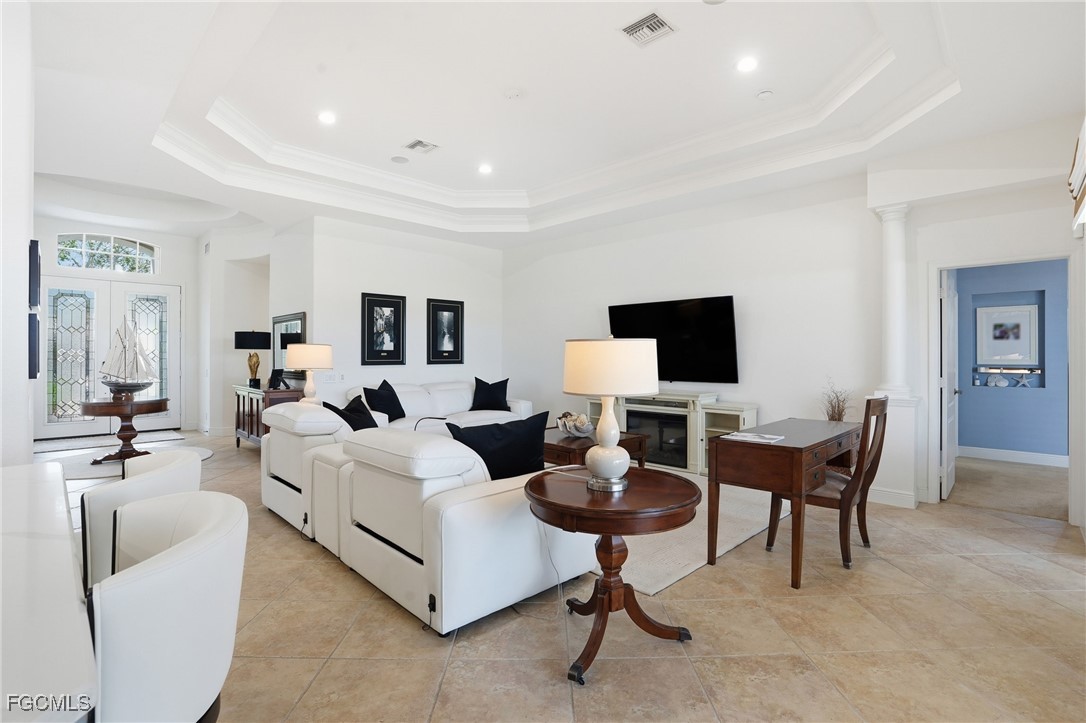 Enjoy stunning golf course views from this turnkey 70’ lot Country Club pool home overlooking the Hole #3 Green. Offered fully furnished with a golf cart and a one-year home warranty, this beautifully maintained residence features an open floor plan with quartz countertops, diagonal travertine tile flooring, tray ceilings, crown molding, and bamboo flooring in the den. Additional upgrades include a 2020 tile roof, 2022 AC system, 2019 hot water heater, central vacuum, plantation shutters, custom window treatments, and LED dimmable recessed lighting. The kitchen and laundry feature newer appliances including an air-fryer range, washer and dryer, dishwasher (2022), and Insinkerator disposal (2025). Outdoor living shines with a sparkling pool, new pump and actuators (Jandy 2022), and an auto-fill system. Added peace of mind with an FP&L whole-home surge protector and ADT security system with cameras. Located in the desirable River Hall Country Club, residents enjoy a Davis Love III Championship Golf Course, resort-style lagoon pool, fitness center, pickleball, tennis, bocce, on-site dining, and a vibrant social calendar—all within minutes of shopping, dining, I-75, and downtown Fort Myers.