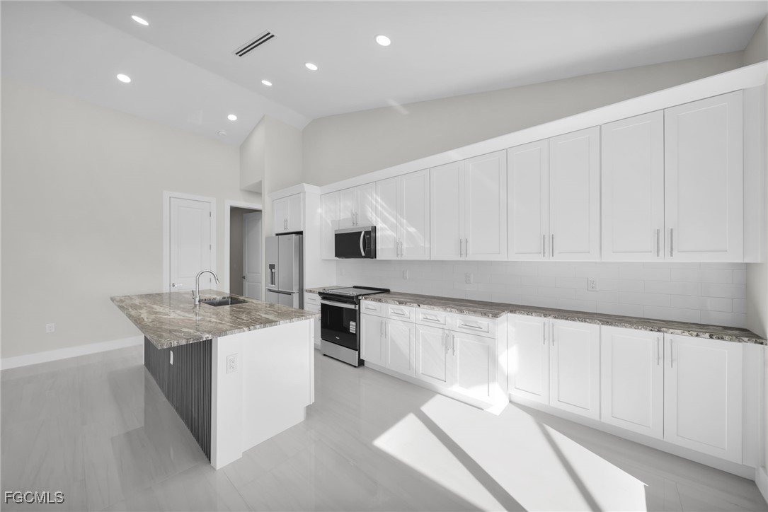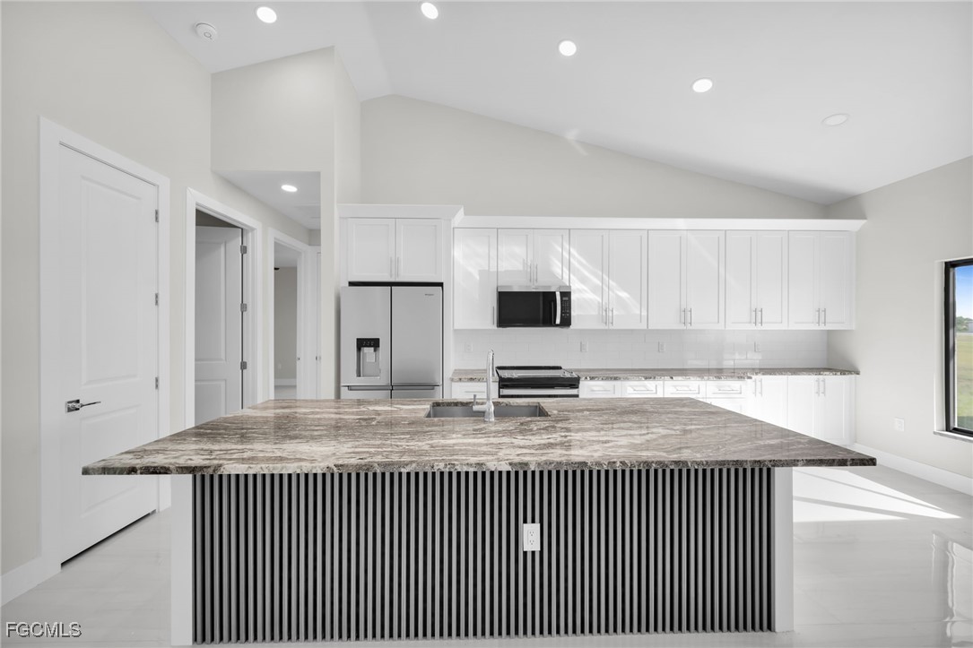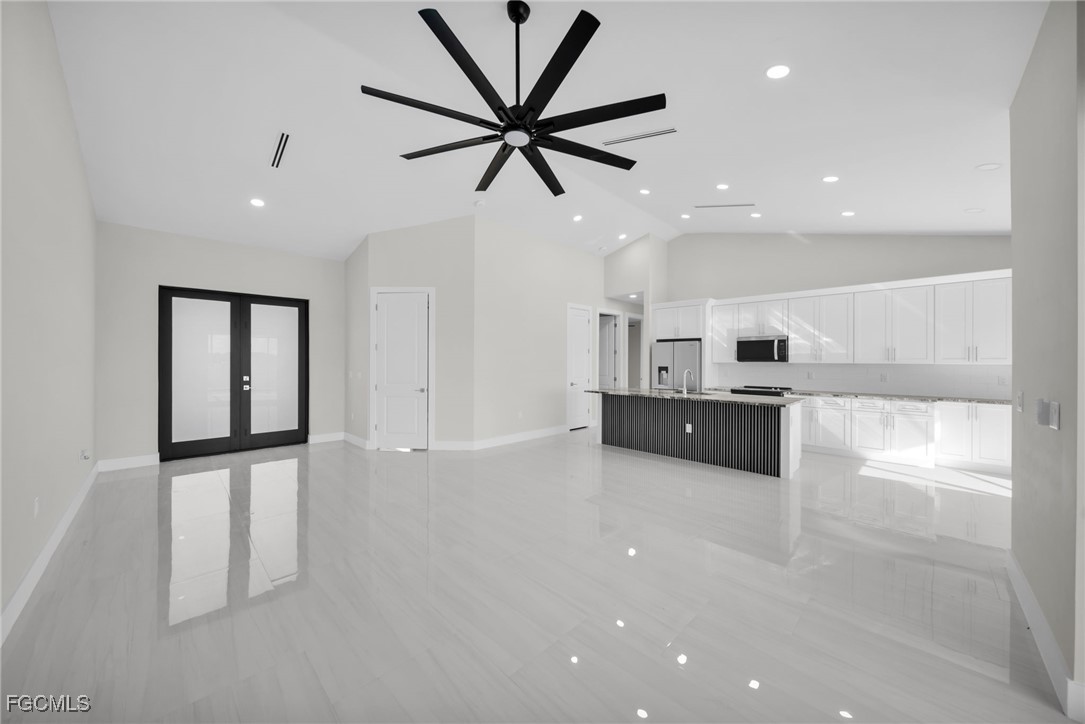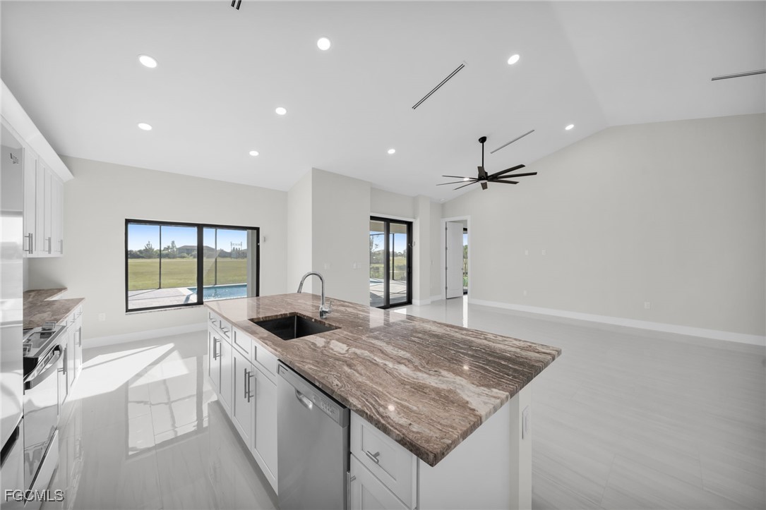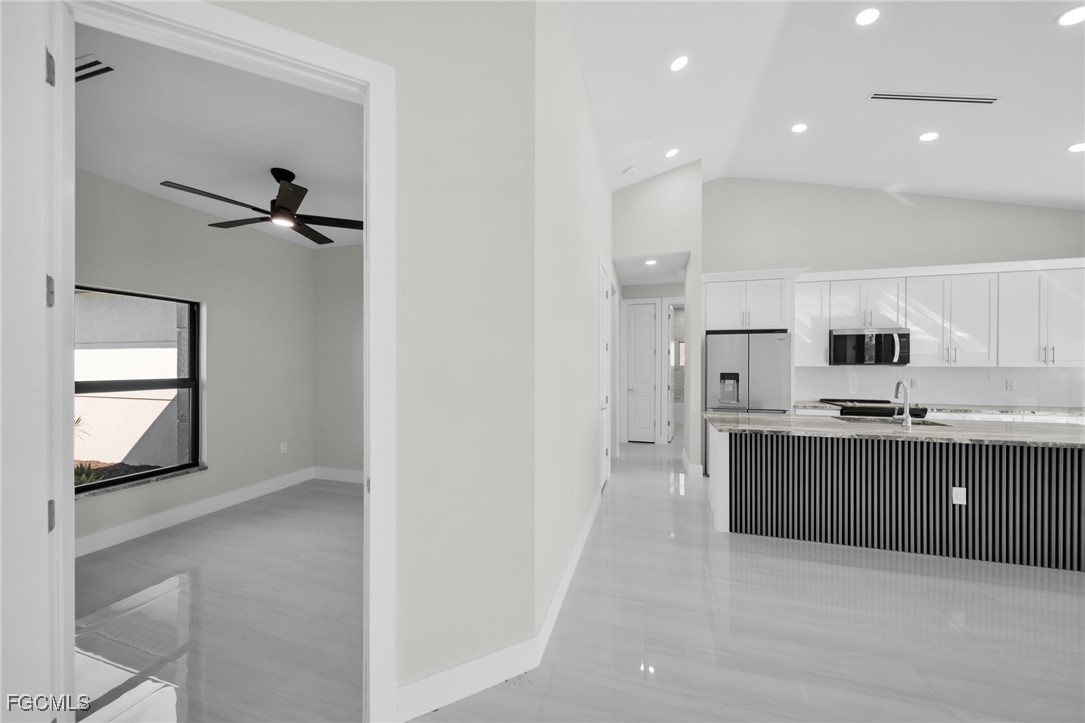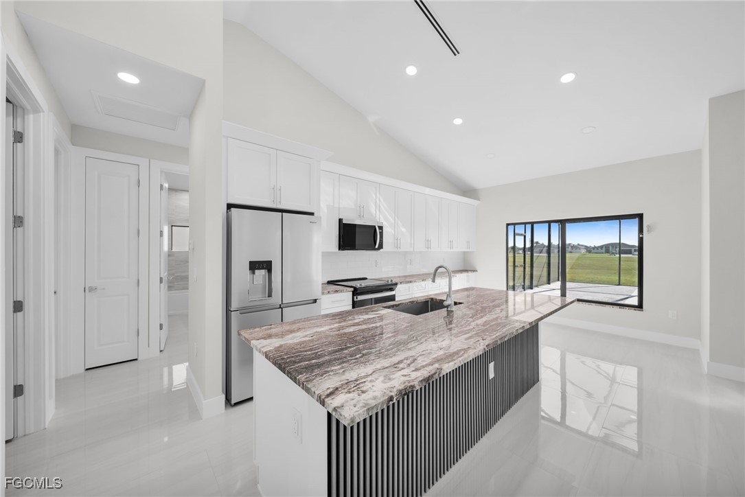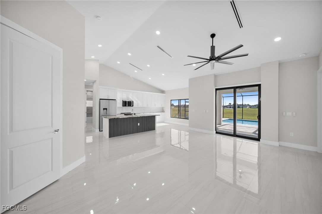 BEST PRICED NEW CONSTRUCTION WATERFRONT HOME IN CAPE CORAL! WITH SEAWALL! Experience luxury coastal living in this stunning 2025 new construction home featuring 3 bedrooms + den, 2 bathrooms, and a 3-car garage. Enjoy 12’ ceilings, 8’ doors, and porcelain tile throughout. The modern kitchen boasts quartz countertops and sleek finishes. Relax in your screened in lanai overlooking the water with a seawall already in place perfect to dock your boat, jet ski, and/or kayaks. The spacious backyard and extra-large driveway offer comfort and convenience. This gorgeous property is located in an amazing neighborhood in the heart of Cape Coral close to schools, shopping, and dining. Builder offering closing costs and 10 year warranty! Washer & Dryer included! This is Florida living at its best—schedule your showing today!