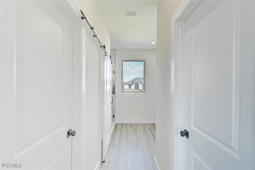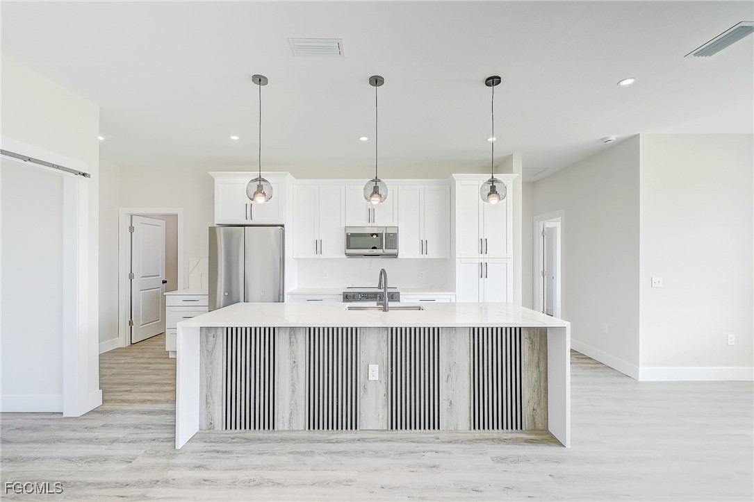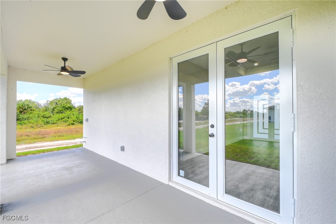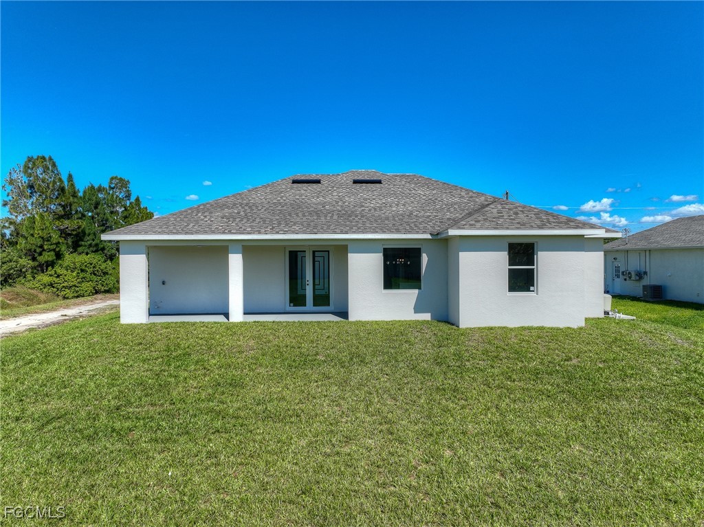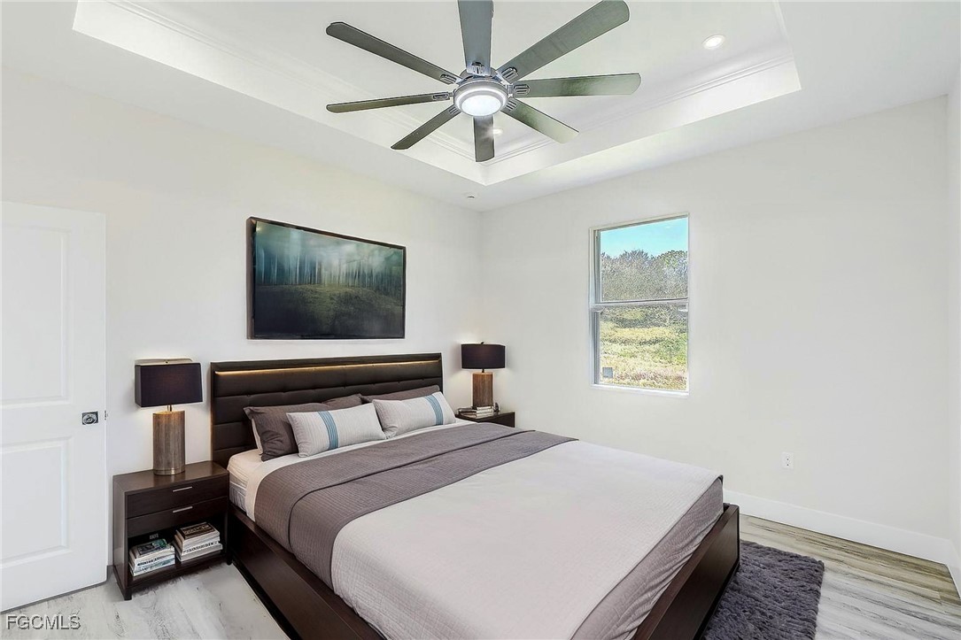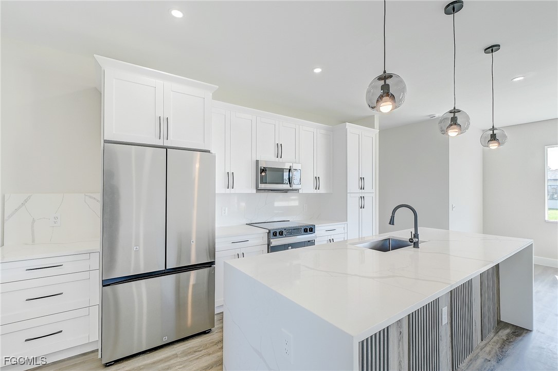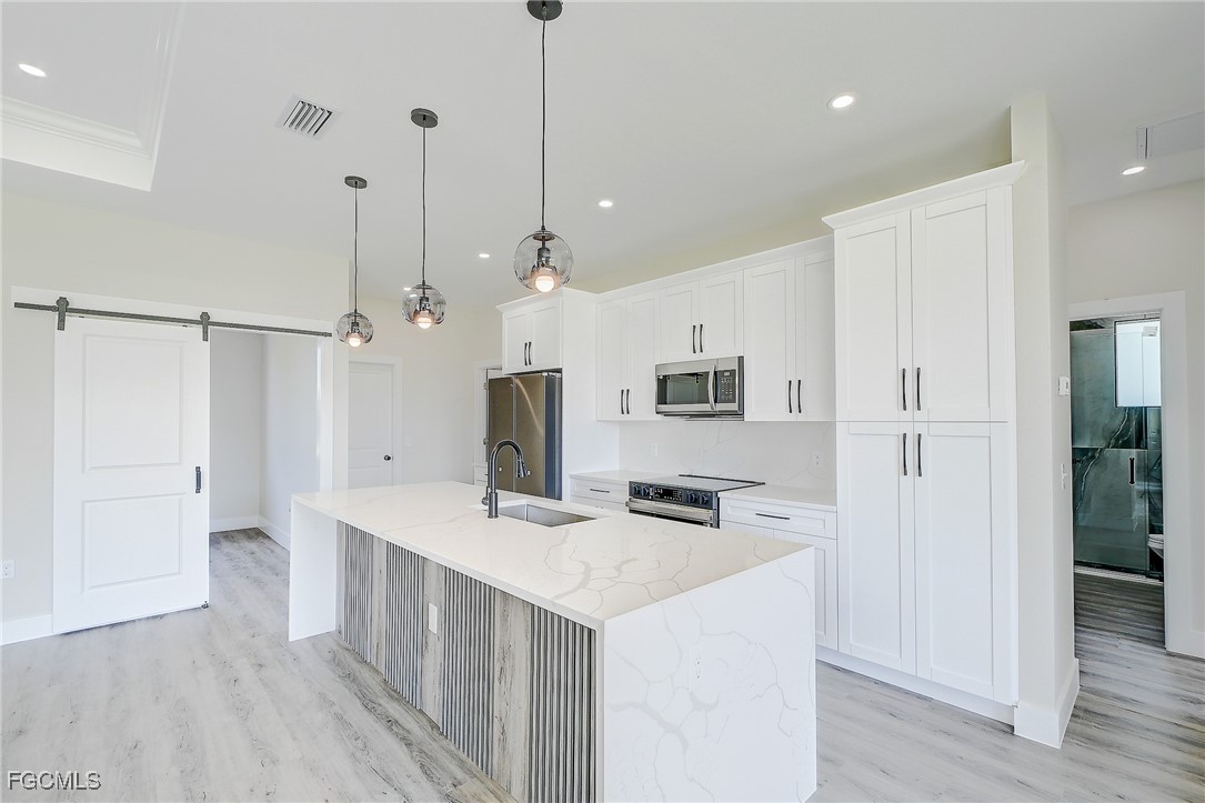 Welcome to this brand-new home situated on a corner lot in a SW Lehigh Acres neighborhood. Offering 3 spacious bedrooms, 1 Den/office, 2 stylish bathrooms, and a meticulously designed living space that perfectly combines modern aesthetics with functionality. The open-concept layout has high tray ceiling and is filled with natural light from the expansive impact-resistant windows and French doors, creating a bright and airy atmosphere. The kitchen is a true standout, featuring sleek quartz countertops and backsplash, a waterfall island with trendy pendant lighting, and premium stainless-steel appliances. Luxury vinyl plank flooring flows throughout, complementing the contemporary design, perfect for entertaining. The master suite is a true retreat, complete with a dual-sink vanity, a spacious walk-in shower with a frameless glass door, and a stylish barn door to the toilet room for privacy. LED-lit mirrors and modern touches enhance the refined space. Enjoy outdoor living year-round on the covered lanai. Additional features include a 2-car garage with a motorized door for easy access and ample storage space. This home offers the perfect blend of comfort, style, and convenience. NO HOA and NO FLOOD INSURANCE. Be the first to call this beautiful, brand-new home yours—schedule your private showing today!. Pictures with furniture are virtually prepared for illustrative purposes only.
