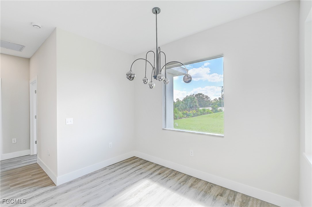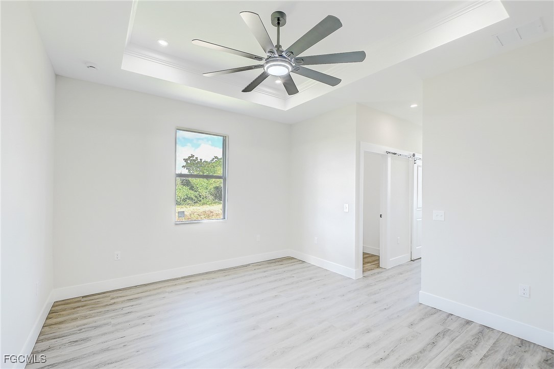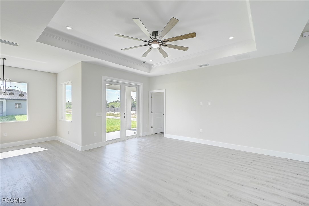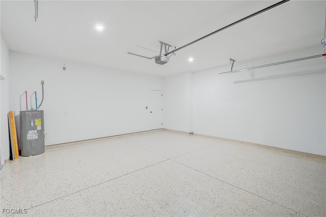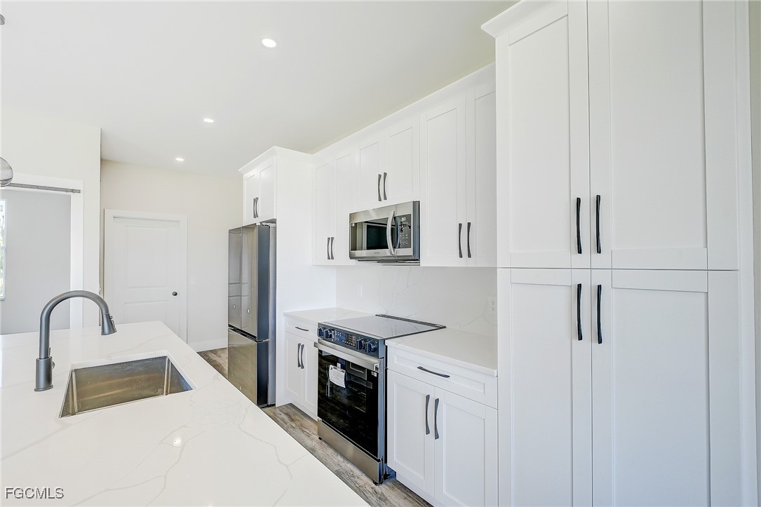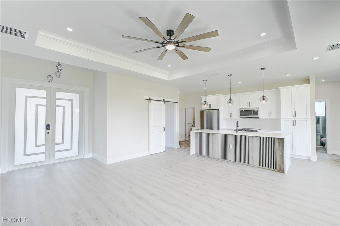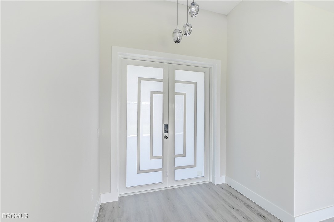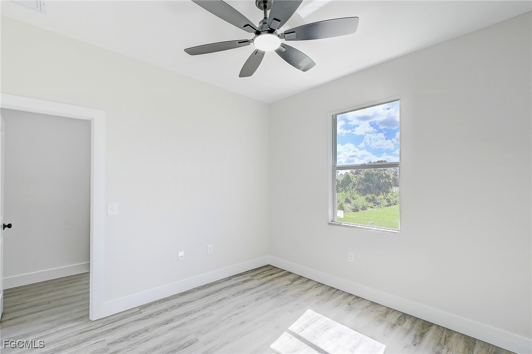 Welcome to this brand-new home situated on a corner lot in a SW Lehigh Acres neighborhood. Offering 3 spacious bedrooms, 1 Den/office, 2 stylish bathrooms, and a meticulously designed living space that perfectly combines modern aesthetics with functionality. The open-concept layout has high tray ceiling and is filled with natural light from the expansive impact-resistant windows and French doors, creating a bright and airy atmosphere. The kitchen is a true standout, featuring sleek quartz countertops and backsplash, a waterfall island with trendy pendant lighting, and premium stainless-steel appliances. Luxury vinyl plank flooring flows throughout, complementing the contemporary design, perfect for entertaining. The master suite is a true retreat, complete with a dual-sink vanity, a spacious walk-in shower with a frameless glass door, and a stylish barn door to the toilet room for privacy. LED-lit mirrors and modern touches enhance the refined space. Enjoy outdoor living year-round on the covered lanai. Additional features include a 2-car garage with a motorized door for easy access and ample storage space. This home offers the perfect blend of comfort, style, and convenience. NO HOA and NO FLOOD INSURANCE. Be the first to call this beautiful, brand-new home yours—schedule your private showing today!. Pictures with furniture are virtually prepared for illustrative purposes only.