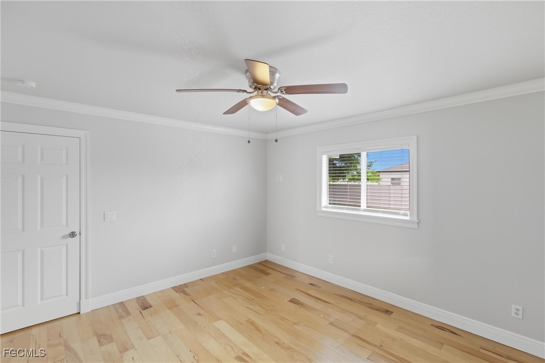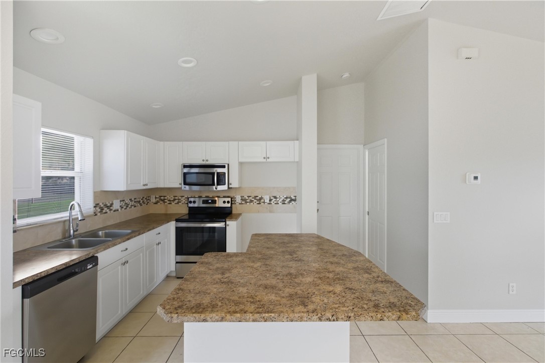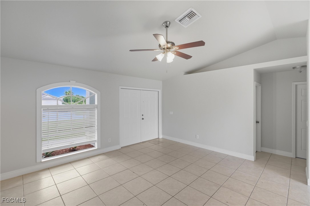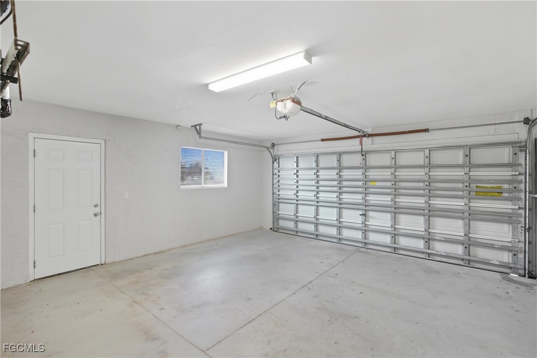 Welcome to this beautifully updated 3 bedroom, 2 bathroom home in the growing Gator Circle area of Cape Coral with 1,226 square feet of comfortable living space and a 2-car garage featuring a reinforced hurricane-rated door, paver expansion pad, and included hurricane shutters. Fresh exterior and interior paint create inviting curb appeal, complemented by front landscaping, gutters, and a high double-door entry. Inside, the great room offers vaulted ceilings, an alcove display niche, tile flooring, a ceiling fan, and a sliding pocket door that opens to the screened lanai, easily extending your indoor-outdoor living space. The open kitchen includes an island, recessed lighting, stainless steel appliances, laminate faux-stone counters, a tile mosaic backsplash, and a built-in pantry cabinet. The primary bedroom features wood flooring, crown molding, a walk-in closet, ceiling fan, and a gorgeous ensuite with a sliding barn-style door, upgraded glass shower door, tile walls, mosaic accents, basketweave flooring, and multiple shower heads. A split floor plan adds privacy, with two guest bedrooms offering luxury vinyl flooring and ceiling fans, plus a hall bath with a new vanity, quartz countertop, and a tub/shower combo with tile surround. Additional conveniences include an indoor laundry room, a 2021 HVAC system, and a 2022 hot water heater. The backyard offers plenty of space to enjoy, complete with a mature shade tree. Located in the desirable Gator Circle section of Cape Coral near new parks, schools, and businesses, this home is also in Flood Zone X—meaning no flood insurance is required. Stylish, efficient, and move-in ready, this home is a fantastic opportunity in a fast-growing area of Cape Coral.