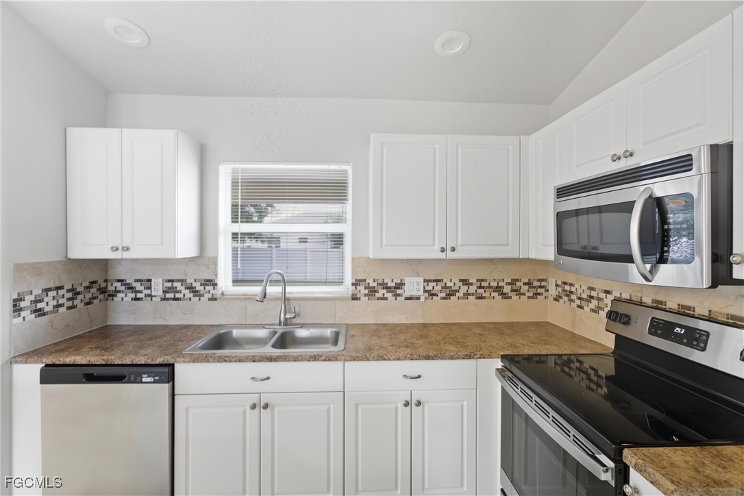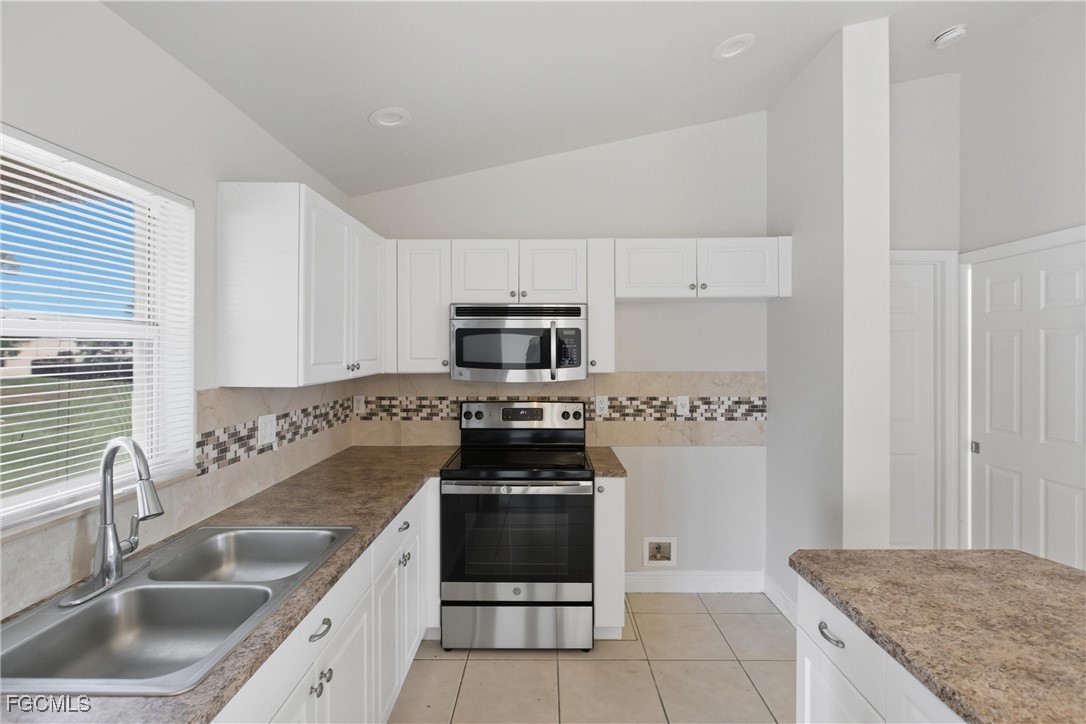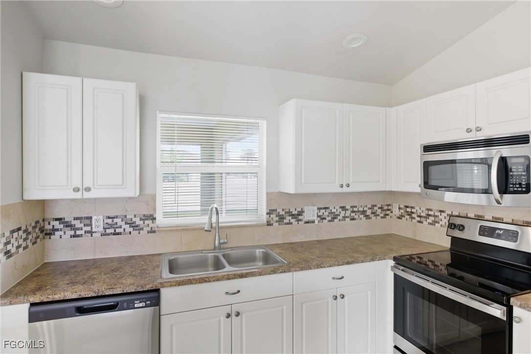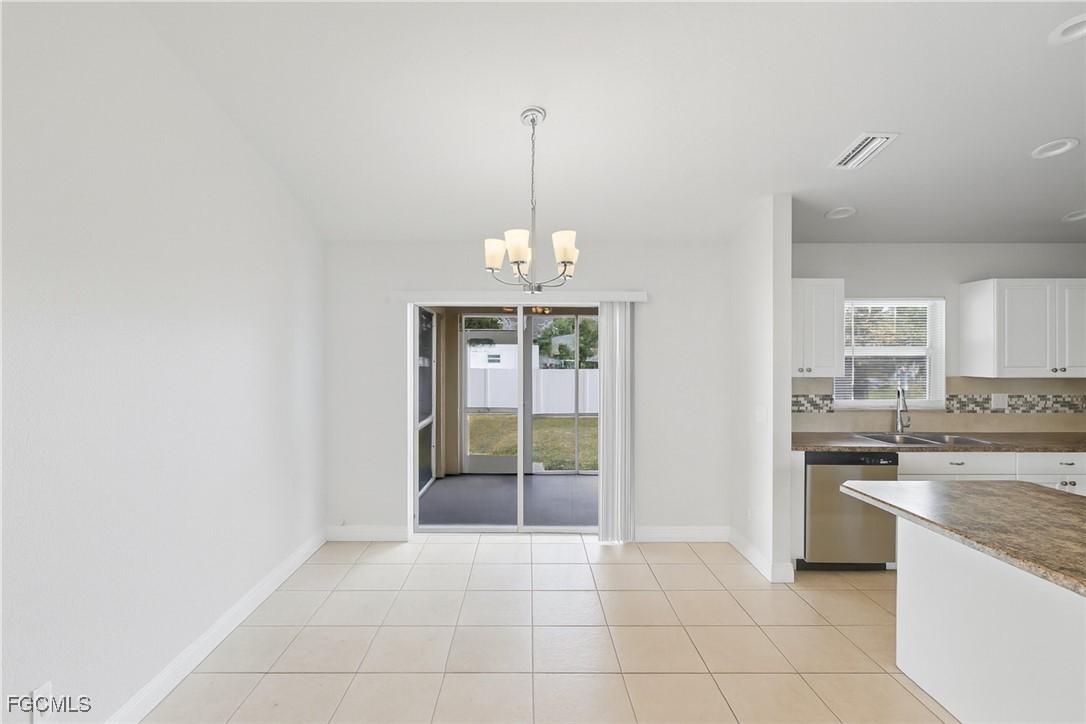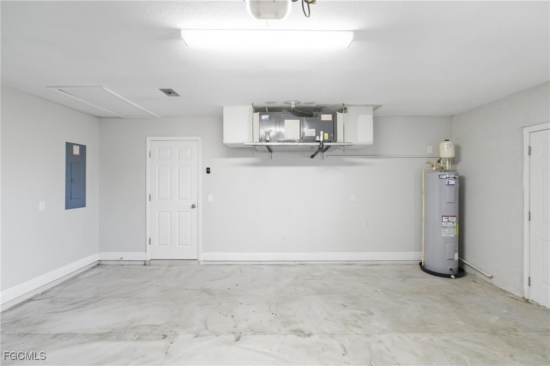 Welcome to this beautifully updated 3 bedroom, 2 bathroom home in the growing Gator Circle area of Cape Coral with 1,226 square feet of comfortable living space and a 2-car garage featuring a reinforced hurricane-rated door, paver expansion pad, and included hurricane shutters. Fresh exterior and interior paint create inviting curb appeal, complemented by front landscaping, gutters, and a high double-door entry. Inside, the great room offers vaulted ceilings, an alcove display niche, tile flooring, a ceiling fan, and a sliding pocket door that opens to the screened lanai, easily extending your indoor-outdoor living space. The open kitchen includes an island, recessed lighting, stainless steel appliances, laminate faux-stone counters, a tile mosaic backsplash, and a built-in pantry cabinet. The primary bedroom features wood flooring, crown molding, a walk-in closet, ceiling fan, and a gorgeous ensuite with a sliding barn-style door, upgraded glass shower door, tile walls, mosaic accents, basketweave flooring, and multiple shower heads. A split floor plan adds privacy, with two guest bedrooms offering luxury vinyl flooring and ceiling fans, plus a hall bath with a new vanity, quartz countertop, and a tub/shower combo with tile surround. Additional conveniences include an indoor laundry room, a 2021 HVAC system, and a 2022 hot water heater. The backyard offers plenty of space to enjoy, complete with a mature shade tree. Located in the desirable Gator Circle section of Cape Coral near new parks, schools, and businesses, this home is also in Flood Zone X—meaning no flood insurance is required. Stylish, efficient, and move-in ready, this home is a fantastic opportunity in a fast-growing area of Cape Coral.