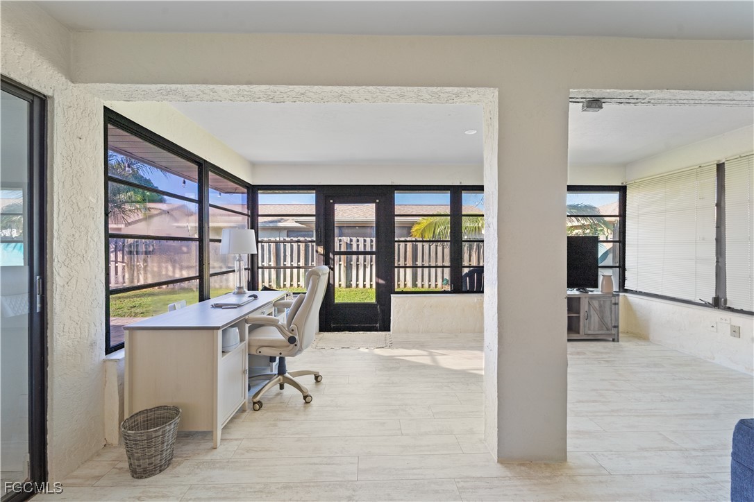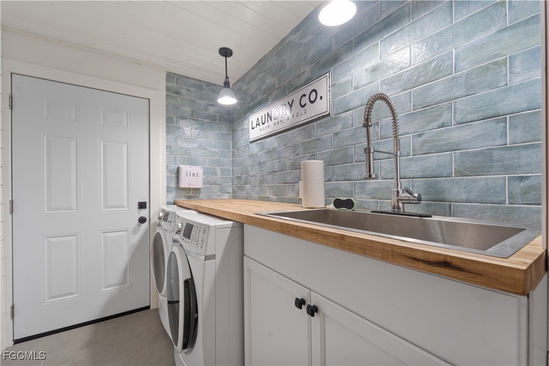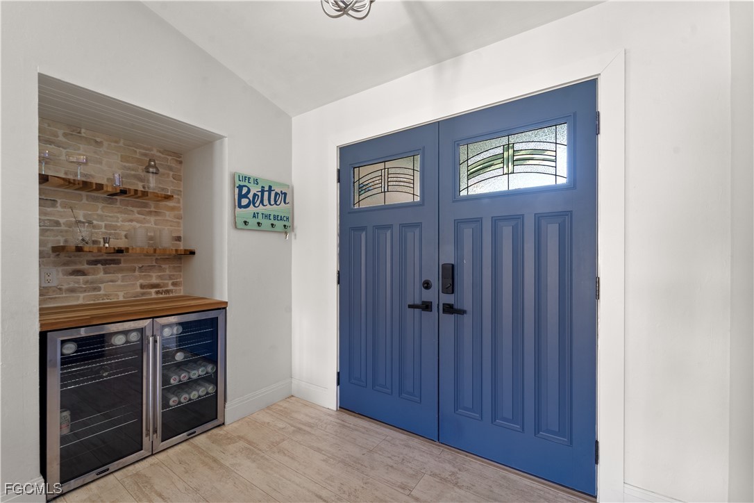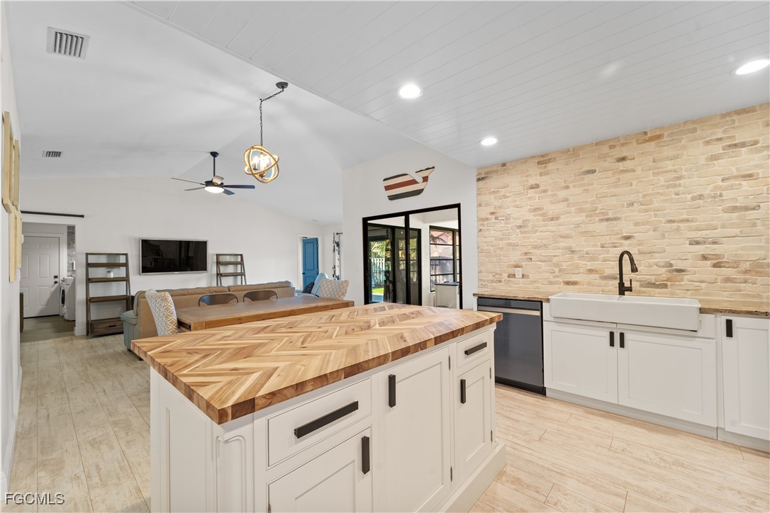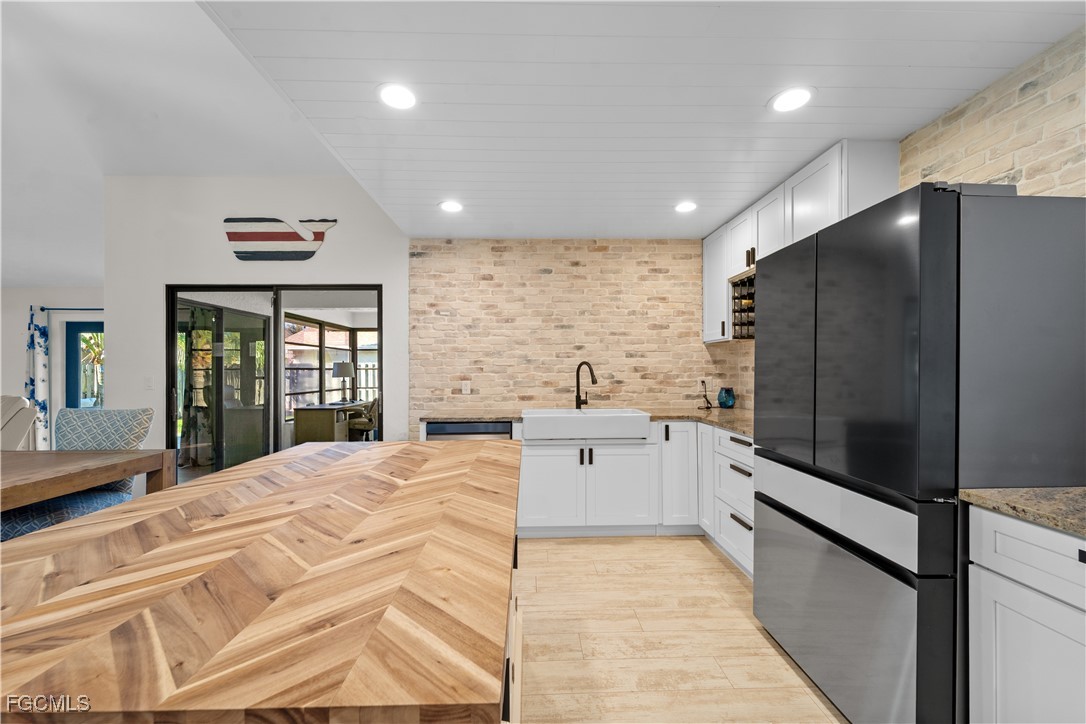 Welcome to 9802 Wildginger Drive, a fully remodeled coastal-inspired 2 bedroom, 2 bathroom home in one of the most convenient and desirable pockets of South Fort Myers. This beautifully upgraded residence offers a bright open-concept layout with vaulted ceilings, custom recessed lighting, and luxury finishes throughout. The heart of the home is the designer kitchen, featuring a wood herringbone butcher-block island, granite countertops, exposed brick backsplash, deep farmhouse sink, Samsung stainless steel appliances, soft-close cabinetry, open shelving, a built-in wine rack, and a dedicated bar area with dual-zone wine cooler. A spacious 288 sq ft sunroom offers additional living and dining space, while the thoughtfully planned 76 sq ft indoor laundry room provides custom cabinetry, counter space, and storage. The primary suite includes a walk-in closet and a stunning spa-style bath with quartz vanity, shiplap detail, niche-tiled walk-in shower, matte black fixtures, and frameless glass enclosure. The guest bath is equally impressive with subway tile, designer flooring, and upgraded finishes. Additional highlights include a 2019 roof, tankless water heater, updated fixtures and lighting throughout, wood-look flooring, and a 2-car garage. Step outside to a fully fenced backyard with an expansive paver patio perfect for grilling, outdoor dining, and relaxing in the Florida sunshine. Located minutes from Fort Myers Beach, Sanibel Island, McGregor Blvd, Gulf Coast Medical Center, and premier shopping and dining at Bell Tower and Coconut Point, this home offers effortless access to parks, boating, golf, and year-round coastal recreation with a very LOW HOA (187/quarterly). HOA Amenities include: LAKEFRONT Community Pool and Clubhouse! Blending modern craftsmanship and coastal charm in a highly convenient location, this move-in-ready home delivers a rare combination of style, function, and lifestyle in the heart of Fort Myers.
