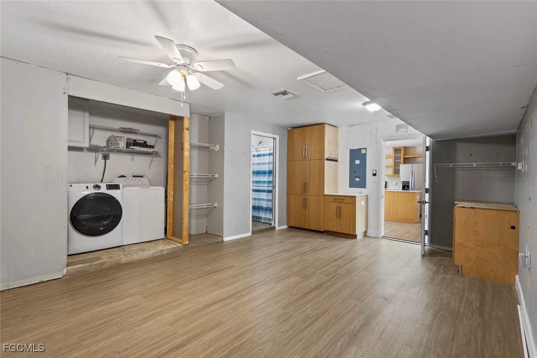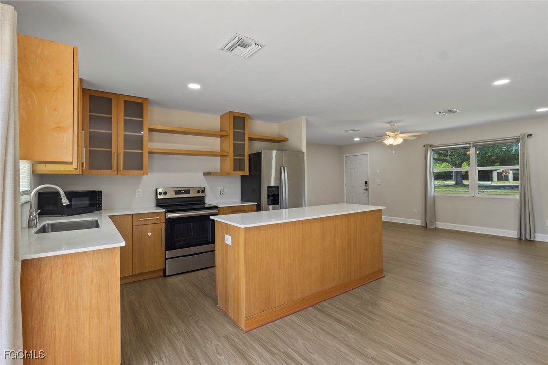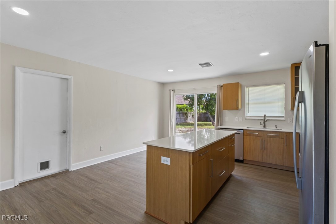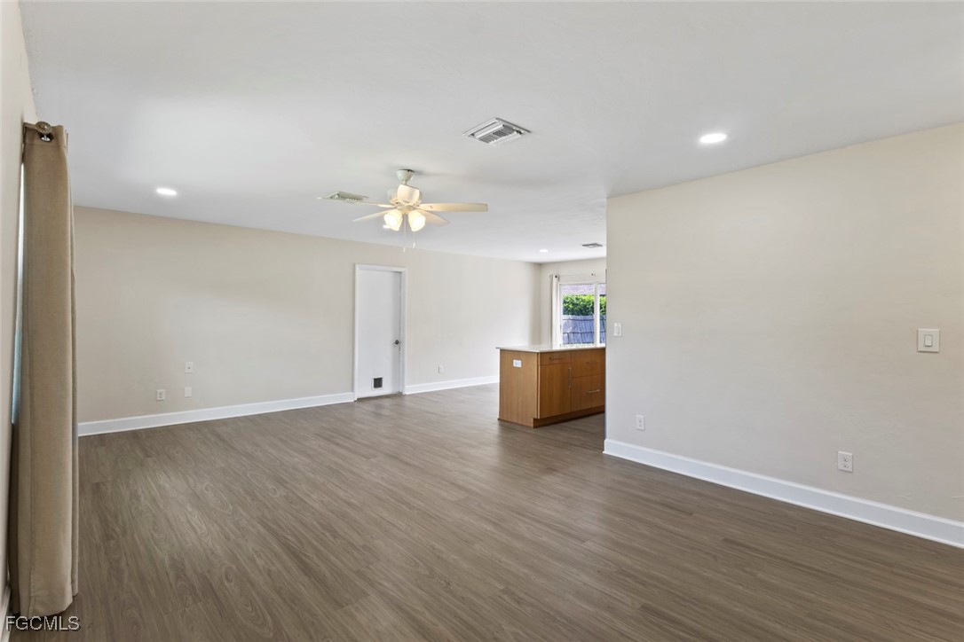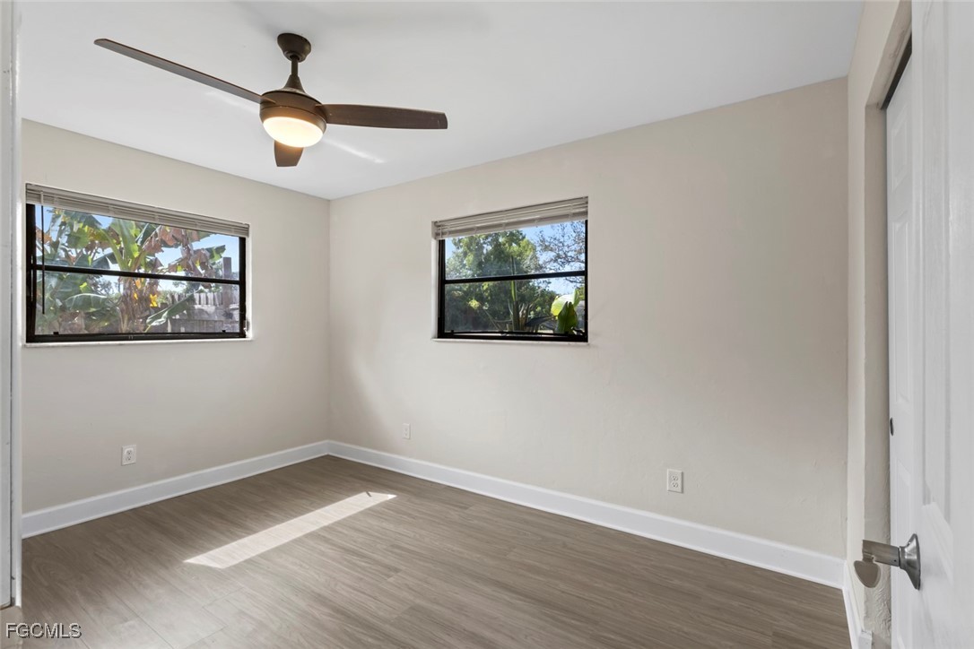Fully updated home on a spacious fenced lot with room for a pool in a desirable non-HOA community. Inside, fresh paint, new baseboards, and sleek vinyl flooring create a clean, modern look. The remodeled kitchen features quartz countertops, contemporary cabinetry, and stainless-steel appliances. The home offers two bedrooms, two full baths, plus a flex room—perfect for guests, a home office, gym, studio, or an additional bedroom. A dedicated laundry area provides extra functionality. Outside, the large fenced yard includes a storage shed and offers space for outdoor living. New roof (2023), no HOA, and no rental restrictions give you rare flexibility. Ideal as a primary residence, investment property, or seasonal retreat. Prime location near shopping, dining, RSW Airport, and I-75.