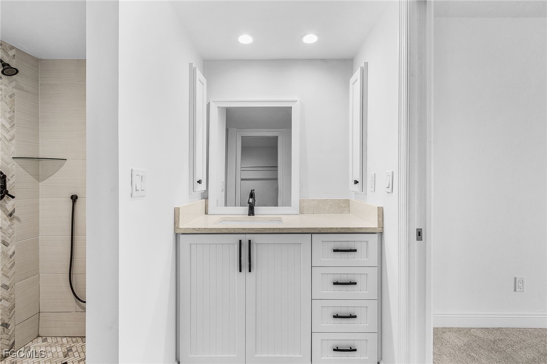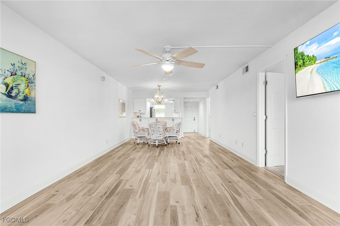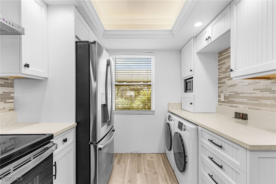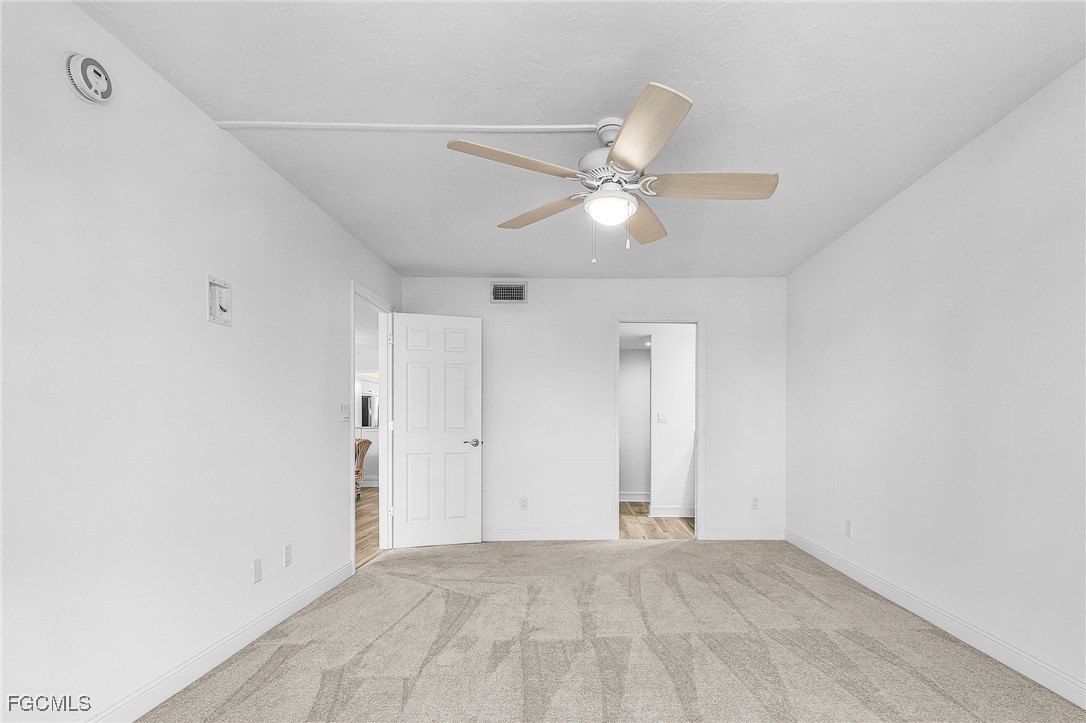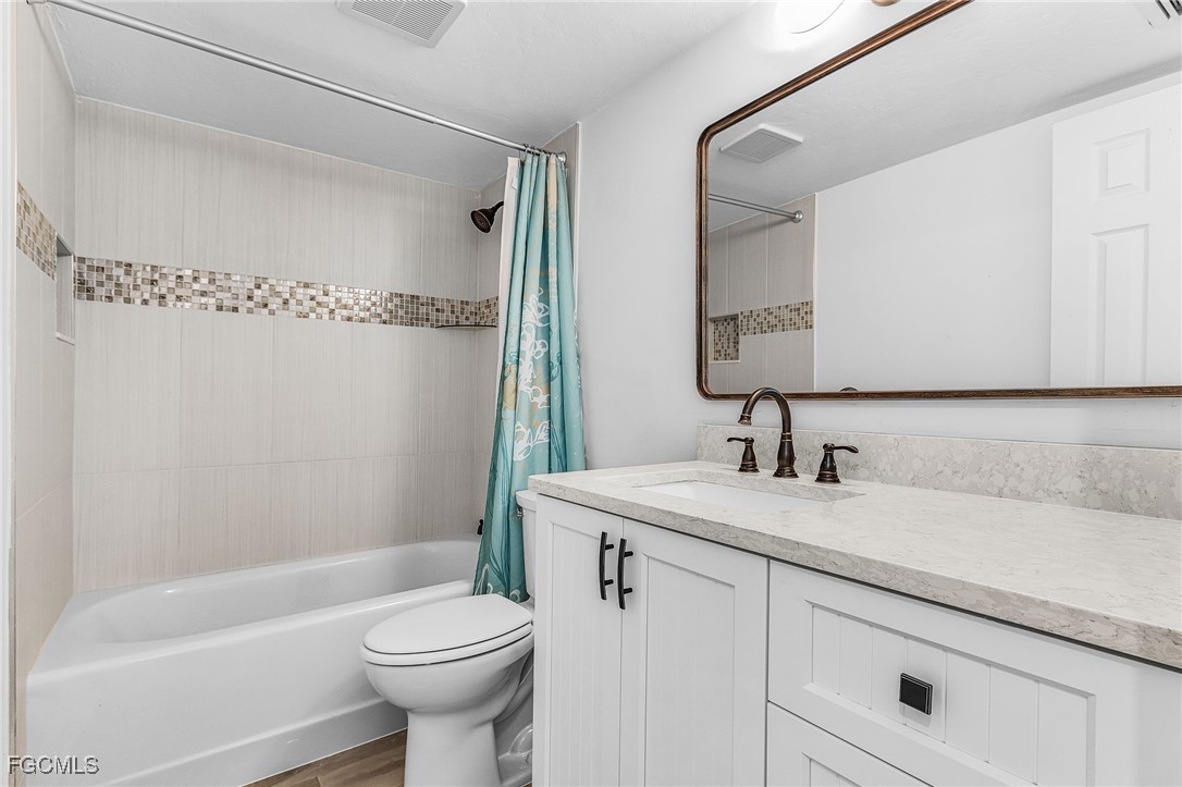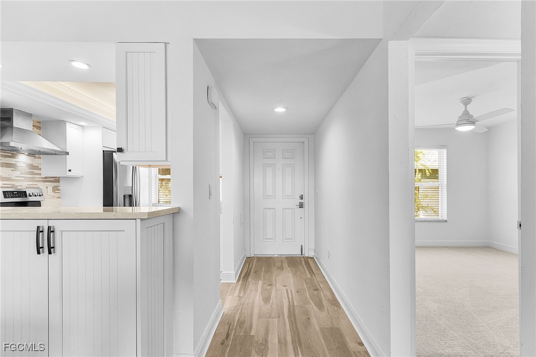 Step inside to find a fully updated interior featuring a modern kitchen with stainless steel appliances, quartz countertops, and crisp white cabinetry. Both bathrooms showcase contemporary vanities and sleek tile backsplashes in the showers. The main living area boasts luxury vinyl plank flooring, while the bedrooms offer brand-new, never-used carpet for comfort.