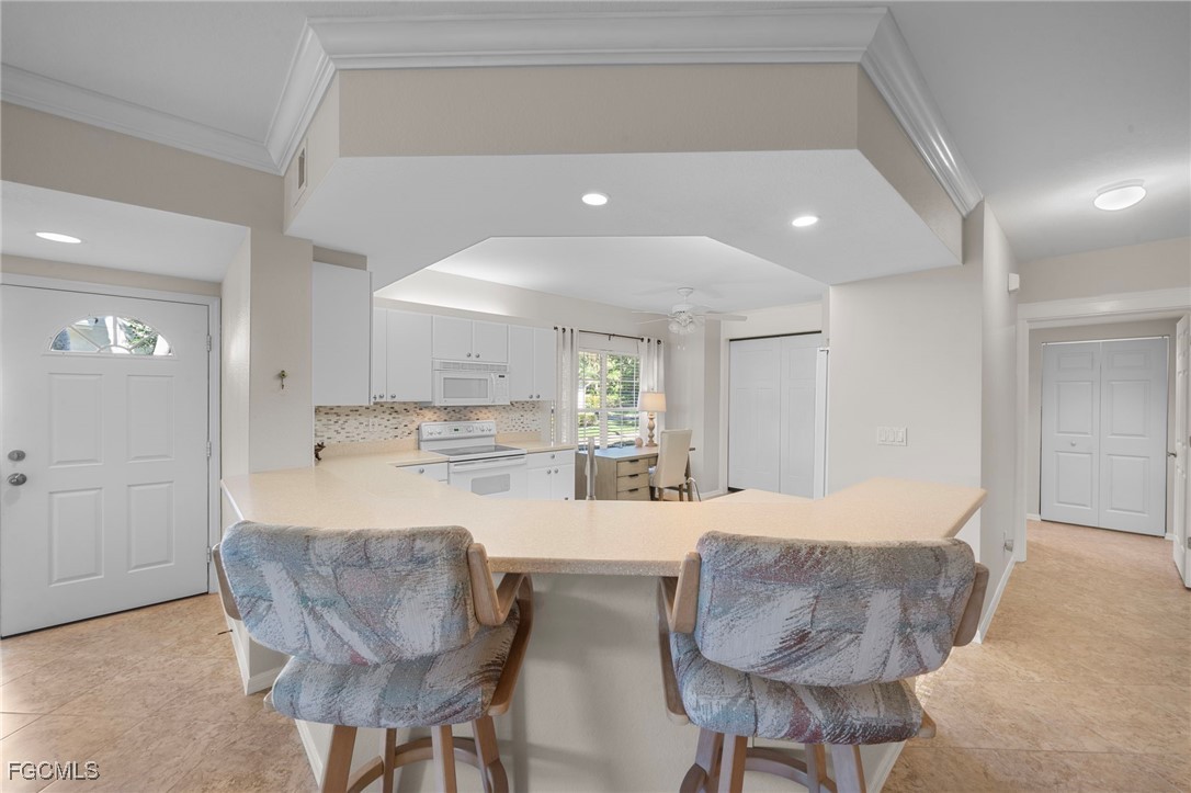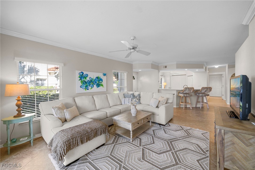 LIGHT AND BRIGHT best describes this first floor condo! 1430 square feet (one of the largest in the community), finished in TASTEFUL, NEUTRAL TONES and featuring CROWN MOLDING, nickel hardware, tile floors with carpeted bedrooms, ceiling fans, plentiful storage and ALL APPLIANCES. Updates include the STORM SCREENS IN 2023, KINETICO PURIFIED WATER SYSTEM and the recently installed BARN DOORS in bedroom 3/den for privacy. Check out the FURNISHINGS THOUGHOUT STAYING WITH THIS UNIT (everything you see!) including the NEW SECTIONAL SLEEPER SOFA with the quality mattress in the great room! MOVE-IN READY. The first floor plan flows and the rooms are all SPACIOUS. The separate dining room is great for entertaining family and friends. The roofs at Lighthouse Bay have been replaced with stone coated steel shingles for long term durability. The community is FRIENDLY and SOCIAL with many planned events and naturally charming with spectacular water and preserve views, green space, and gorgeous bridges! The CLUBHOUSE AND AMENITIES HAVE BEEN REFRESHED and now reflect desirable SOUTHWEST FLORIDA LIVING AT ITS FINEST! The Lighthouse Bay lifestyle offers so many amenities including the Lagoon Pool and Spa, Sun deck, Sauna, Lap Pool, Tiki Hut with grills, Dock with paddle boat area, Sun Beach, Fitness Room with equipment, Walking Path, Tennis Center, Clubhouse area, Bocce Courts and more. The LOW CONDO FEE INCLUDES ALL OF THE AMENITIES as well as water, cable, internet, trash removal, insurance, property management and more! If that's not enough all owners get the Bronze Membership to the Commons Club at The Brooks as well! WELCOME TO YOUR OWN SLICE OF PARADISE!