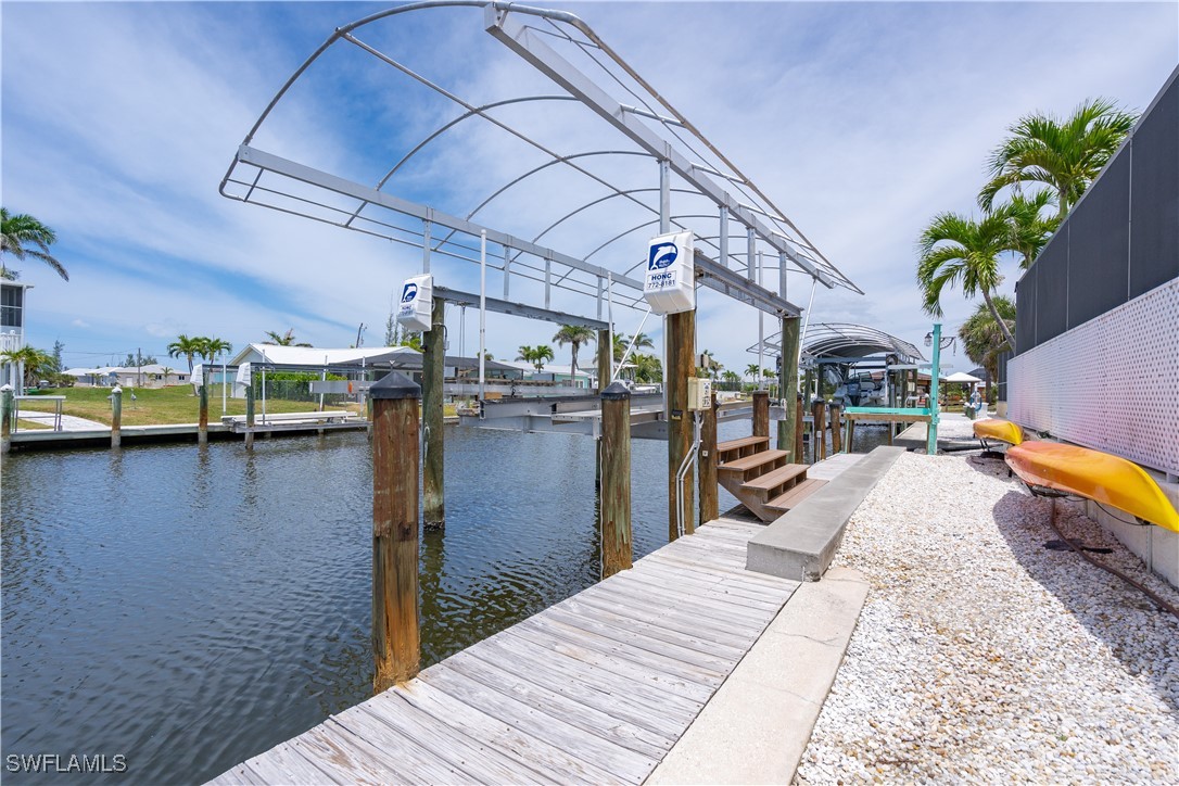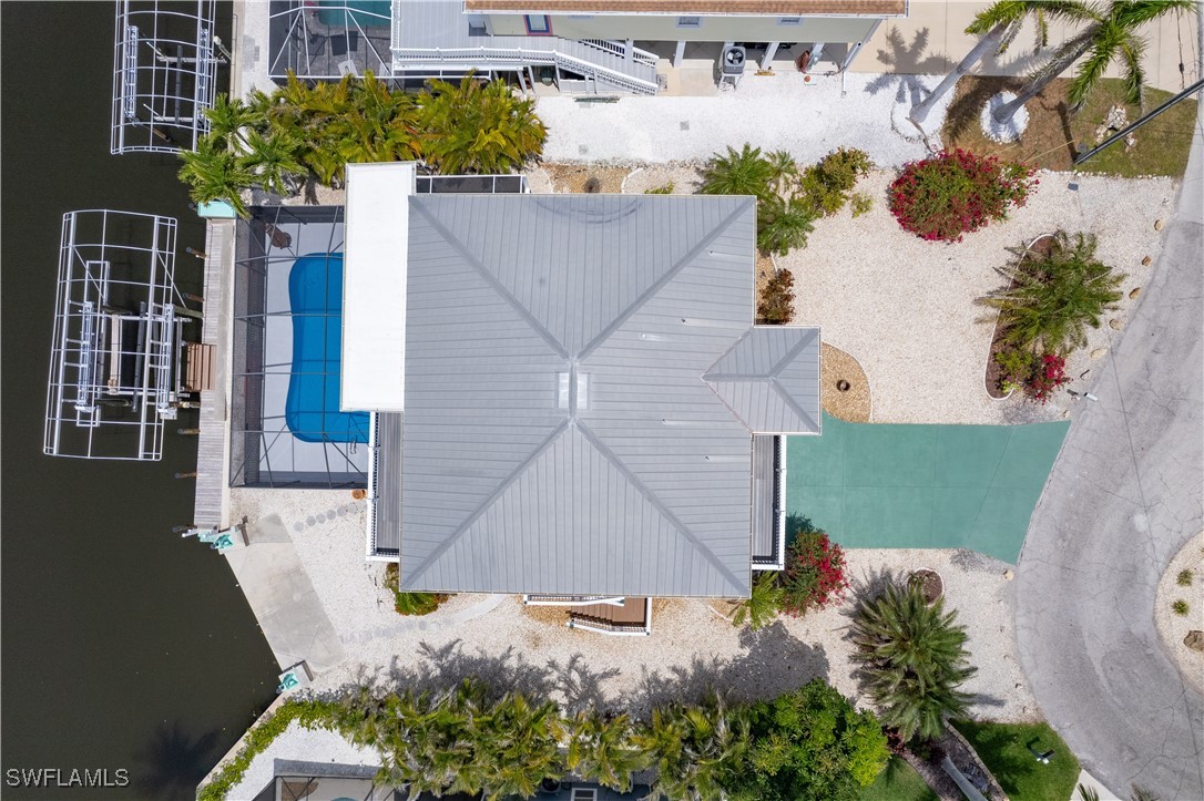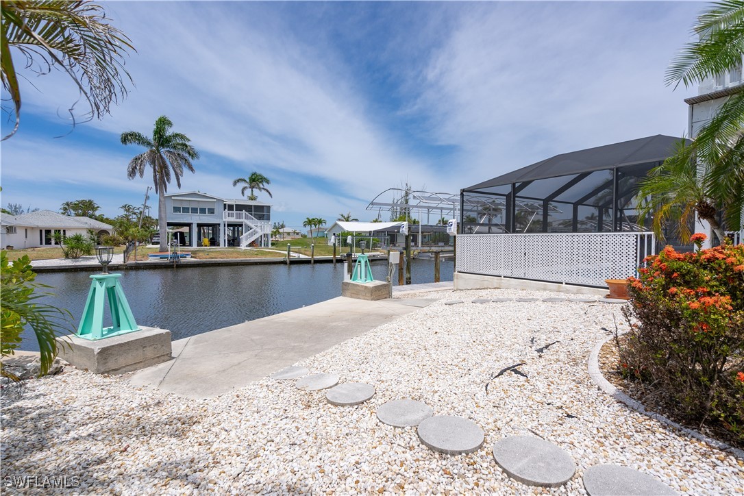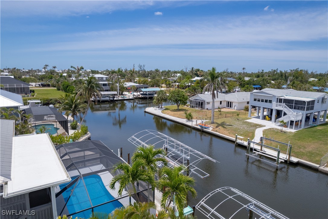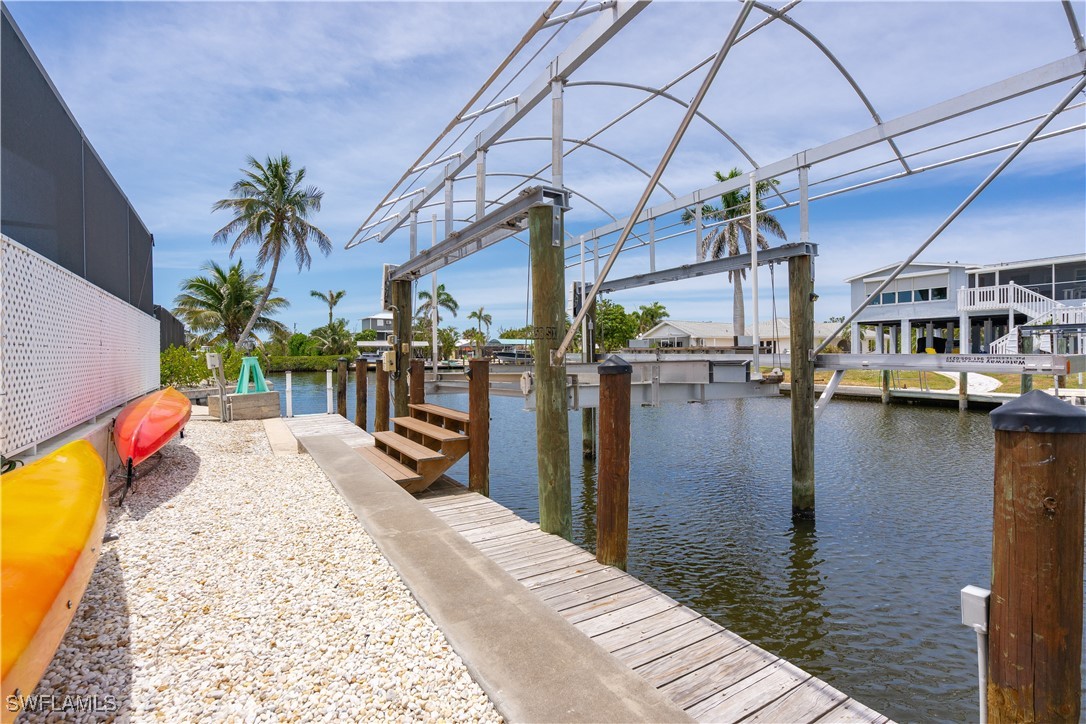 Situated on an oversized cul-de-sac lot, this beautifully updated Key West style home sits high and dry with no flood or wind damage from recent storms, offering peace of mind in paradise. Enjoy breathtaking intersecting canal views from almost every angle of the property. The expansive wrap-around dock includes a 16,000 lb covered PWC boat lift, and easy access to Pine Island Sound and the Gulf of Mexico—perfect for fishing, boating, and cruising to nearby restaurants and beaches. The additional dock/seawall area could be used for jet skis or a second small lift.