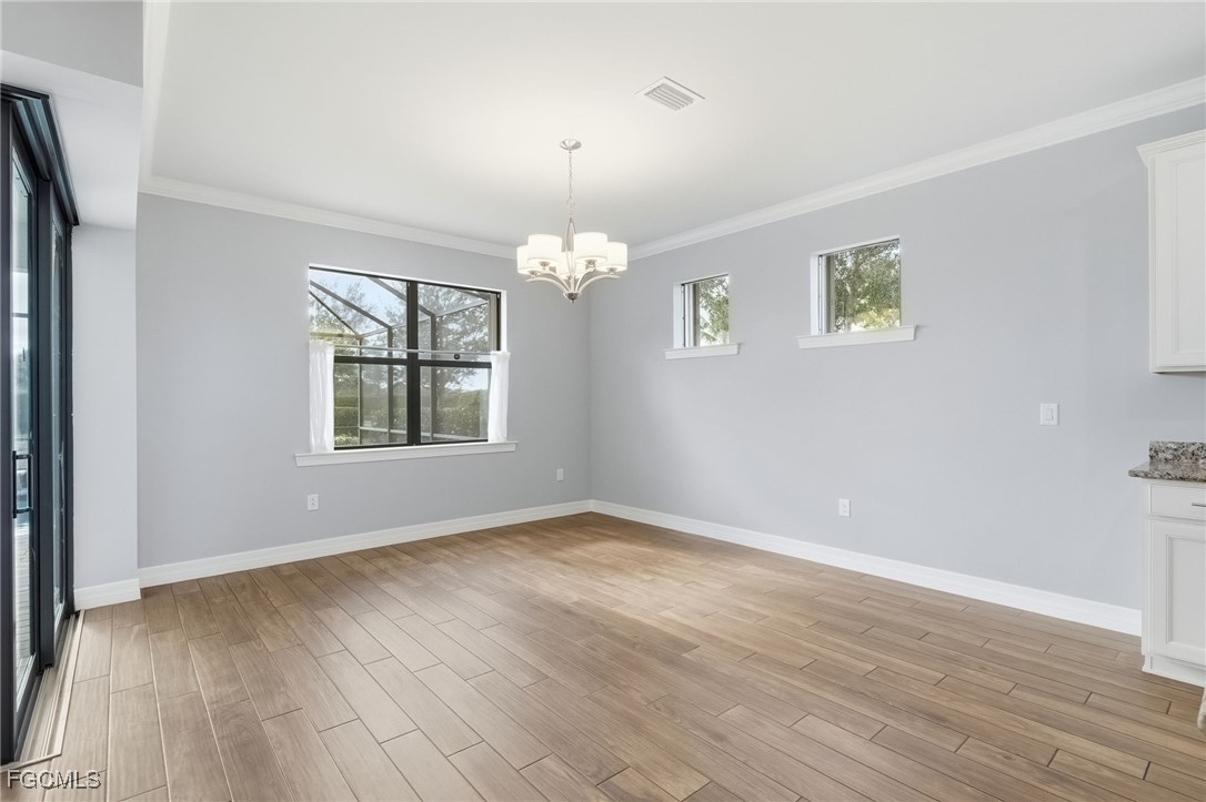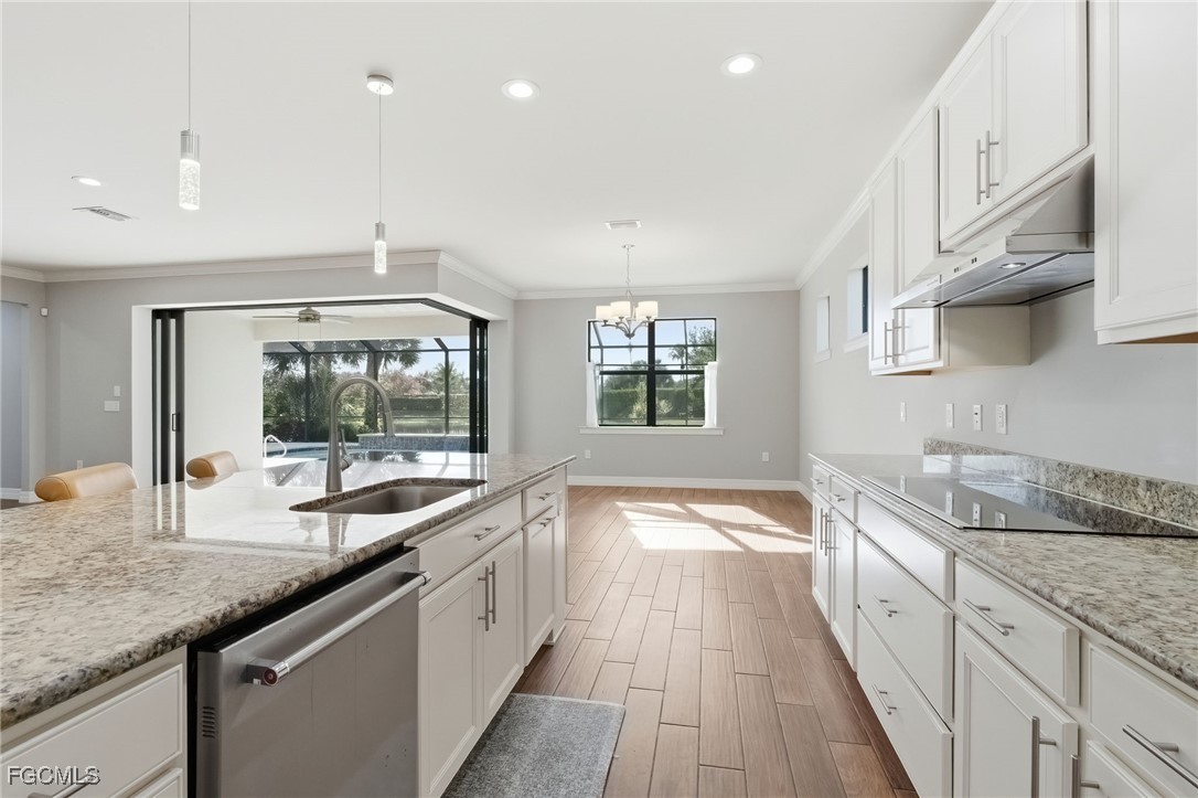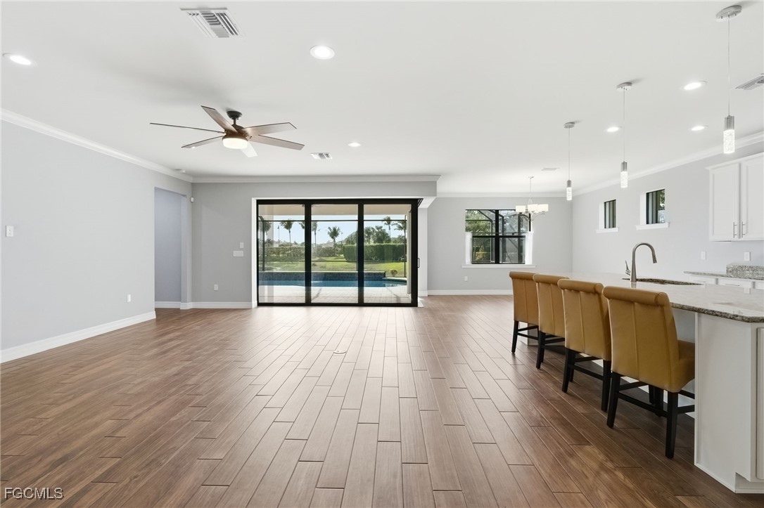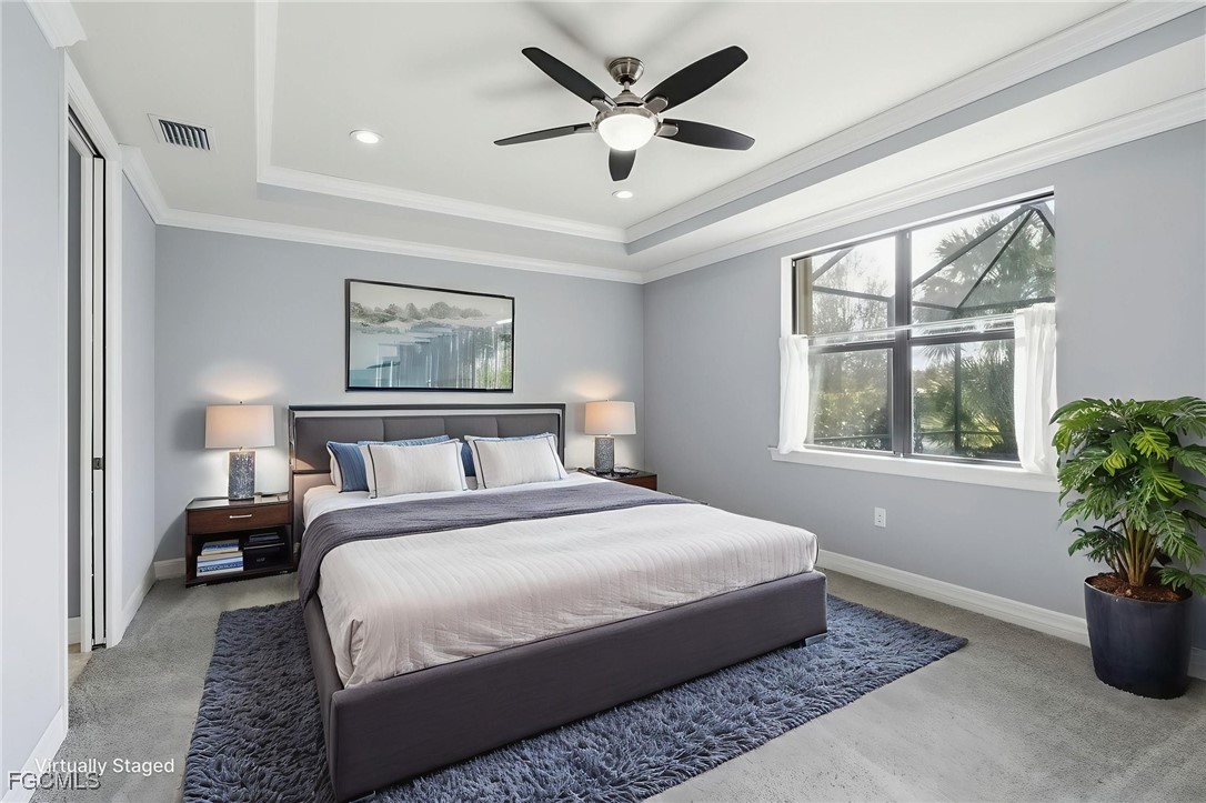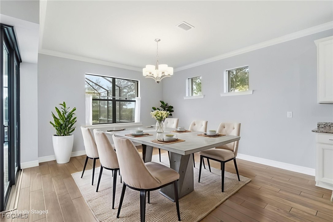 This stunning 3 bedroom plus den, 3 bathroom home is in excellent condition and ready for you to move right in. Recent upgrades include a brand-NEW refrigerator (2025), NEW hypoallergenic carpet (2025), and a NEW water heater (2024). As you enter, you’ll be greeted by beautiful corner sliders that fully pocket away, creating a seamless transition between the living room and the spacious lanai. Elegant details such as a leaded glass front door, crown molding, 8-foot doors, built-in office cabinets, and framed bathroom mirrors add sophistication throughout. The large kitchen features an oversized island, electric cooktop, wall oven, and lower cabinets with pull-out drawers, making it easy to access cookware while staying connected with family and guests. Overlooking the open living and dining areas, the kitchen is the perfect hub for entertaining. Just off the living room, the screened lanai offers a sparkling pool and tranquil water view, with plenty of covered and uncovered seating to enjoy breathtaking west-facing sunsets. Situated on a corner lot, the home provides extra space and added privacy with no neighbors on one side.