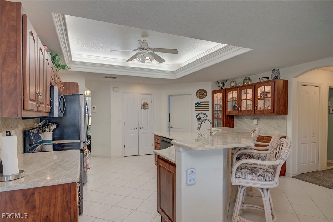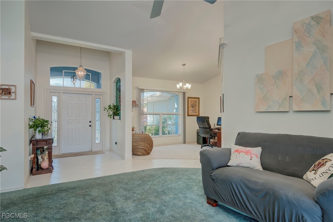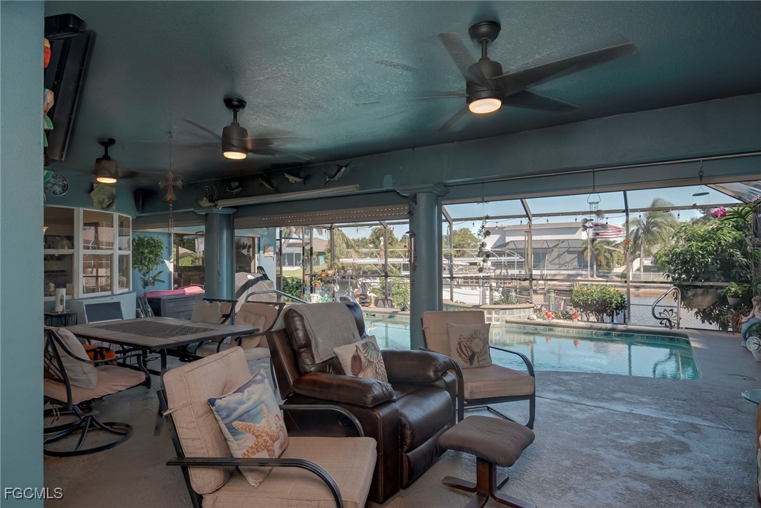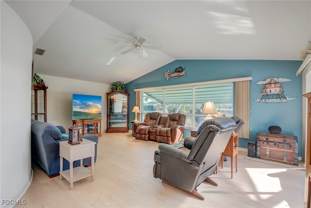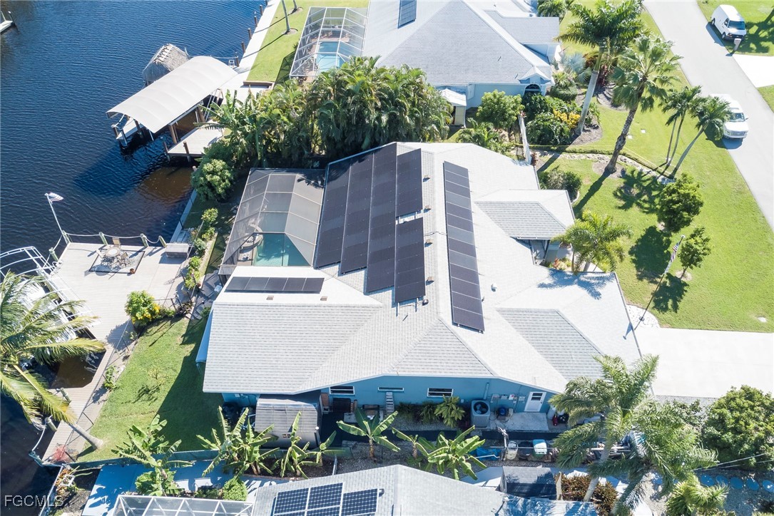 SAILBOAT ACCESS TO THE GULF!! Welcome to boater's paradise in sunny Southwest Florida! Enjoy the sunrise from your salt water pool and/or massive boat dock. This solar home boast over 2300 sqft with 3 bedrooms, 2 bathrooms, living room, family room, and a den that could be used as a dining area/office space. The sailboat access canal leads you out to the Caloosahatchee River within 15 minutes, then to the Gulf of America! The massive boat dock with composite decking includes water, electric and a 14000 lb boat lift with a captain's walk. Your large lanai and heated pool secures your forever summer. The 64 solar panels will reduce your electric bill immensely! Many upgrades include: HVAC(2022), electrical panel & sub panel(2024), hybrid hot water heater(2021), Solar Panels(2021), Roof(2021), Spray Foam Insulation(2021), Quartz Countertops(2022), pool heater(2020), new laminate floors in the family room(2025), freshly painted driveway & pool deck(2025). For peace of mind there are electric hurricane shutters for the lanai & den area, manual shutters for the windows in the master bathroom & family room, and an outlet to plug in your generator. Enjoy the many mature fruit trees: mango, banana, avocado, lychee, sapodilla, Brazilian grape, and coconut. Located near schools, shops, restaurants, hospital & beaches. Home warranty is included until 4/20/28! Schedule your showing today!