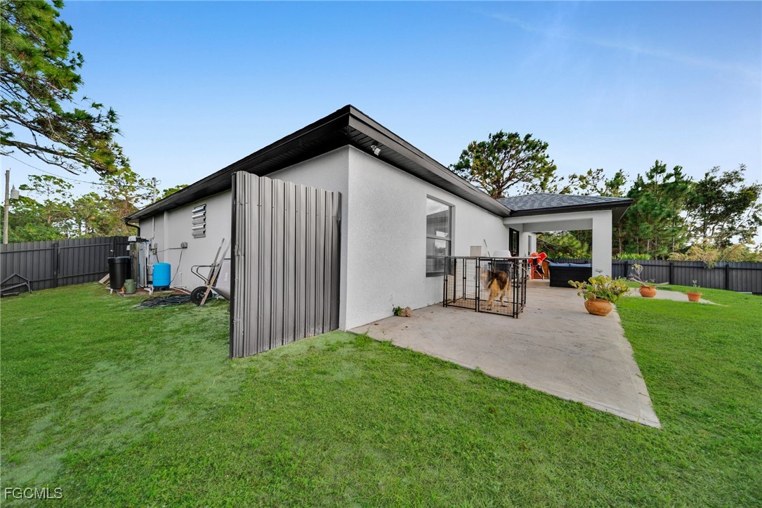 Welcome to this well-maintained 3-bedroom, 2-bathroom home situated on a fully fenced lot in a quiet and desirable area of Lehigh Acres. This property offers a bright, open split floor plan with tile flooring throughout, high ceilings, and excellent natural light. The open-concept kitchen flows seamlessly into the living and dining areas and features white cabinetry, granite countertops, stainless steel appliances, pendant lighting, and a large island, ideal for entertaining and everyday living. The spacious primary suite provides a comfortable retreat. Step outside to a covered lanai overlooking a generous backyard designed for relaxation and entertaining. The yard features a concrete pad with a gazebo, perfect for outdoor gatherings, and backs up to a canal/drainage area, providing extra privacy with no rear neighbors. Plenty of space for pets, play, or future outdoor improvements. Additional highlights include a two-car garage, indoor laundry with washer and dryer included, modern exterior finishes, and mature landscaping. No HOA and no flood insurance required. Conveniently located near shopping, dining, schools, and major roadways. Move-in ready and ideal for a primary residence or investment opportunity—schedule your private showing today.