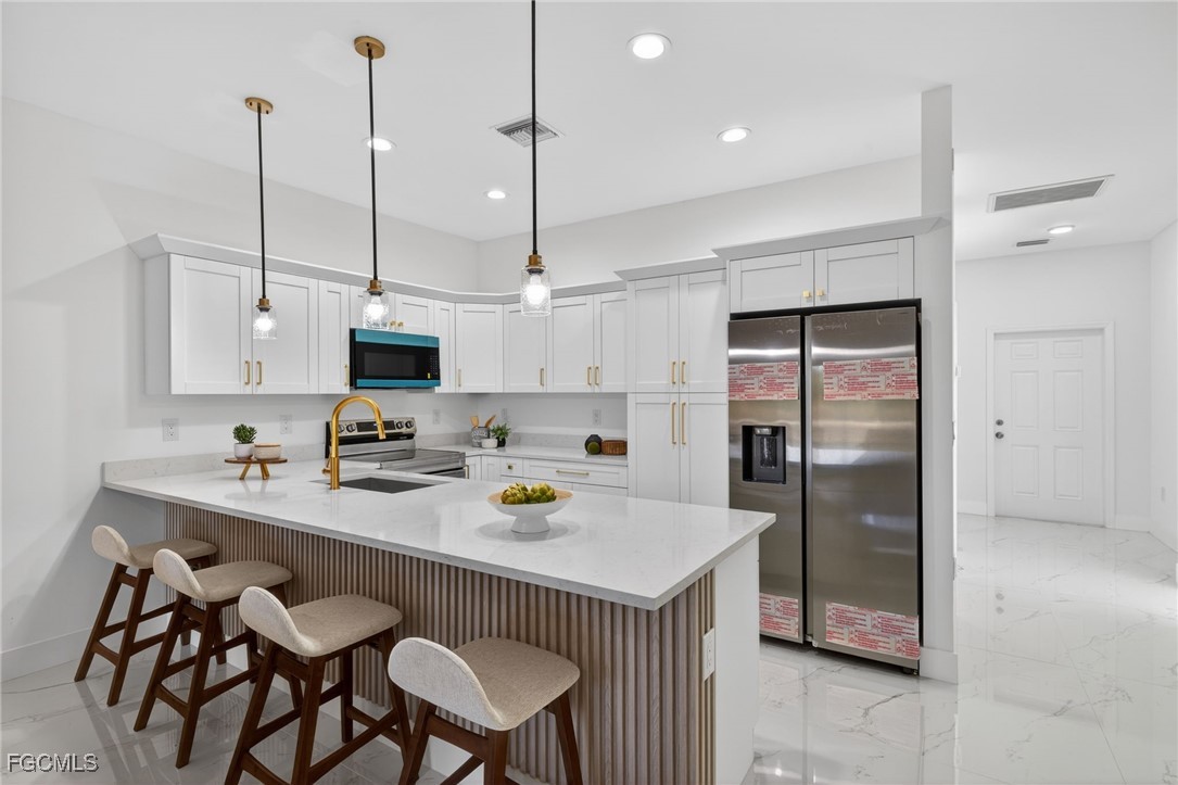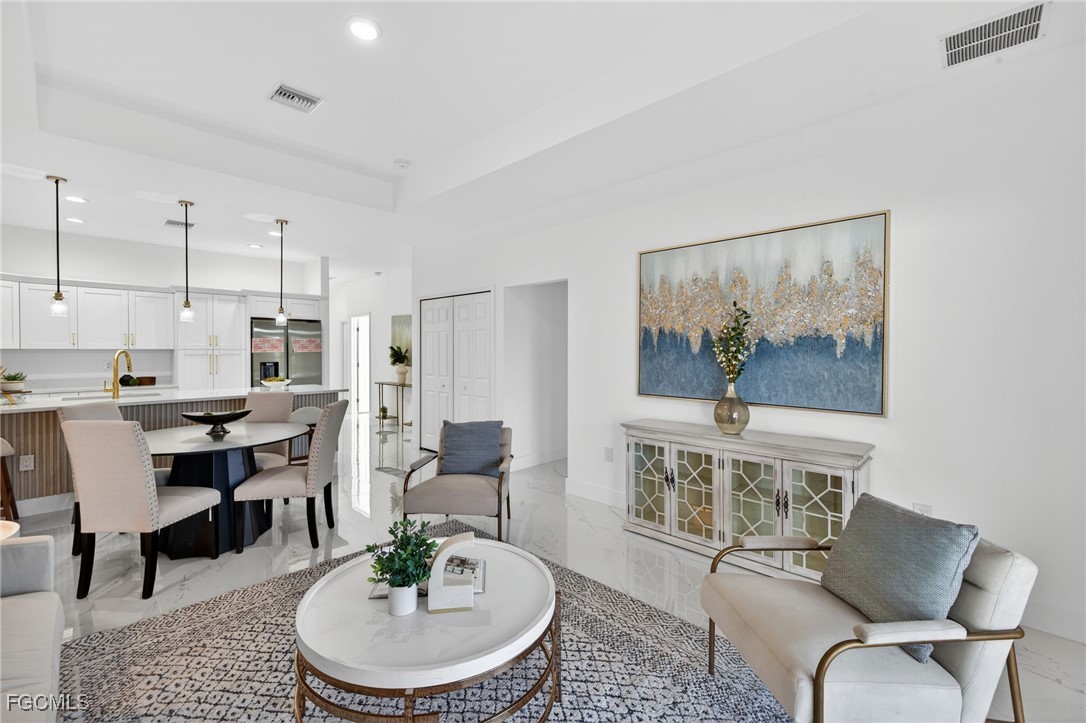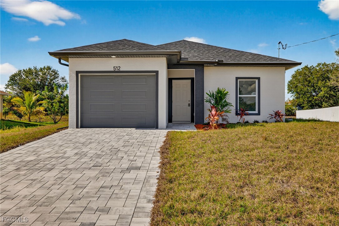 Step into this stylishly staged Lehigh Acres home! With 3 bedrooms, 2 bathrooms, a 1-car garage, and 9’4” ceilings throughout, with stunning 10’4” tray ceilings in the living room and master bedroom, the space feels open and airy. The modern kitchen features stainless steel appliances, shaker cabinets, and a breakfast bar perfect for casual meals. Porcelain floors, hurricane-impact windows, a paver driveway, and a covered lanai complete the look. Located in a welcoming neighborhood just minutes from Mirror Lakes Elementary, parks, and shopping. All furniture is available for purchase — see how easy it is to move right in!