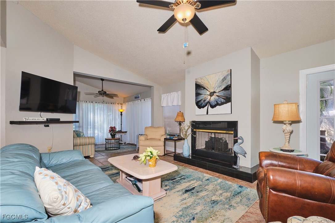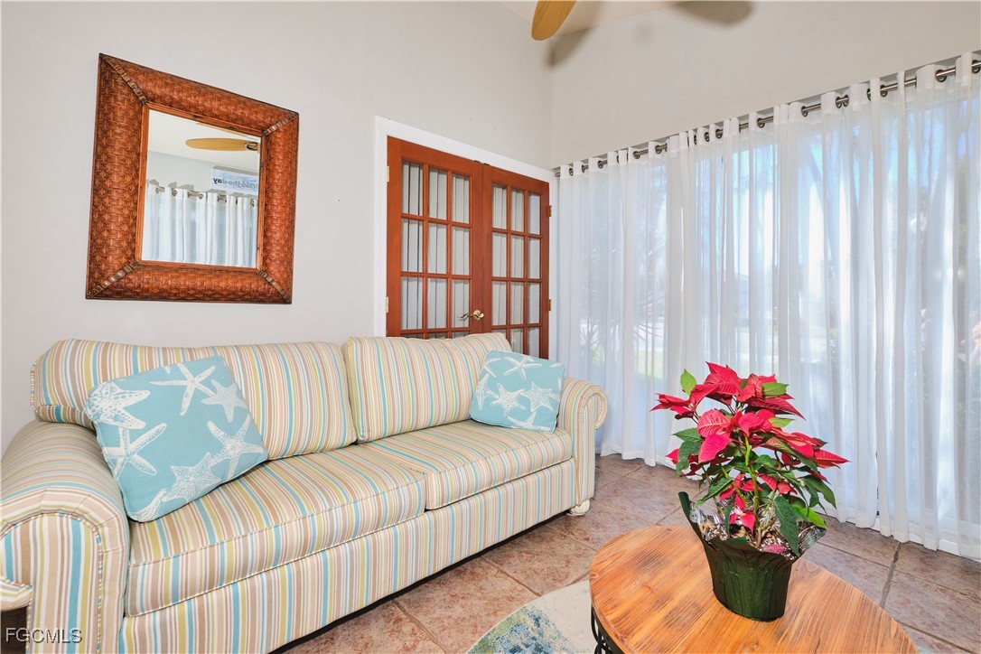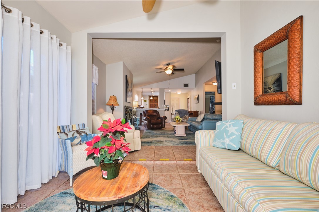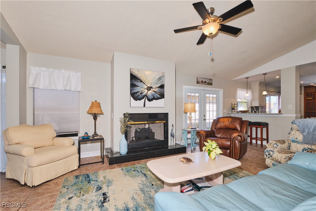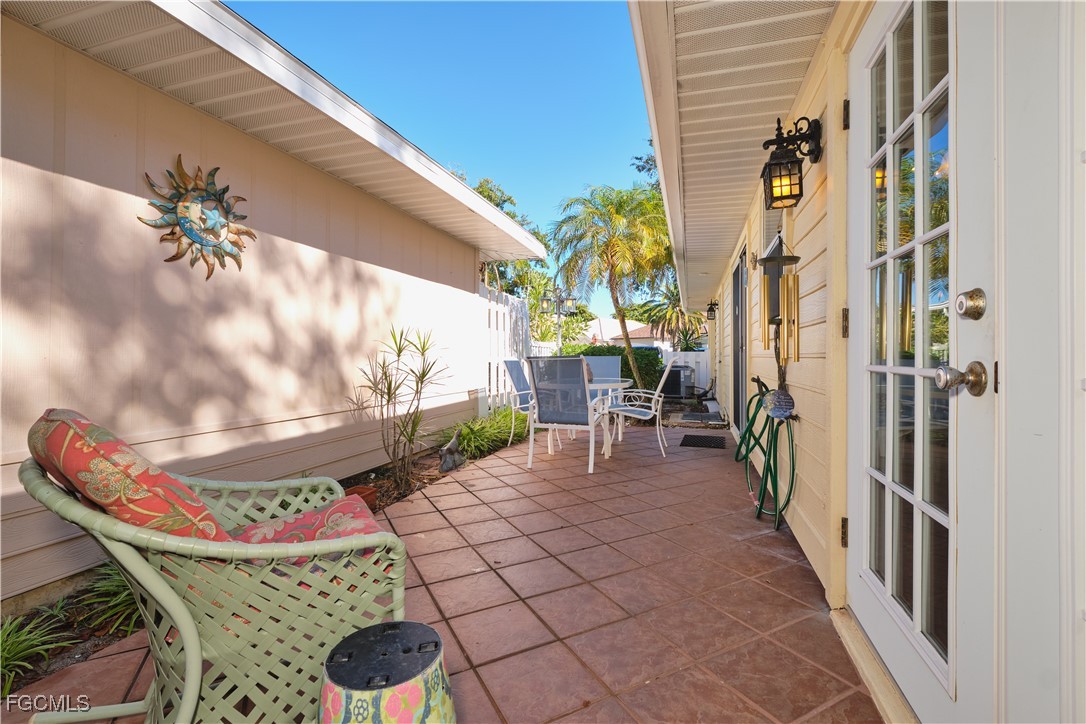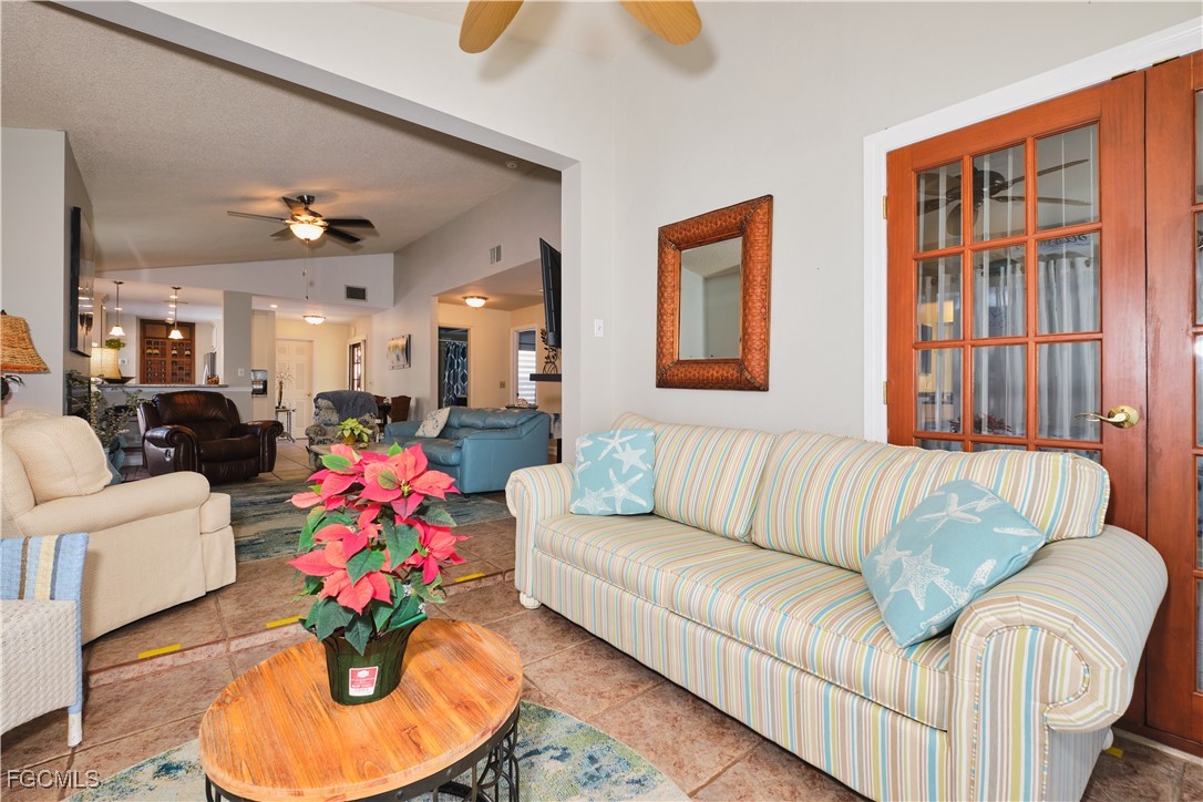 Adorable updated cottage featuring newer kitchen and baths. Original 3/2 opened up and expanded to approximately 1,450 s.f. under air. Great room concept with vaulted ceilings, large dining area with storm rated sk ylight and living room with electric fireplace. Detached villa with single family feel, 2 car garage and no adjacent neighbor to the east, very private. Living area flows to sun room with patio doors, SW exposure and french doors to master bedroom, custom entry door with side light and 4 sets of 15 pane french doors. Negotiable furniture. Upgraded fans & lighting, all tile living areas and laundry is inside. Whole house water softener recently installed. Newer ductwork. Large tiled patio with tropical landscaping and across from pool, clubhouse and guest parking. Roof has recently been replaced, exterior painted & road recently paved. No assessments! Independent mail boxes at driveway and trash pick-up curbside. AC replaced 2019. 186 slip deep water Marina with slips available for lease or purchase. Some amenities herein available but not offered. Minutes to Fort Myers, Sanibel and Captiva beaches, dining, shopping and RSW Airport.