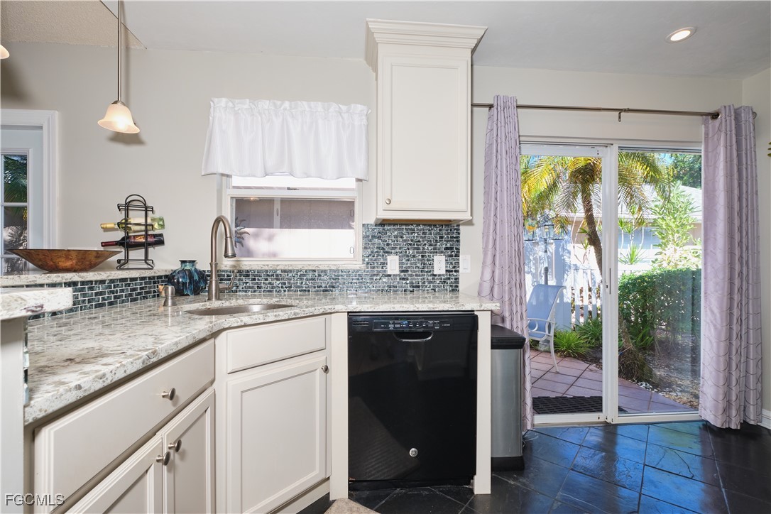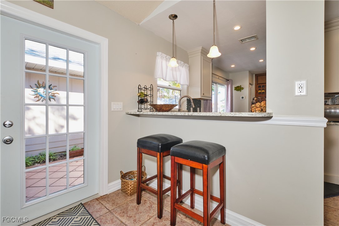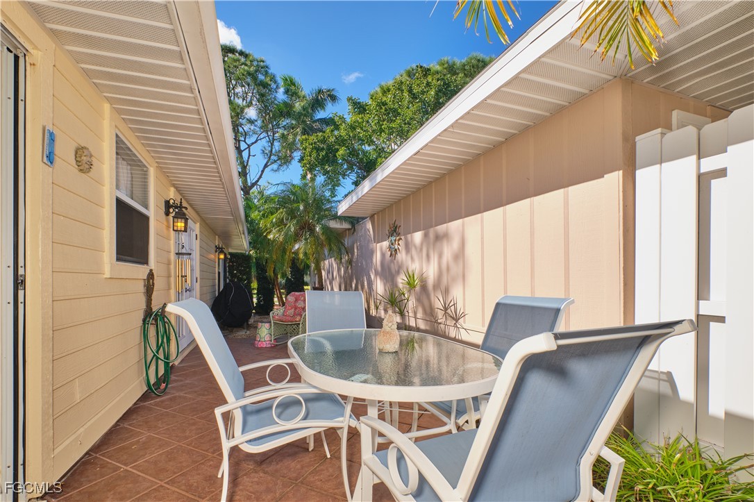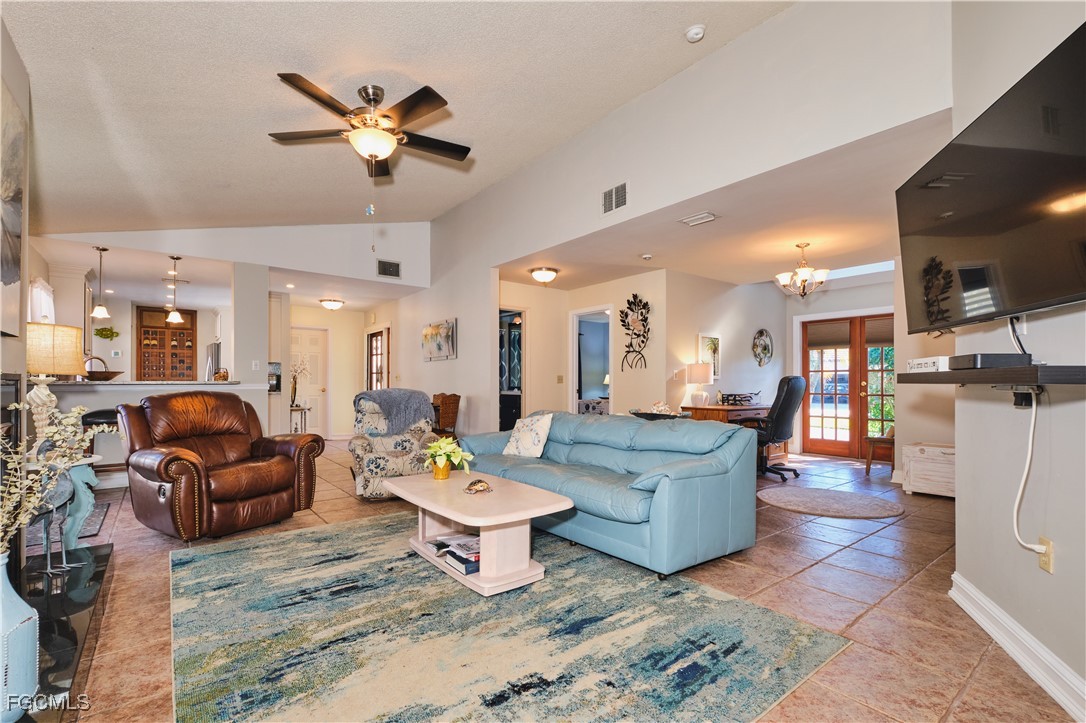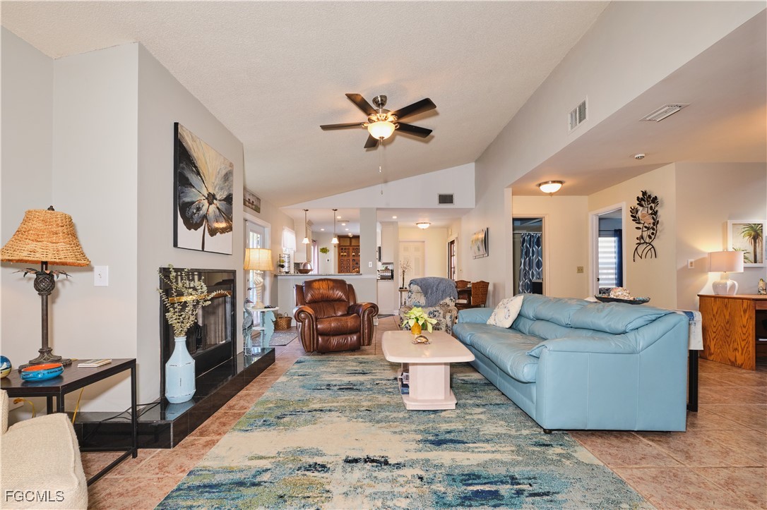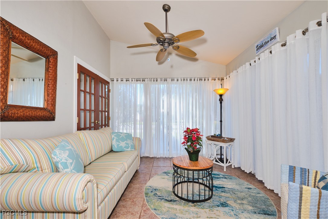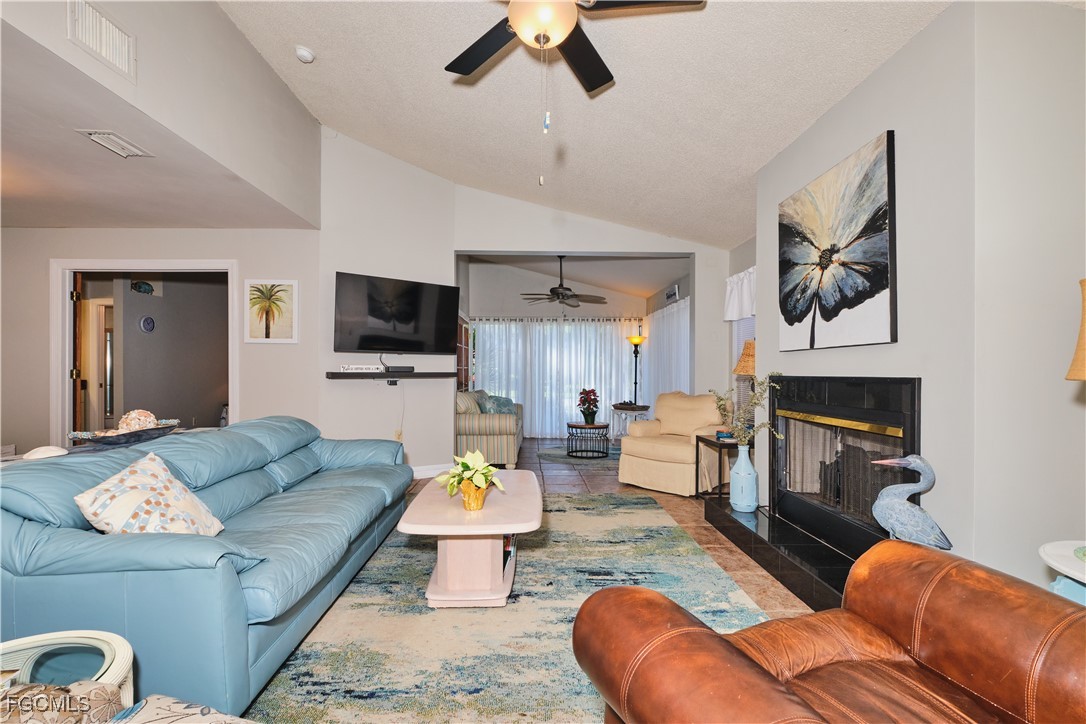 Adorable updated cottage featuring newer kitchen and baths. Original 3/2 opened up and expanded to approximately 1,450 s.f. under air. Great room concept with vaulted ceilings, large dining area with storm rated sk ylight and living room with electric fireplace. Detached villa with single family feel, 2 car garage and no adjacent neighbor to the east, very private. Living area flows to sun room with patio doors, SW exposure and french doors to master bedroom, custom entry door with side light and 4 sets of 15 pane french doors. Negotiable furniture. Upgraded fans & lighting, all tile living areas and laundry is inside. Whole house water softener recently installed. Newer ductwork. Large tiled patio with tropical landscaping and across from pool, clubhouse and guest parking. Roof has recently been replaced, exterior painted & road recently paved. No assessments! Independent mail boxes at driveway and trash pick-up curbside. AC replaced 2019. 186 slip deep water Marina with slips available for lease or purchase. Some amenities herein available but not offered. Minutes to Fort Myers, Sanibel and Captiva beaches, dining, shopping and RSW Airport.