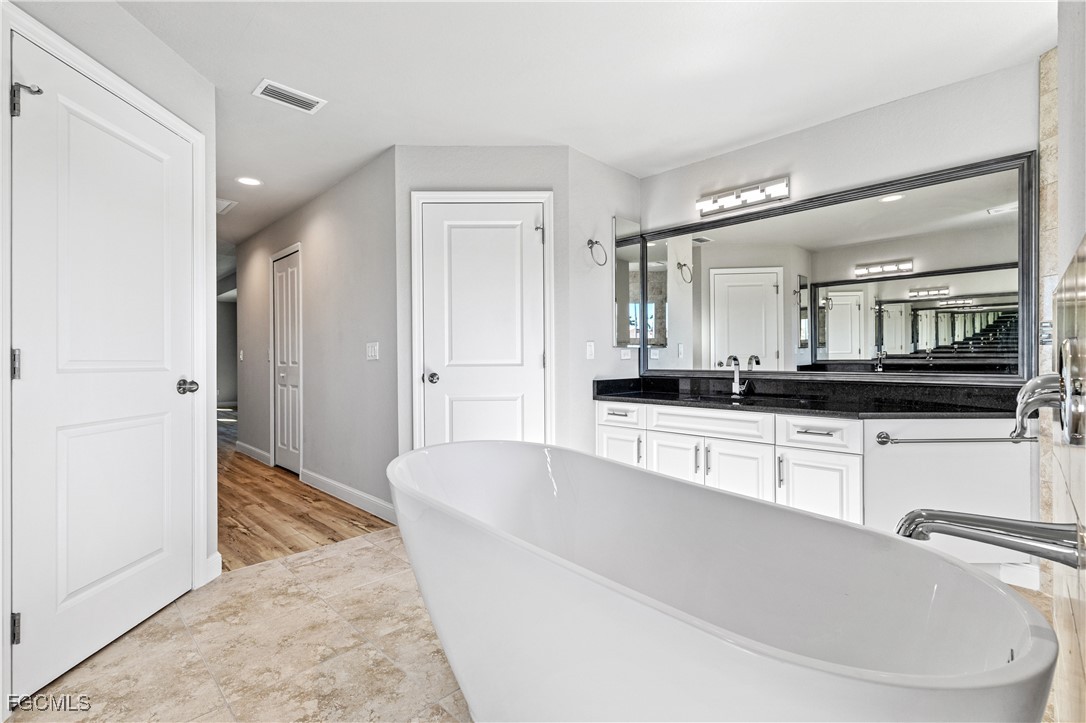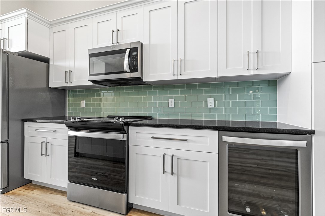 Interior finishes include high-quality luxury vinyl plank flooring with a low-maintenance, like-new appearance. The primary bathroom includes a walk-through, dual-entry shower with dual shower heads, allowing access from both sides of the bath layout. The kitchen is equipped with 42-inch soft-close cabinetry, granite countertops, and a dedicated wine/beverage cooler. Newer Washer and Dryer included.