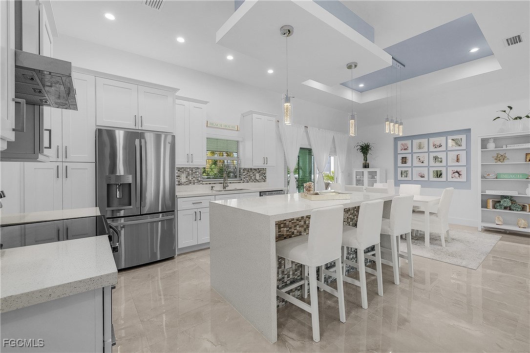 The Heart Of The Home Is A Gourmet Upgraded Kitchen Curated With Sophistication, Showcasing A Waterfall-Edge Island, Quartz Countertops, Mosaic Tile Backsplash, Wood Cabinetry, And A Sleek Range Hood, All Flowing Seamlessly Into Light-Filled Living Areas.