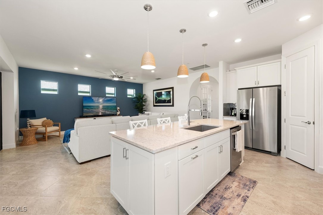 Incredible waterfront retreat in one of the most affordable bundled golf communities in southwest Florida! This beautifully appointed 2-bedroom plus den single-family home is perfectly situated on an oversized lot with serene water and preserve views. Just 2.5 years young, this quality-built Pulte home combines modern design, comfort, and convenience—offered turnkey so you can move right in and start enjoying the lifestyle you deserve. Inside, you’ll find tasteful décor, a daylight entry door, and 8-foot doors throughout that enhance the open, airy feel. The island kitchen features a stylish backsplash, corner pantry, premium finishes, and opens seamlessly to the great room and dining area—ideal for entertaining. The zero-corner sliders expand your living space to the L-shaped screened lanai, complete with plumbing and venting for an outdoor kitchen, where you can relax and take in the tranquil lake and wooded backdrop. The split-bedroom floor plan provides privacy for guests, with a den featuring a sleeper sofa for additional visitors. The primary suite offers peaceful views, a large walk-in closet, and a luxurious bath with an oversized shower and convenient bench. The epoxy-coated flooring is a plus in the oversized garage that can easily accommodate two cars plus a golf cart—perfect for enjoying the amenity-rich bundled golf community, offering resort-style living at an affordable rate. Nestled on a quiet dead-end street with minimal traffic, this home offers both elegance and peace of mind—nothing to do but bring your clothes and enjoy!