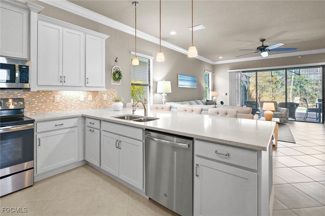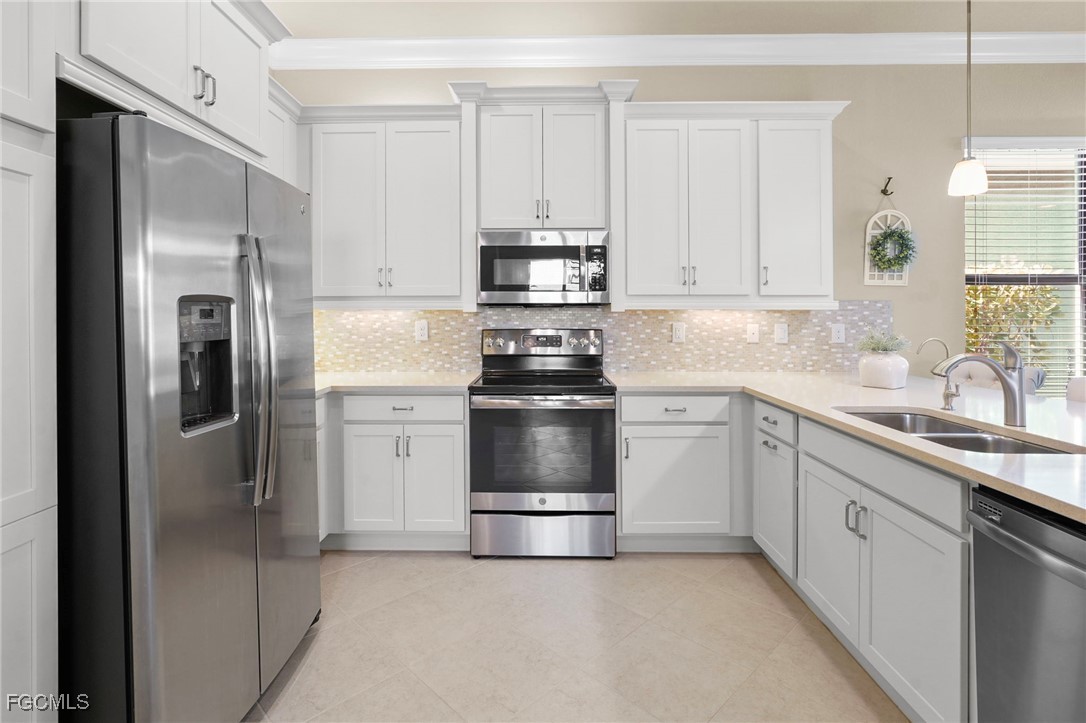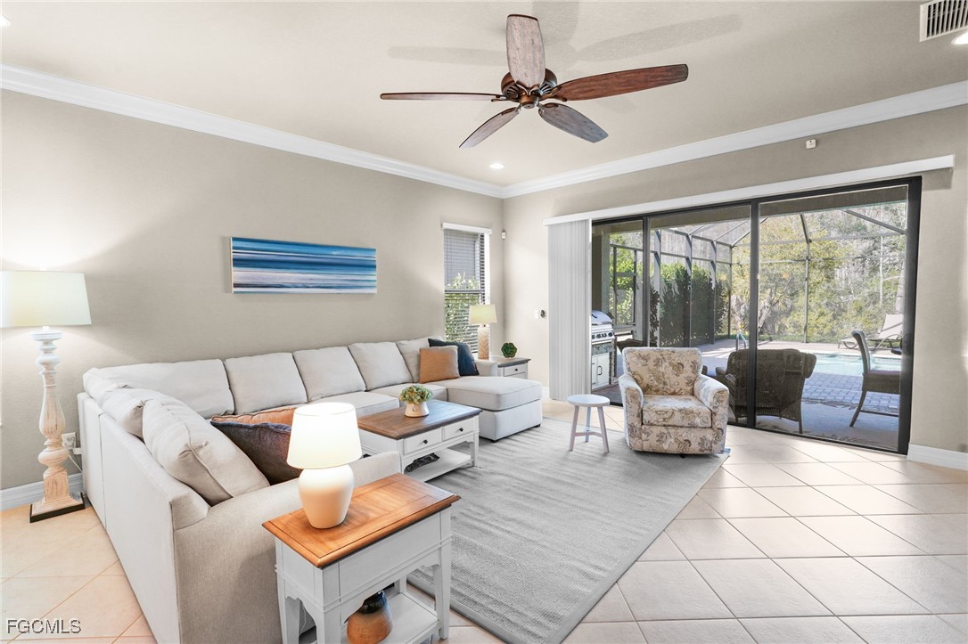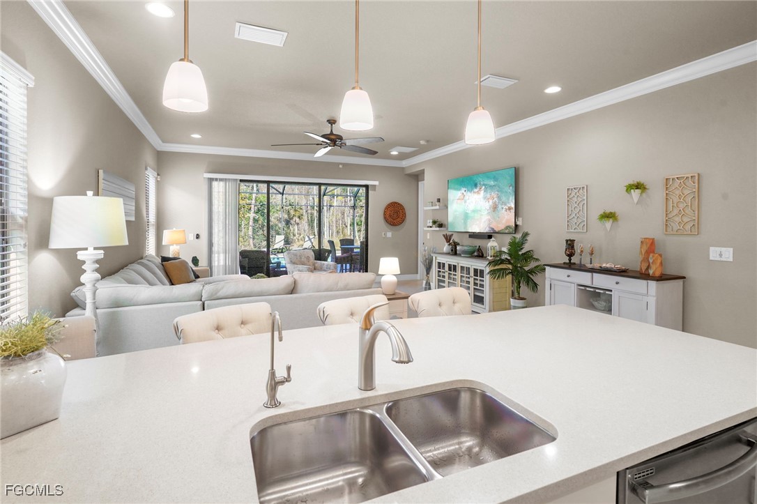 Notable upgrades include IMPACT-RESISTANT WINDOWS, STORM SMART SHADES, reverse osmosis system, crown molding, and quartz countertops throughout. The chef-inspired kitchen features abundant cabinetry, stainless steel appliances, a spacious pantry, and an oversized island with breakfast bar—perfect for casual dining and gathering. An outdoor kitchen, complete with built-in grill, utility sink, and refrigerator, extends the living space and enhances the home’s exceptional indoor-outdoor appeal.