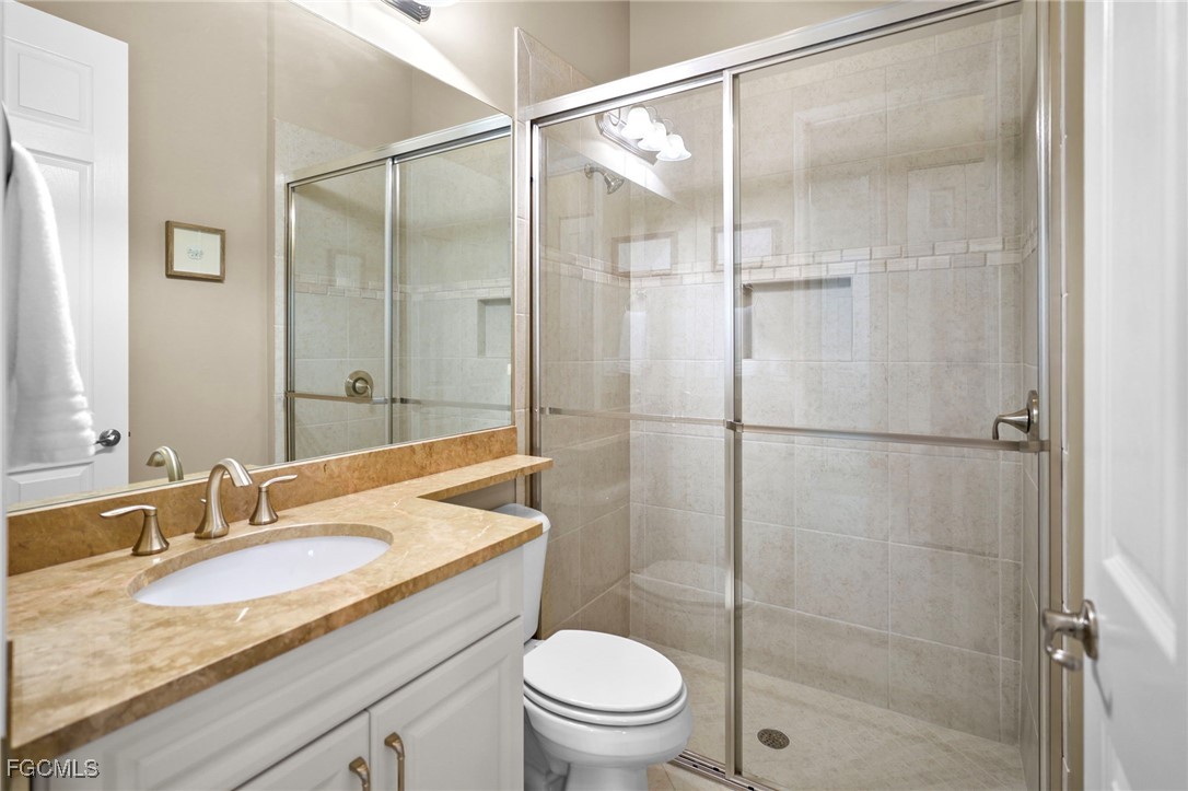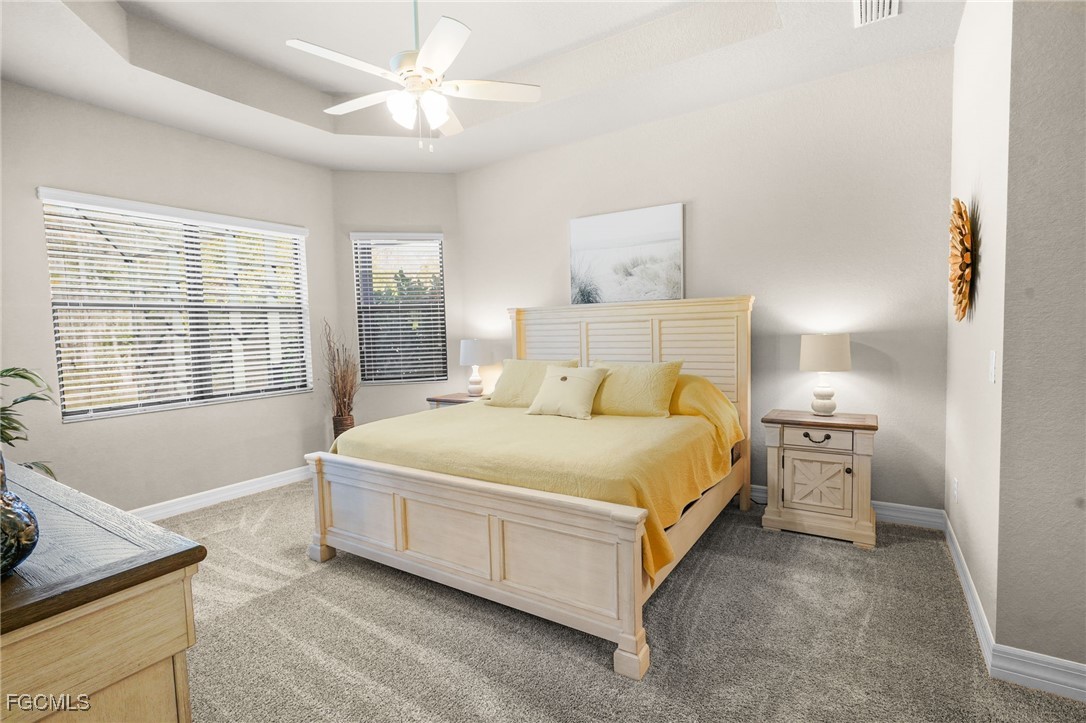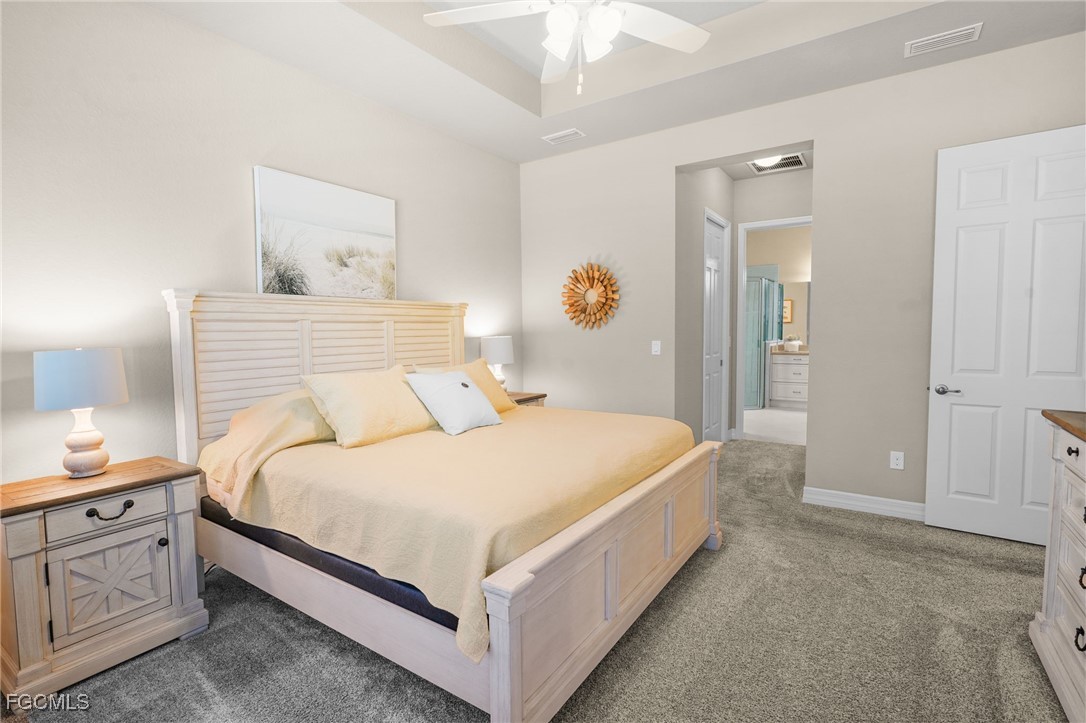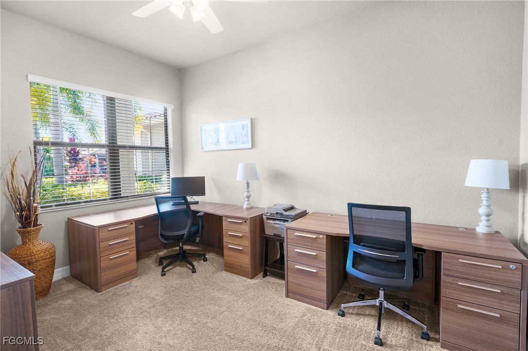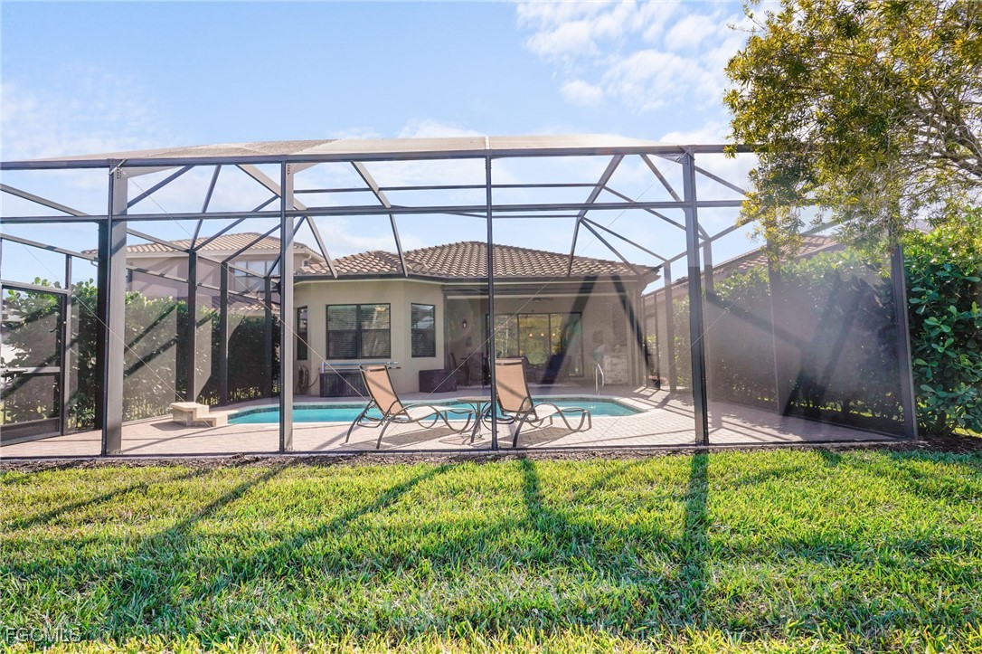 The private owner’s suite is a serene retreat, generously sized to accommodate a king bedroom set and offering a cozy sitting area. Two spacious walk-in closets provide ample storage, while the spa-like en-suite bath features dual vanities, a walk-in shower, and private water closet. Two additional guest bedrooms, each with walk-in closets, share a well-appointed full bathroom. The flexible den can easily serve as a home office, guest room, or additional lounge space. A separate laundry room includes a utility sink and extensive cabinetry for added convenience. Outdoor living is elevated by a private preserve view, heated saltwater pool, expansive sundeck, and covered lanai—ideal for both relaxation and entertaining. Additional enhancements include gutters, ceiling fans in all bedrooms and the lanai, and a two-car attached garage with automatic opener.