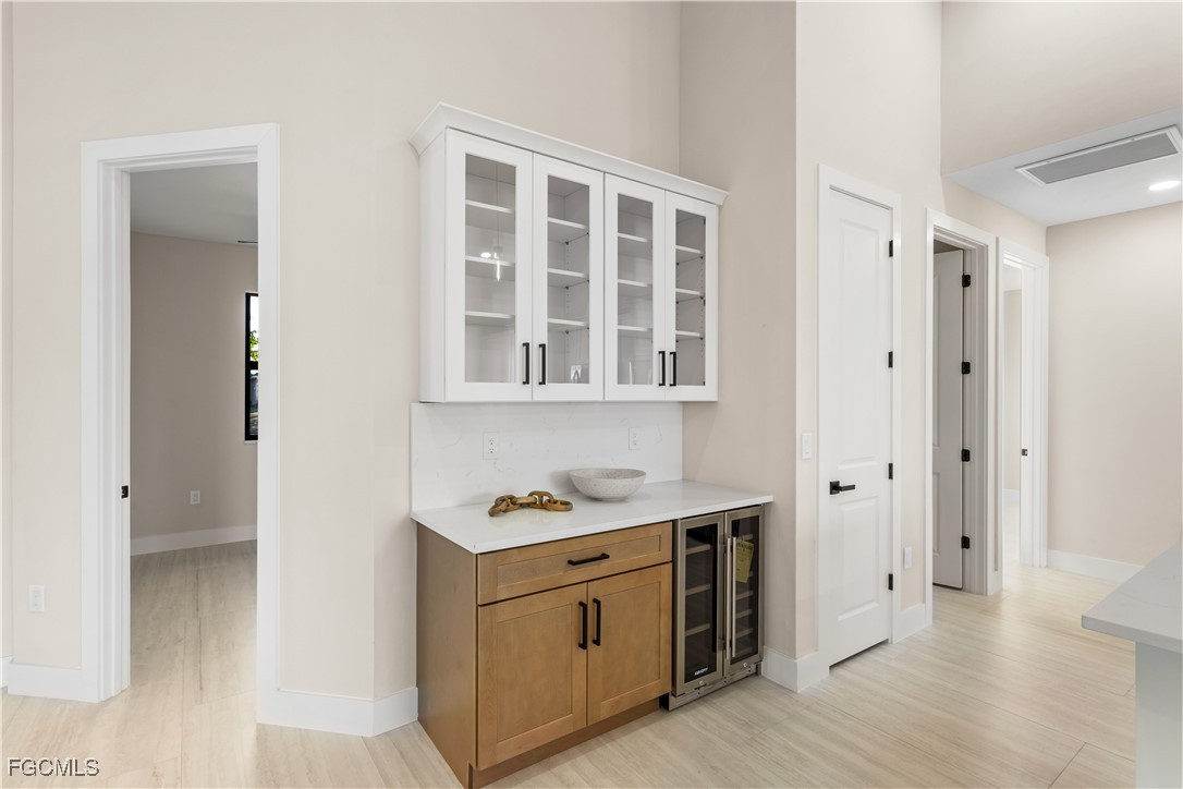 Stop & behold! Move-in-ready NEW CONSTRUCTION HOME - 2026 - complete w/ 2-10 HOME WARRANTY! Located in desirable NORTHERN SW Cape Coral, offers NO FLOOD INSURANCE, durable METAL ROOF, 3-CAR GARAGE & CITY WATER & SEWER! $1,800-$2,400/year homeowners' insurance! Enjoy easy access to CHIQUITA BLVD & PINE ISLAND RD, making commuting & daily errands easier! Designed for MODERN FLORIDA LIVING, this CONTEMPORARY LUXURY HOME features SCREENED, HEATED POOL & SPA, perfect for year-round enjoyment! With 4 BEDS & 3 full BATHS, the layout is ideal for EVERYDAY LIVING & ENTERTAINING! SCREENED LANAI provides PERFECT SETTING TO RELAX in SPA, SWIM in HEATED POOL, or HOST UNFORGETTABLE BBQs while enjoying THE BEST OF SWFL LIVING! Bright, open layout w/ LIGHT NEUTRAL TILE FLOORING throughout. IMPACT-RESISTANT DOUBLE DOORS lead into WELCOMING LIVING ROOM w/ 12-ft VAULTED CEILING & SLIDING DOORS TO LANAI. GORGEOUS CHEF'S KITCHEN w/ SPACIOUS QUARTS COUNTERTOP ISLAND w/ undermount LARGE SINK & SLEEK MATTE-BLACK gooseneck FAUCET. Crisp WHITE SHAKER CABINETRY is paired w/ contrasting warm WOOD-TONE ISLAND CABINETS & modern BLACK HARDWARE for a sophisticated coastal-modern design. Equipped w/ SS appliances, French-door refrigerator, microwave, smooth-top range & dishwasher. Elegant pendant lighting & recessed ceiling lights illuminate OPEN-CONCEPT SPACE, while GLASS-FRONT UPPER CABINETS add touch of ELEGANCE & DISPLAY STORAGE. Built-in BUTLER'S PANTRY w/ quartz countertop, glass-front cabinetry, warm wood base cabinets & WINE REFRIGERATOR, ideal for BEVERAGE STATION, COFFEE BAR, or EXTRA STORAGE & PREP SPACE. DINING ROOM features bright, modern design, neutral tones & vaulted ceiling w/ recessed lighting that enhances the open feel. LARGE PICTURE WINDOW brings in natural light & offers views of screened lanai & backyard. BUILT-IN CUSTOM WHITE CABINETRY provides ADDED STORAGE & CLEAN, UPSCALE LOOK. LARGE PRIMARY SUITE w/ sliding doors to lanai, WALK-IN CLOSET w/ BUILT-IN SHELVING & HANGING RACKS & LUXURIOUS PRIMARY BATHROOM w/ spacious WALK-IN GLASS SHOWER w/ floor-to-ceiling designer tile, rainfall showerhead, built-in bench & modern matte-black fixtures. Dual-sink vanity w/ quartz countertops, sleek white cabinetry & contemporary lighting complements the spa-like design. Private water closet & generous natural light create BRIGHT & SERENE RETREAT! SPLIT LAYOUT offers SECOND PRIMARY SUITE w/ POOL BATHROOM & TWO GUEST BEDROOMS w/ HALL BATHROOM for added privacy. Step outside to SCREENED LANAI w/ HEATED POOL & SPA, landscaped surrounding & FULLY EQUIPED OUTDOOR KITCHEN w/ BUILT-IN stainless steel BBQ GRILL, SINK, BEVERAGE REFRIGERATOR, GRANITE COUNTERTOPS & MODERN BACKSPLASH, ideal for OUTDOOR DINING & ENTERTAINING! PAVER FLOORING & CEILING FAN create COMFORTABLE SPACE for YEAR-ROUND ENJOYMENT. LAUNDRY, 3-CAR GARAGE & long-lasting METAL ROOF complete HOMES' FUNCTIONAL FEATURES. Experience SWFL lifestyle, SCHEDULE YOUR PRIVATE SHOWING TODAY & discover YOUR PIECE OF PARADISE!
