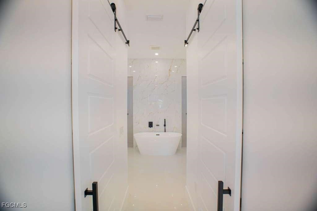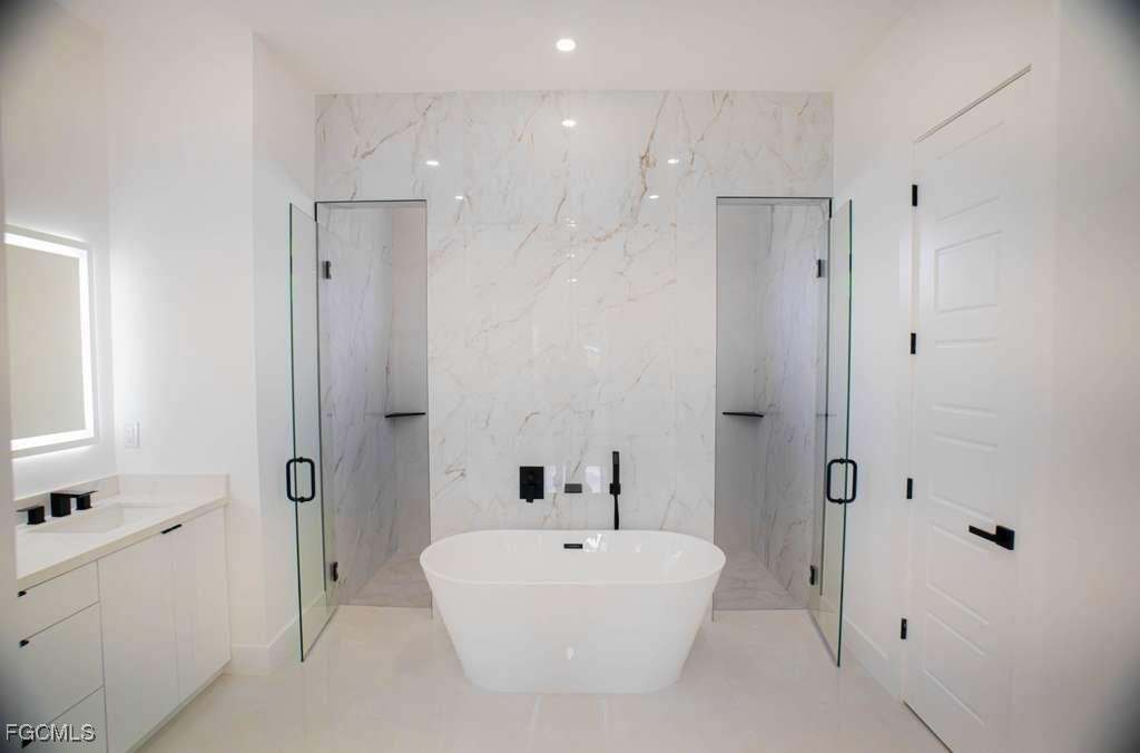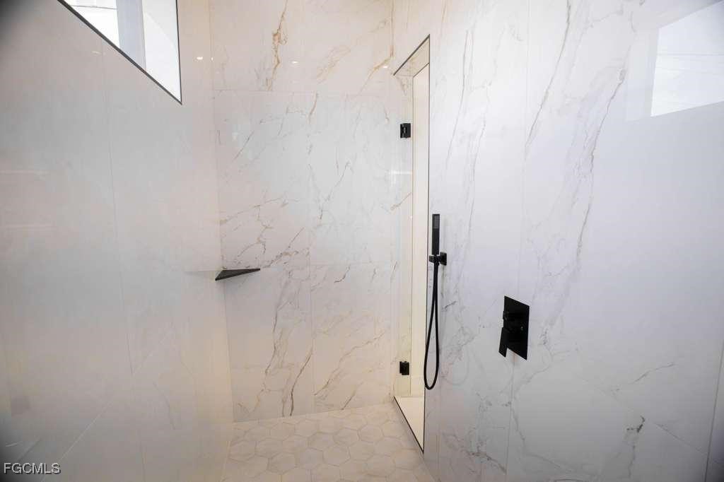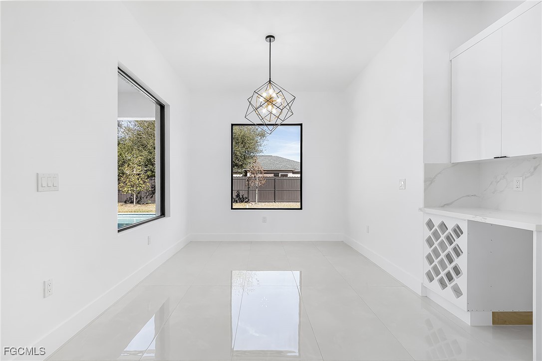 Stunning new construction home on a corner lot with a private pool, located in the highly desirable Southwest Cape Coral area. This 4-bedroom, 3-bath residence offers a modern design with luxury finishes, including 24”x48” porcelain tile throughout, soaring 18-foot ceilings with coffered ceiling details in the living room and master suite, and a sleek 65” electric fireplace as a stylish focal point. The kitchen and bathrooms feature high-gloss wood cabinetry and 2” Calacatta White quartz countertops. Additional highlights include an insulated garage door and a smart layout perfect for enjoying the Florida lifestyle.
