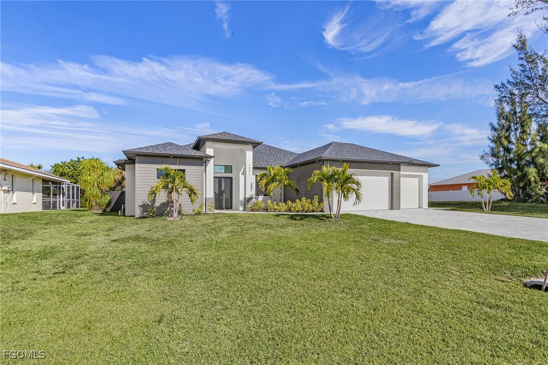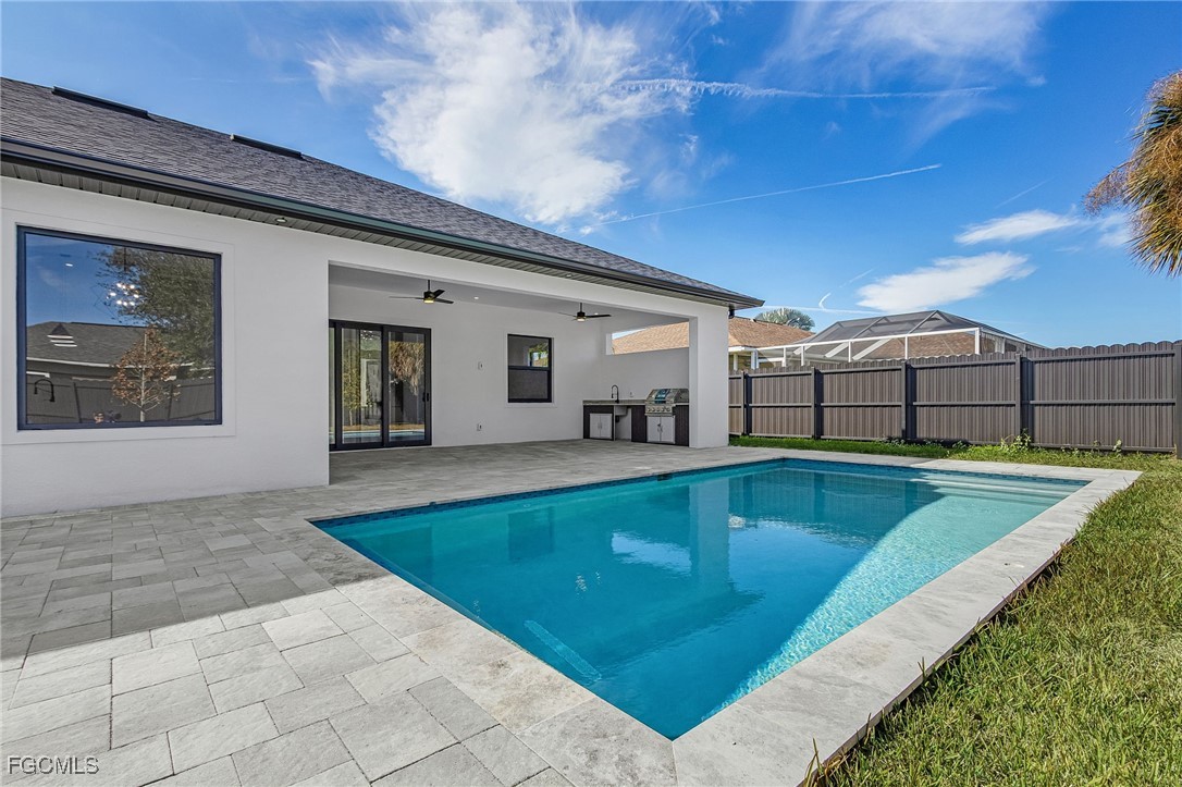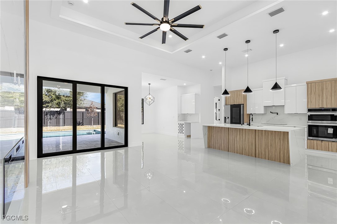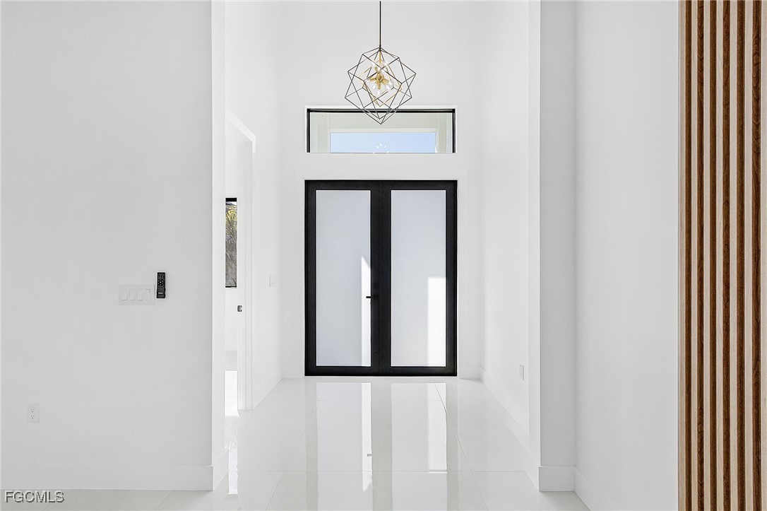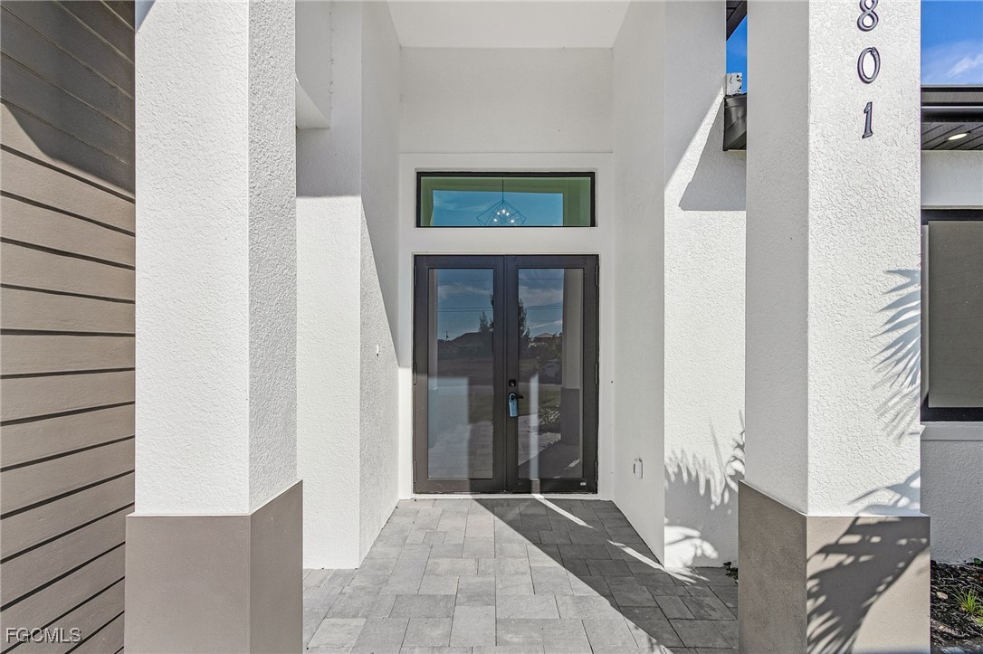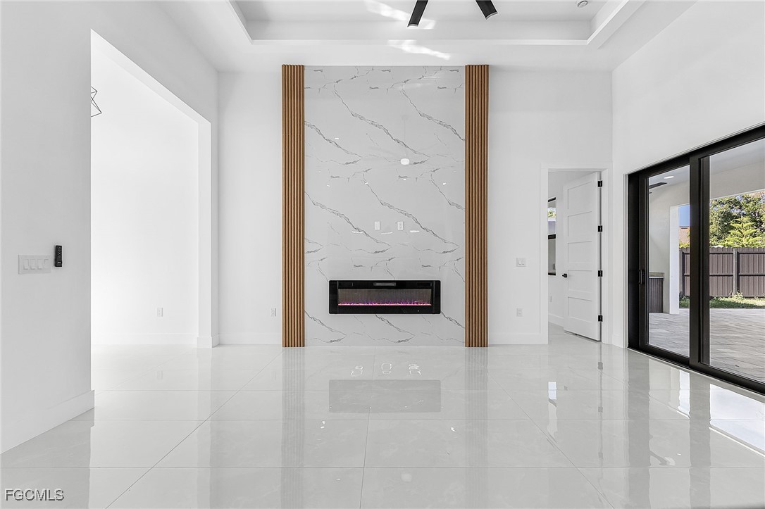 Beautiful new construction home with a private pool, ideally located in Southwest Cape Coral. This 4-bedroom, 3-bath property showcases contemporary design and upscale finishes throughout, including 24”x48” porcelain tile flooring, soaring 18-foot ceilings with elegant coffered details in the living room and master suite, and a modern 65” electric fireplace. The gourmet kitchen and bathrooms feature sleek high-gloss wood cabinetry paired with 2” Calacatta White quartz countertops. Additional features include an insulated garage door and a thoughtfully