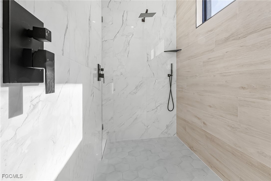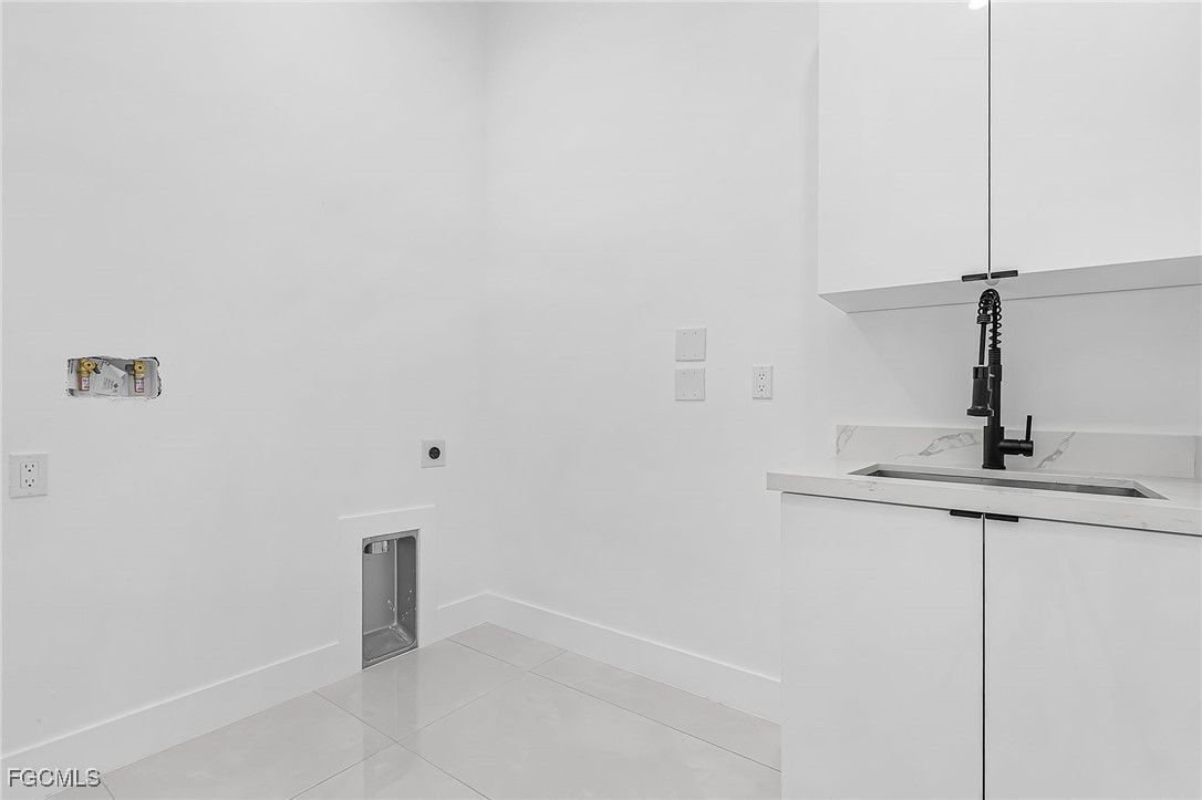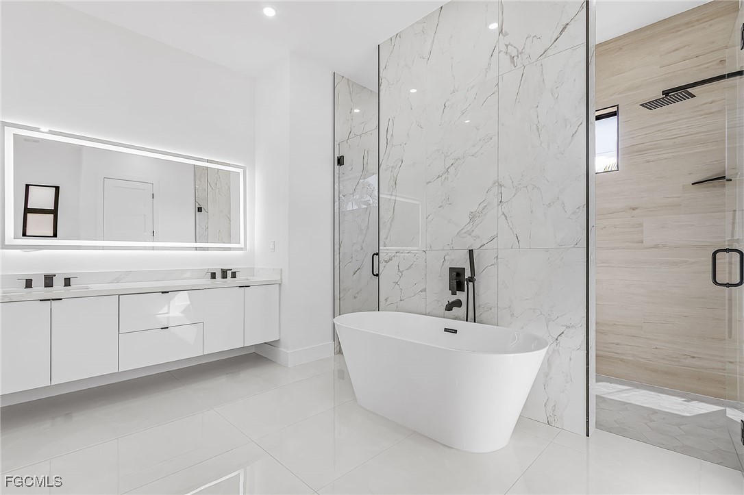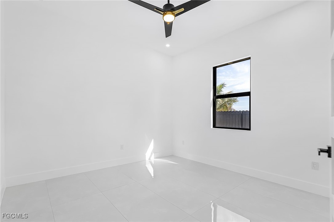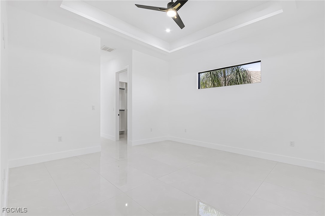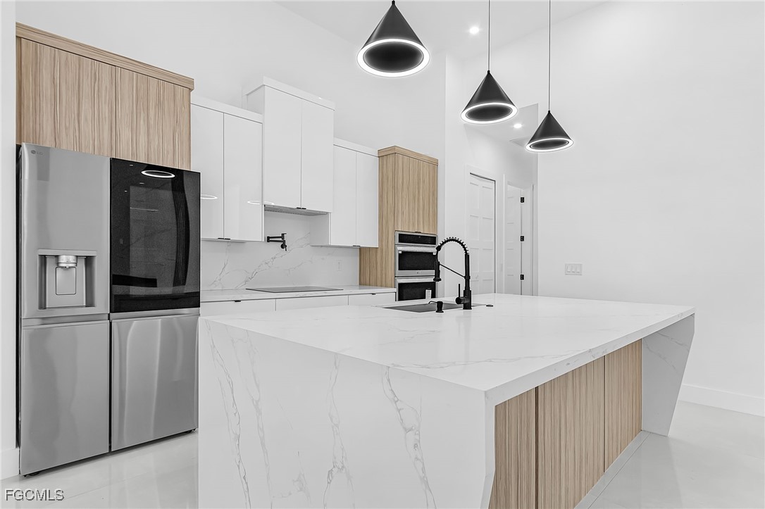 Beautiful new construction home with a private pool, ideally located in Southwest Cape Coral. This 4-bedroom, 3-bath property showcases contemporary design and upscale finishes throughout, including 24”x48” porcelain tile flooring, soaring 18-foot ceilings with elegant coffered details in the living room and master suite, and a modern 65” electric fireplace. The gourmet kitchen and bathrooms feature sleek high-gloss wood cabinetry paired with 2” Calacatta White quartz countertops. Additional features include an insulated garage door and a thoughtfully