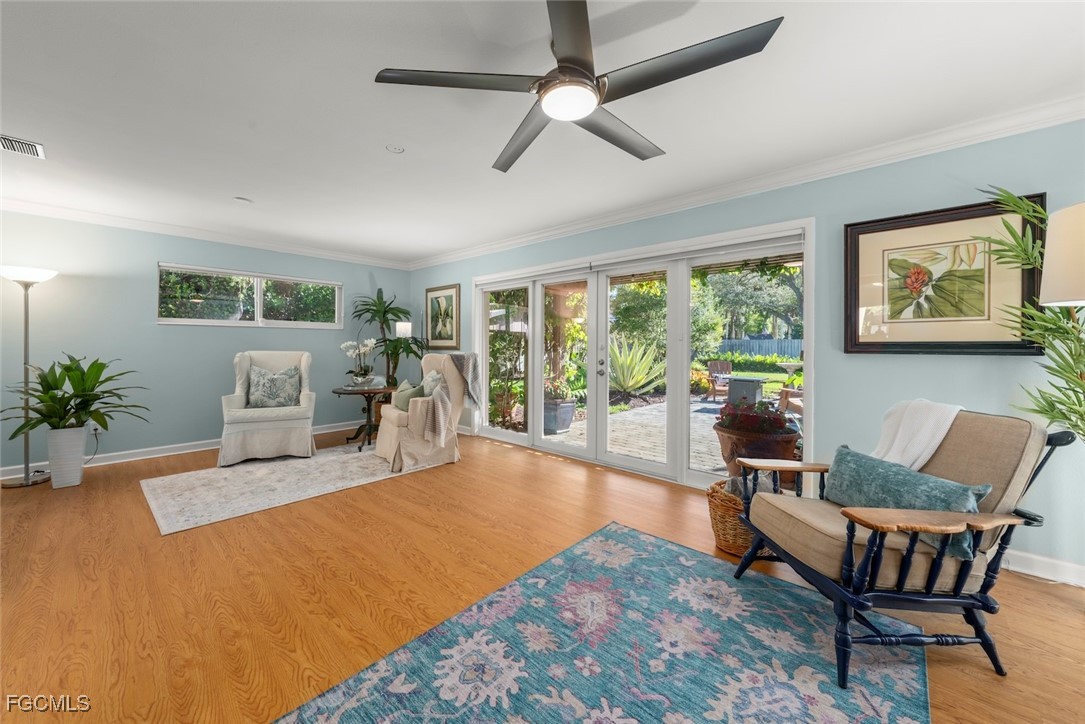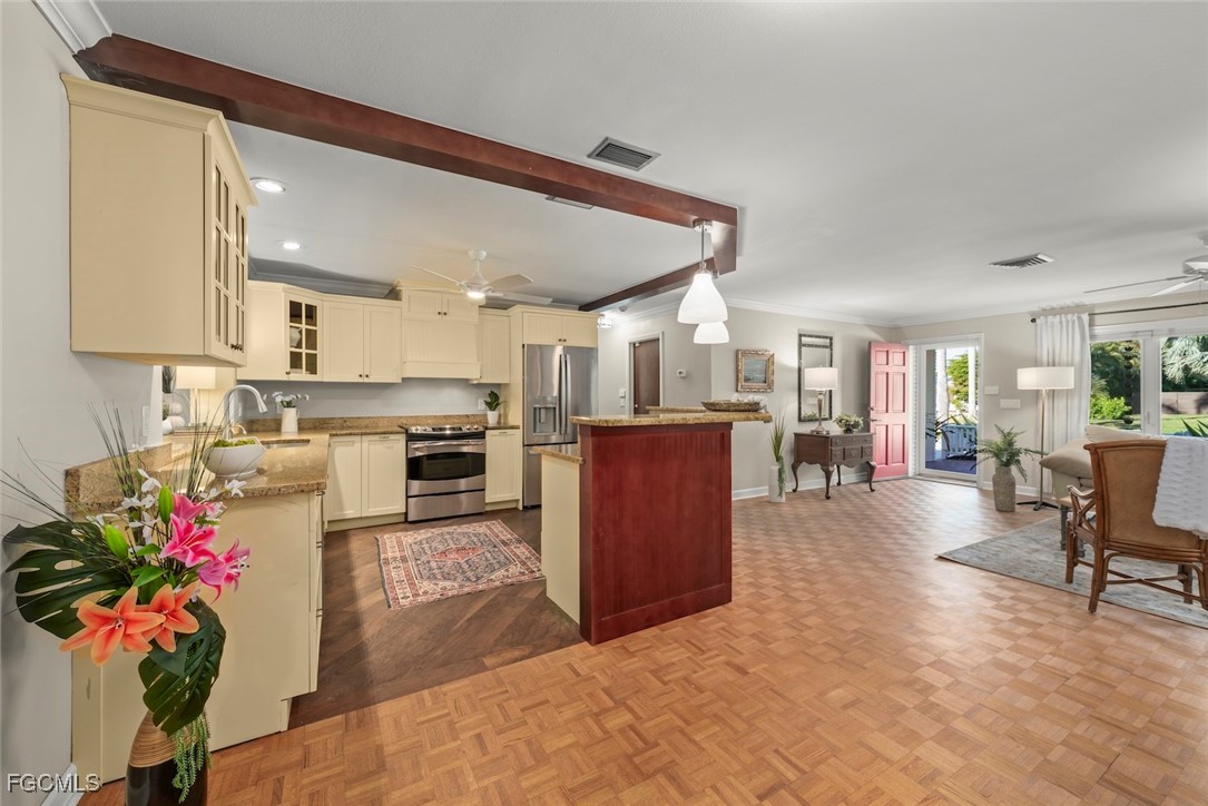 Located in the Riverside neighborhood near the historic Edison/Ford Estates off McGregor Blvd, this established mid century modern 3 bedroom 2 bathroom home is the perfect choice for peaceful "Old Florida" living. Pride in ownership is readily visible in the upkeep and care of this home. The kitchen is central to the living space as the main living area, dining area and sunroom flow seamlessly together. The kitchen features granite counter tops, new stainless steel refrigerator and dishwasher. Floor to ceiling windows in the sunroom and glass French doors provide a pathway to a gorgeous backyard living space featuring Florida trees including Simpson Stoppers, Dahune Holly, and Bottlebrush trees. The view is framed by a wooden pergola featuring beautiful Rangoon Creeper and a Wisteria-like vine when blooming in spring, summer and fall. The original parquet floors in the bedrooms and living room along with the black walnut kitchen wood flooring sustain the midcentury modern styling of the home.