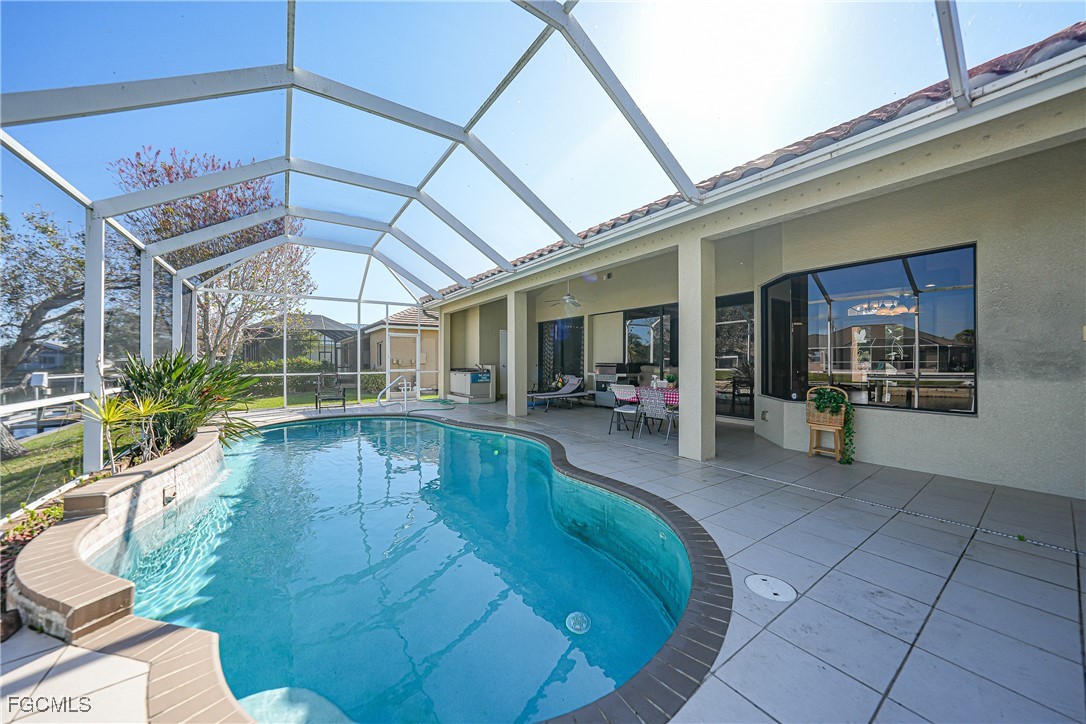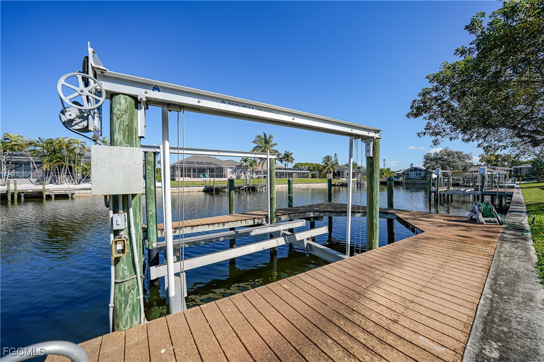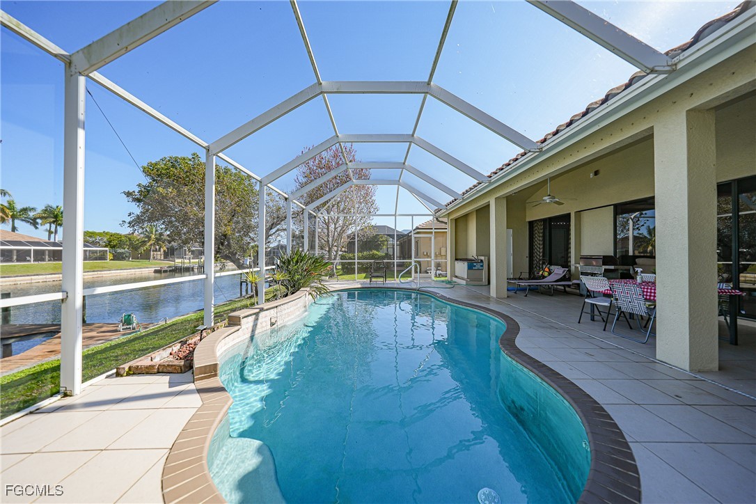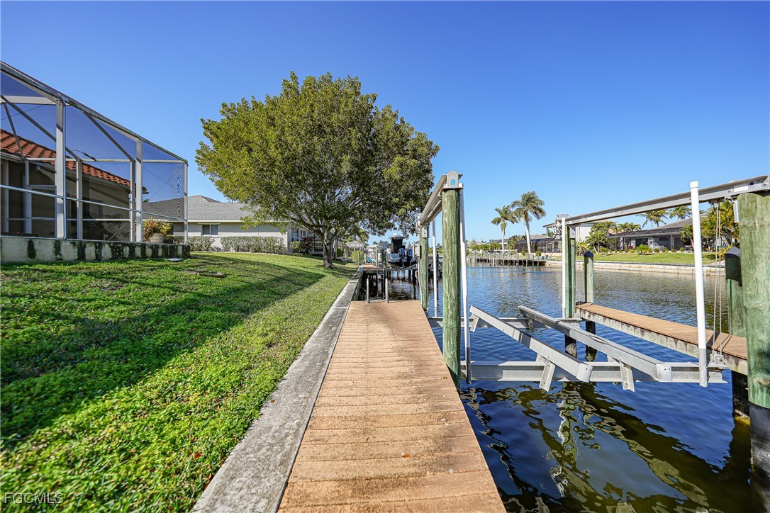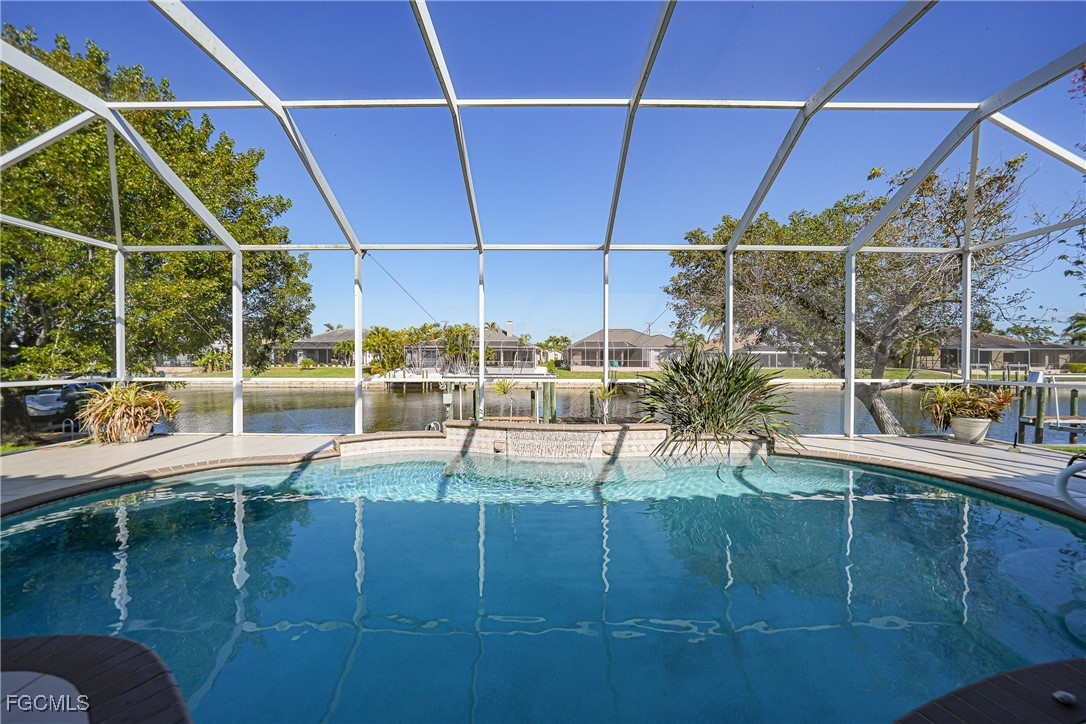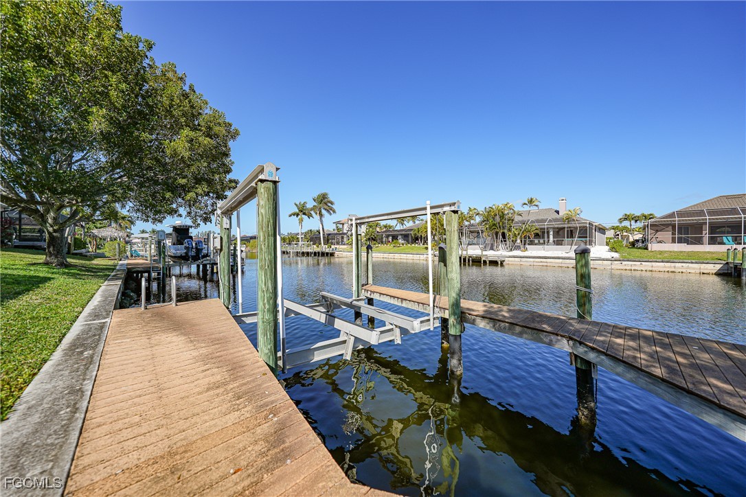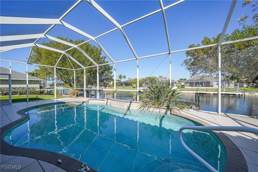 WATERFRONT POOL HOME ON SALTWATER CANAL IN CAPE CORAL! This waterfront pool residence offers 2,210 square feet of thoughtfully designed living space, ideal for everyday comfort and entertaining. Built in 2007, the home features three bedrooms, three bathrooms, a 2-car garage, and a versatile den/sitting room tucked near the living area—perfect for a home office, reading room, or quiet retreat. Boating enthusiasts will appreciate the 85 feet of waterfront, concrete seawall, private dock with water and electric hookups, and a 10,000-lb boat lift on a canal providing Gulf access. A paver driveway and walkway lead to a welcoming entry framed by mature palms and lush landscaping, while the tile roof and soft, neutral exterior offer timeless curb appeal. Inside, the expansive living area features soaring vaulted ceilings, soft blue-gray tones, and abundant natural light. A built-in feature wall with arched niches serves as a focal point, while neutral tile flooring flows throughout the main spaces. The open layout connects living and dining areas, ideal for gatherings. Sliding glass doors open to the lanai, enhancing indoor-outdoor living. The bright kitchen offers generous counters, crisp white cabinetry, and a breakfast bar for casual dining. A pantry adds storage, and the kitchen flows into a dinette highlighted by fishbowl windows. The laundry room includes cabinetry, a counter with built-in sink, and washer and dryer. The primary suite is a private retreat with a tray ceiling and lanai access. The spa-inspired bathroom boasts a walk-through shower framed by arched openings and glass block walls, dual vanities, and neutral tile flooring. Two guest bedrooms with built-in closets share a bathroom with a walk-in shower, providing comfort and privacy. Outside is an entertainer’s delight with a resort-style heated pool featuring a waterfall, tiled deck, and covered lanai with ceiling fans. A pool bath adds convenience, and wide canal views create a picturesque backdrop.