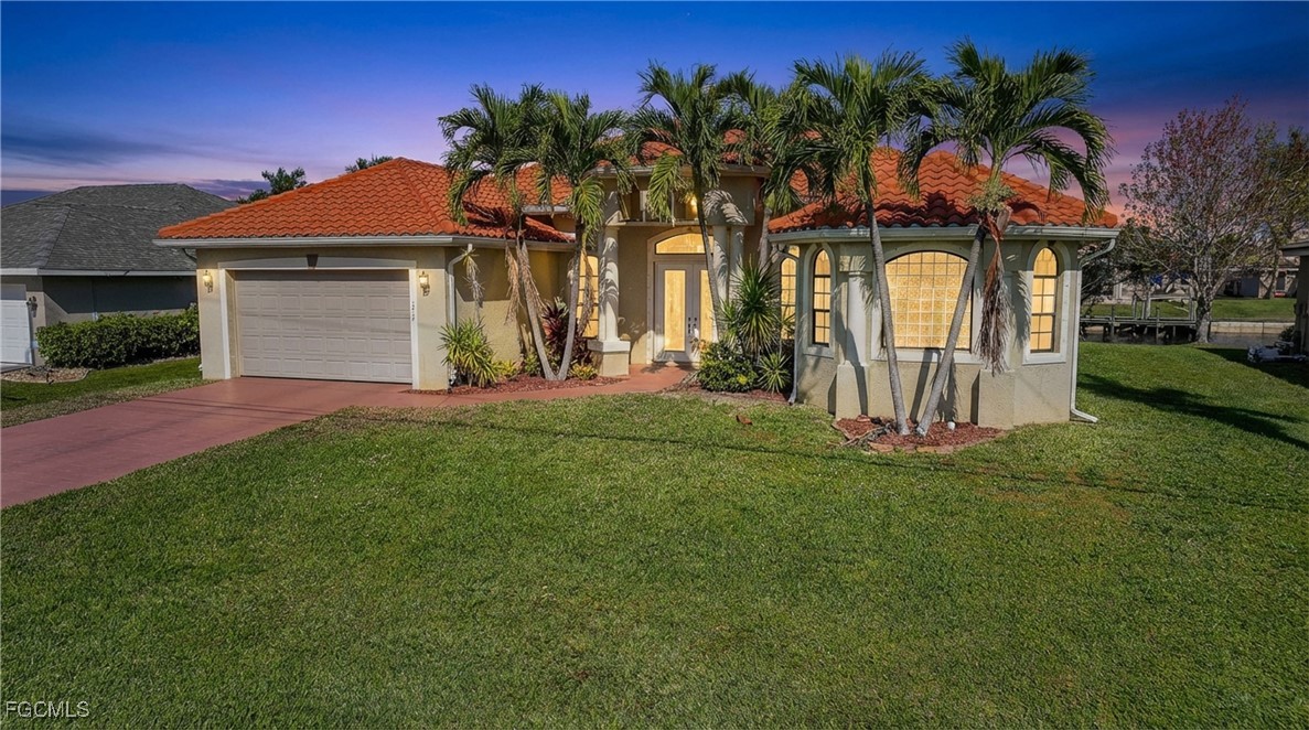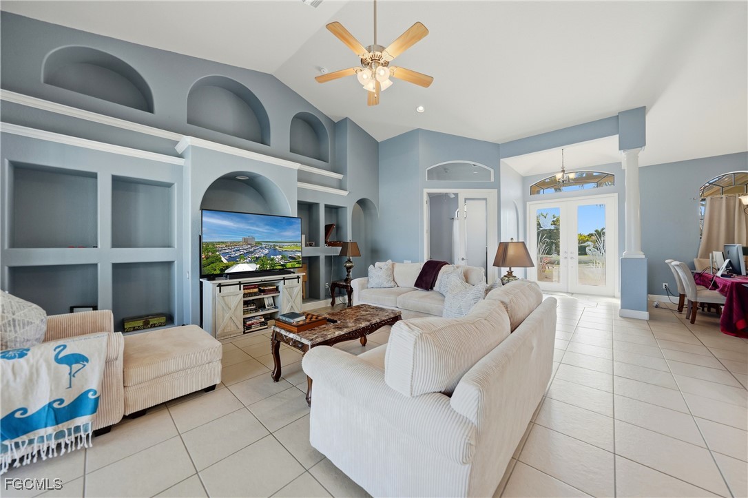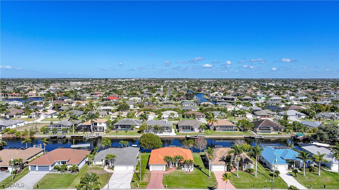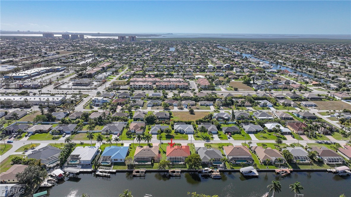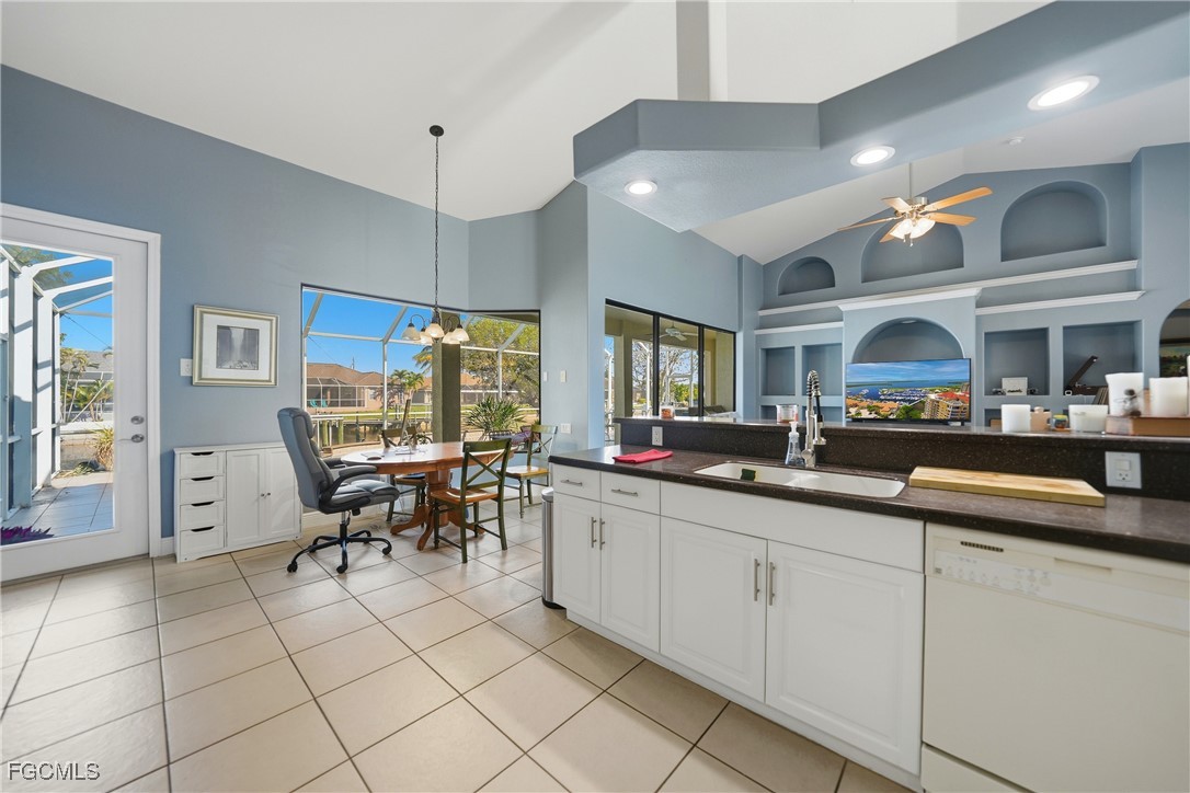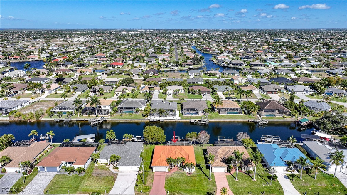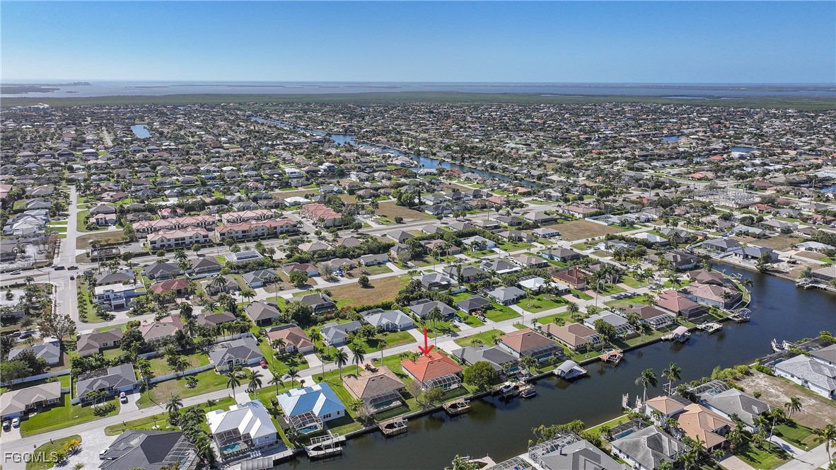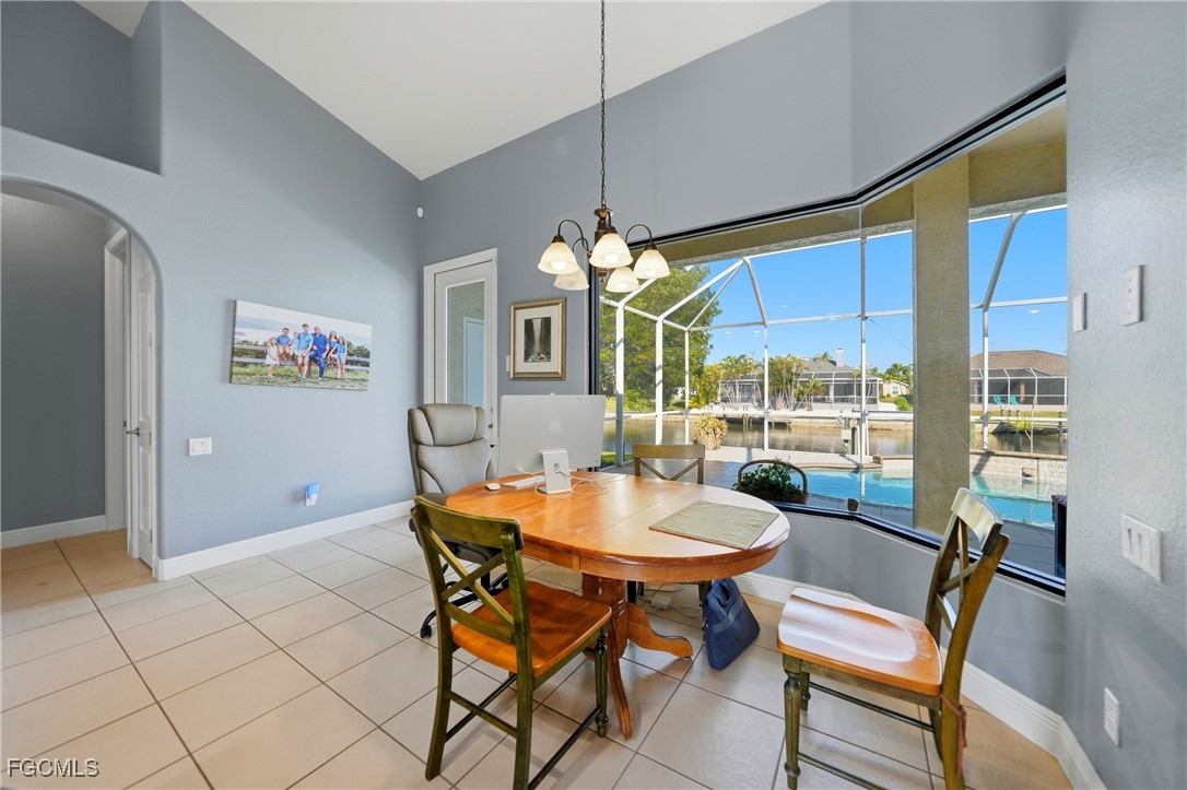 WATERFRONT POOL HOME ON SALTWATER CANAL IN CAPE CORAL! This waterfront pool residence offers 2,210 square feet of thoughtfully designed living space, ideal for everyday comfort and entertaining. Built in 2007, the home features three bedrooms, three bathrooms, a 2-car garage, and a versatile den/sitting room tucked near the living area—perfect for a home office, reading room, or quiet retreat. Boating enthusiasts will appreciate the 85 feet of waterfront, concrete seawall, private dock with water and electric hookups, and a 10,000-lb boat lift on a canal providing Gulf access. A paver driveway and walkway lead to a welcoming entry framed by mature palms and lush landscaping, while the tile roof and soft, neutral exterior offer timeless curb appeal. Inside, the expansive living area features soaring vaulted ceilings, soft blue-gray tones, and abundant natural light. A built-in feature wall with arched niches serves as a focal point, while neutral tile flooring flows throughout the main spaces. The open layout connects living and dining areas, ideal for gatherings. Sliding glass doors open to the lanai, enhancing indoor-outdoor living. The bright kitchen offers generous counters, crisp white cabinetry, and a breakfast bar for casual dining. A pantry adds storage, and the kitchen flows into a dinette highlighted by fishbowl windows. The laundry room includes cabinetry, a counter with built-in sink, and washer and dryer. The primary suite is a private retreat with a tray ceiling and lanai access. The spa-inspired bathroom boasts a walk-through shower framed by arched openings and glass block walls, dual vanities, and neutral tile flooring. Two guest bedrooms with built-in closets share a bathroom with a walk-in shower, providing comfort and privacy. Outside is an entertainer’s delight with a resort-style heated pool featuring a waterfall, tiled deck, and covered lanai with ceiling fans. A pool bath adds convenience, and wide canal views create a picturesque backdrop.