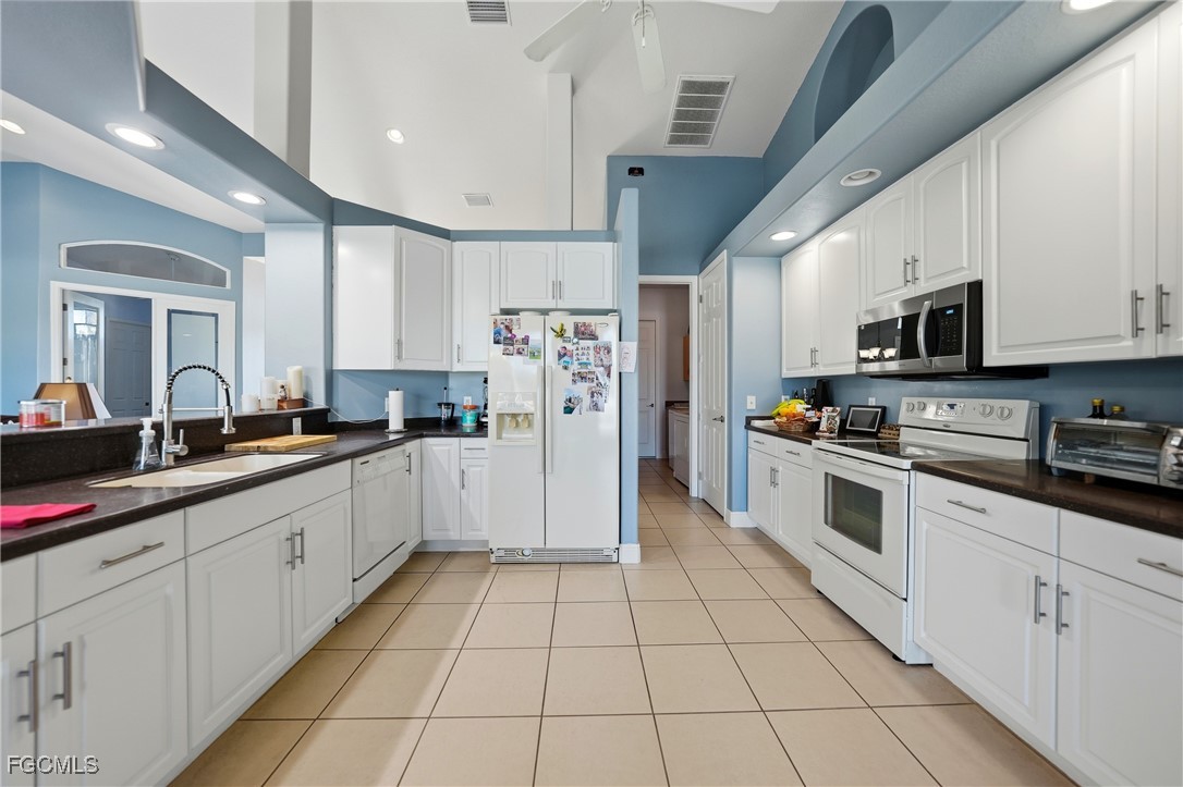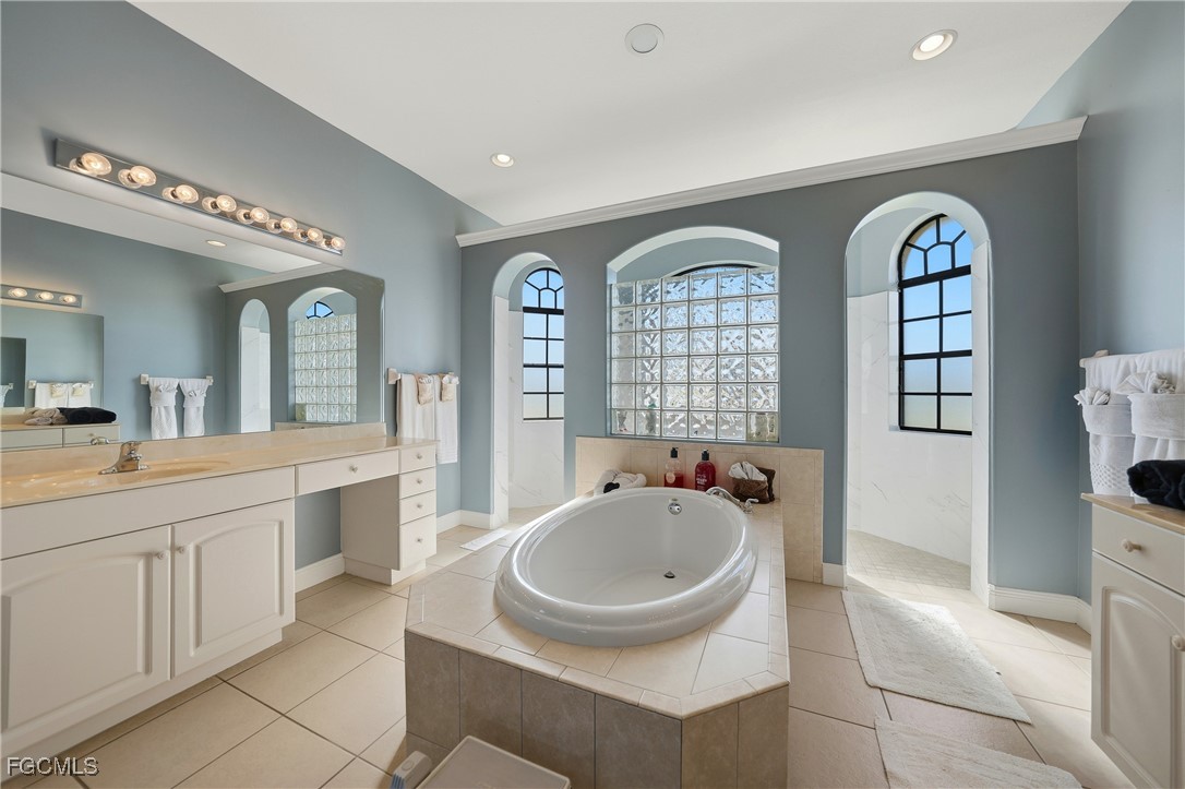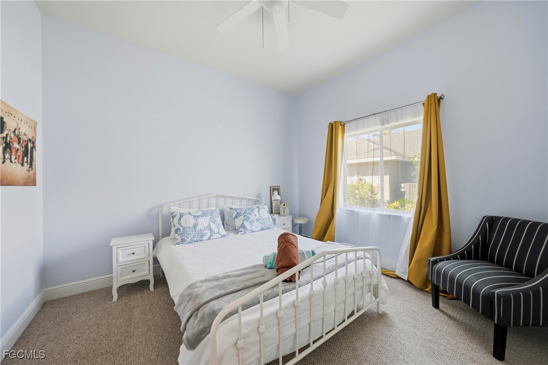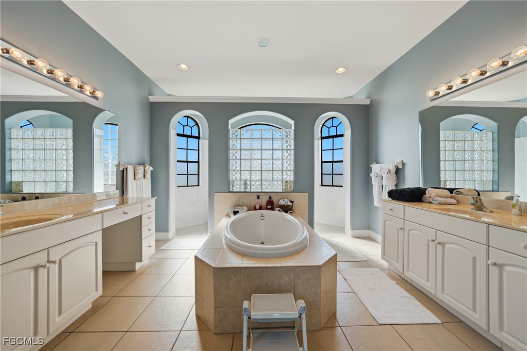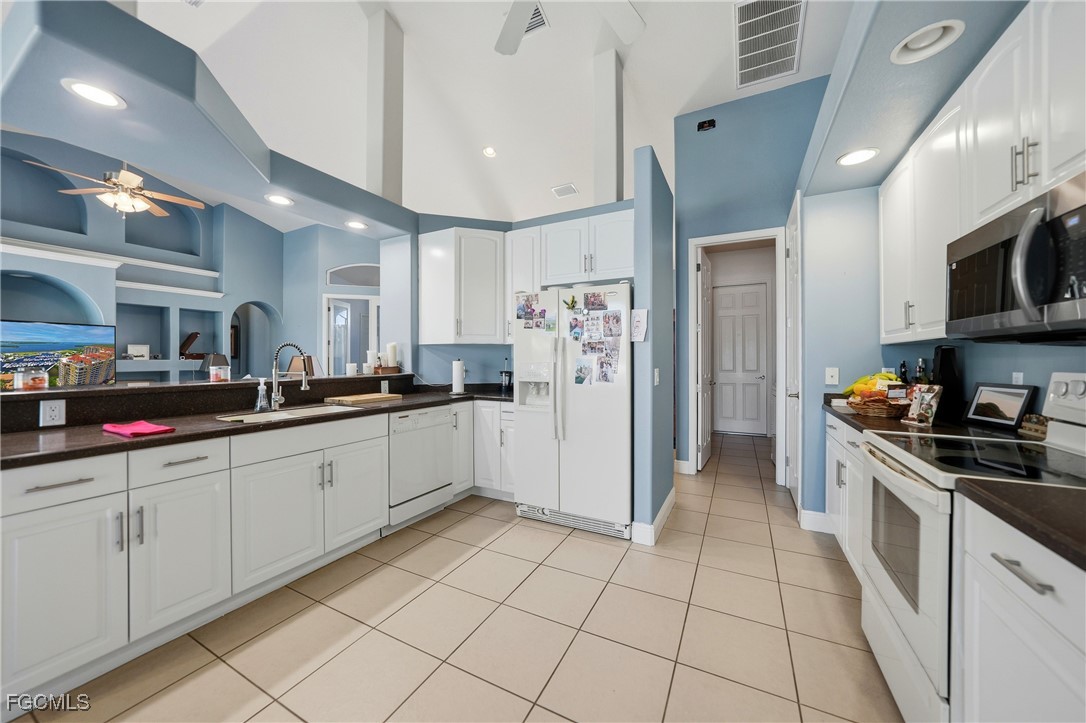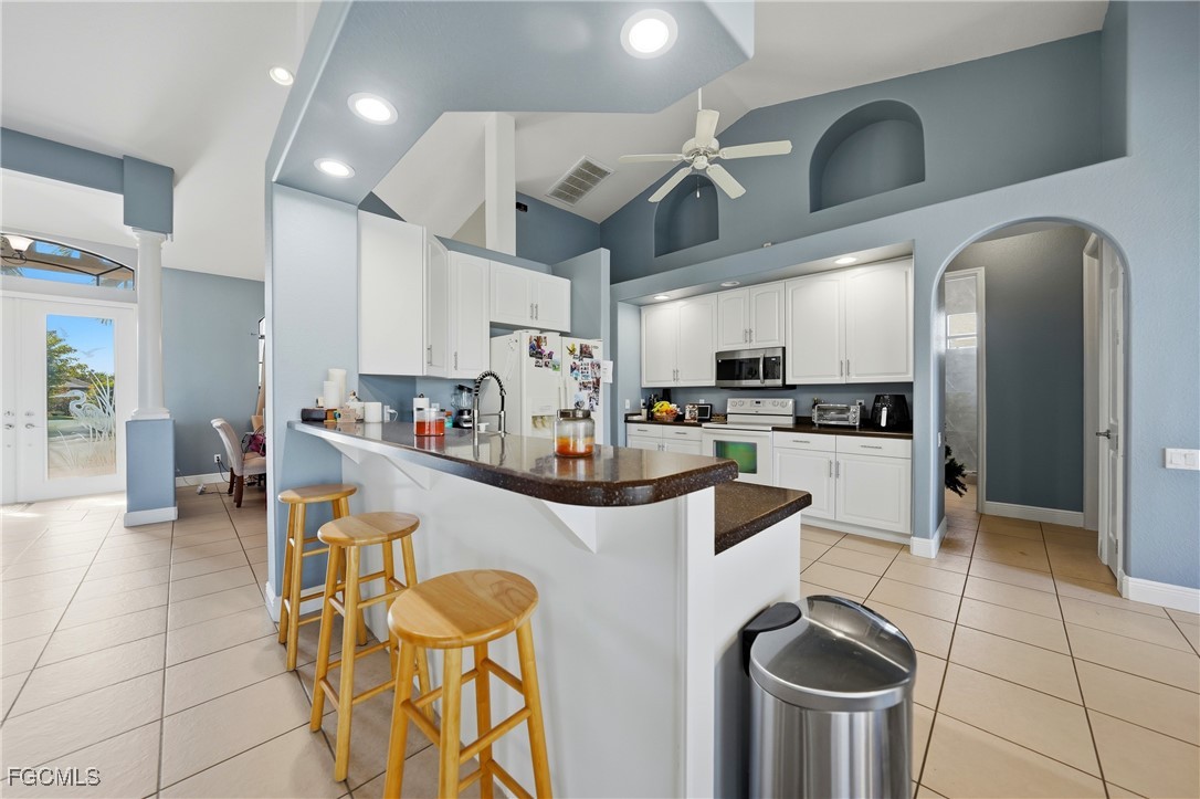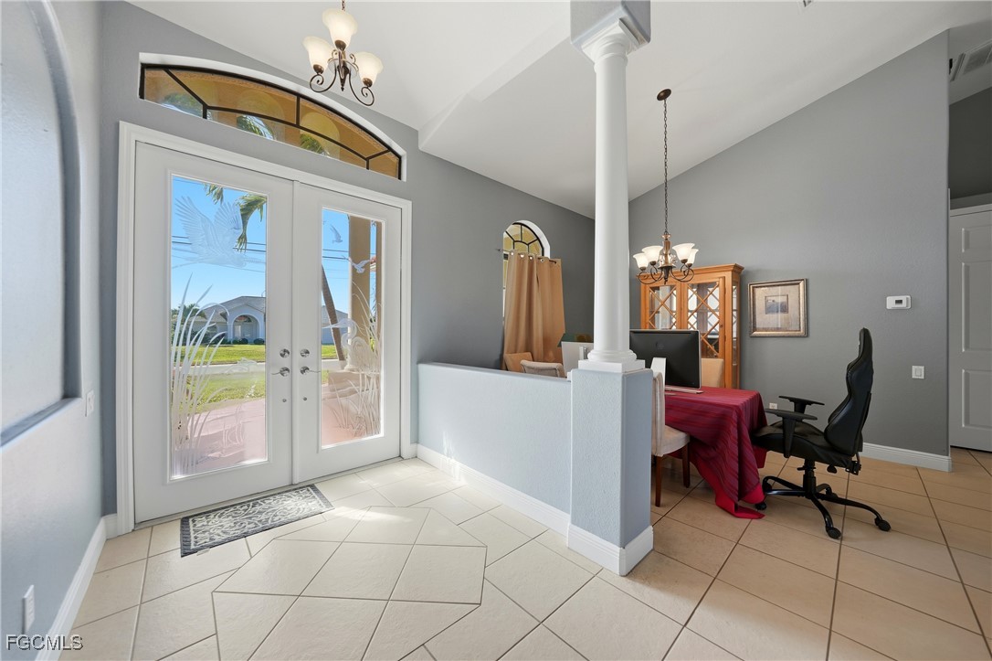 WATERFRONT POOL HOME ON SALTWATER CANAL IN CAPE CORAL! This waterfront pool residence offers 2,210 square feet of thoughtfully designed living space, ideal for everyday comfort and entertaining. Built in 2007, the home features three bedrooms, three bathrooms, a 2-car garage, and a versatile den/sitting room tucked near the living area—perfect for a home office, reading room, or quiet retreat. Boating enthusiasts will appreciate the 85 feet of waterfront, concrete seawall, private dock with water and electric hookups, and a 10,000-lb boat lift on a canal providing Gulf access. A paver driveway and walkway lead to a welcoming entry framed by mature palms and lush landscaping, while the tile roof and soft, neutral exterior offer timeless curb appeal. Inside, the expansive living area features soaring vaulted ceilings, soft blue-gray tones, and abundant natural light. A built-in feature wall with arched niches serves as a focal point, while neutral tile flooring flows throughout the main spaces. The open layout connects living and dining areas, ideal for gatherings. Sliding glass doors open to the lanai, enhancing indoor-outdoor living. The bright kitchen offers generous counters, crisp white cabinetry, and a breakfast bar for casual dining. A pantry adds storage, and the kitchen flows into a dinette highlighted by fishbowl windows. The laundry room includes cabinetry, a counter with built-in sink, and washer and dryer. The primary suite is a private retreat with a tray ceiling and lanai access. The spa-inspired bathroom boasts a walk-through shower framed by arched openings and glass block walls, dual vanities, and neutral tile flooring. Two guest bedrooms with built-in closets share a bathroom with a walk-in shower, providing comfort and privacy. Outside is an entertainer’s delight with a resort-style heated pool featuring a waterfall, tiled deck, and covered lanai with ceiling fans. A pool bath adds convenience, and wide canal views create a picturesque backdrop.