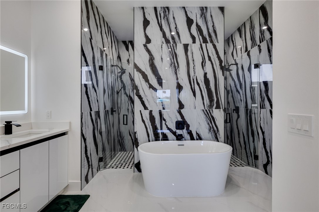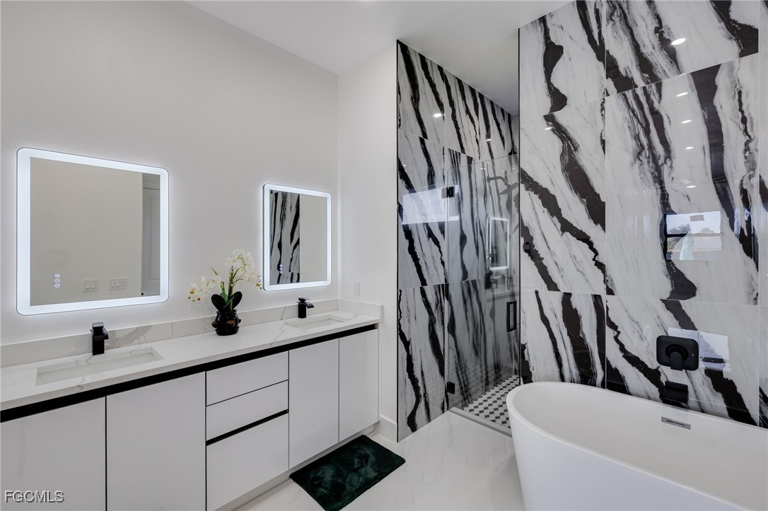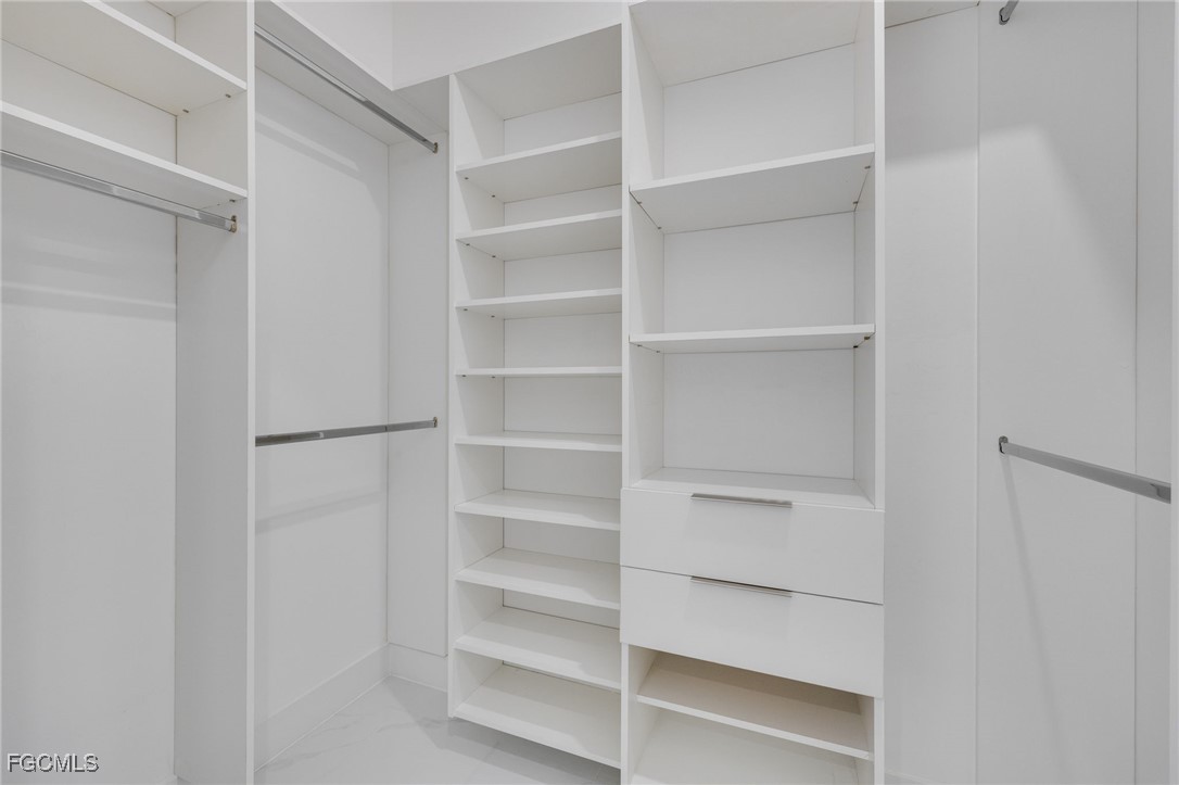 The primary bath is a true retreat with dual sinks, a walk-in shower, a relaxing soaking tub, and walk-in closets, all enhanced with custom shelving. Every closet throughout the home includes built-in organizers for a clean, elevated look.