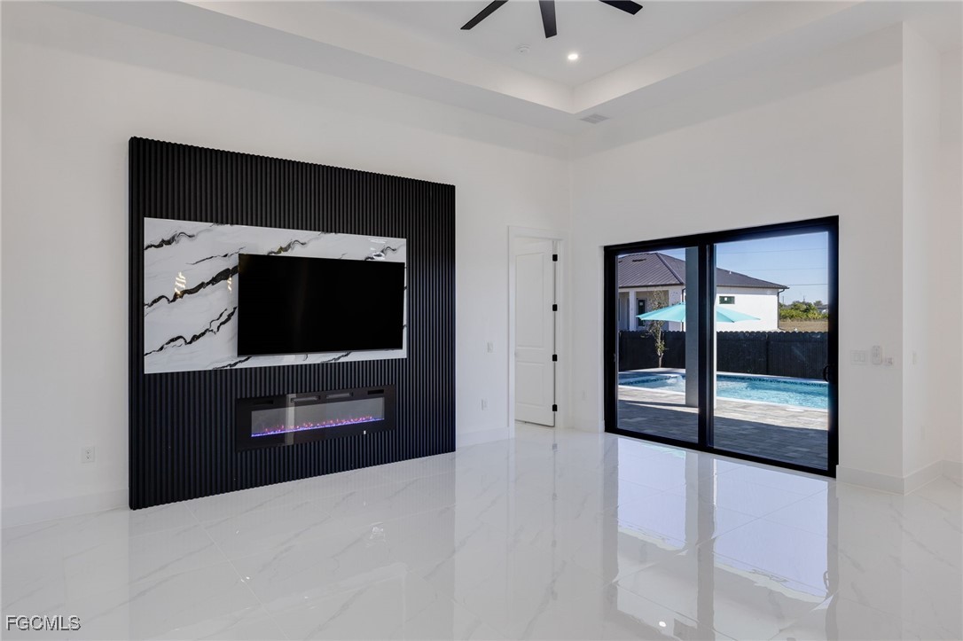 The kitchen features custom European cabinetry, quartz countertops, and a dedicated coffee bar, seamlessly flowing into the main living area—ideal for both everyday living and entertaining. The living room showcases a custom TV accent wall with an electric fireplace, and the flat screen TV is included!
