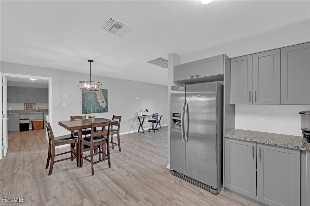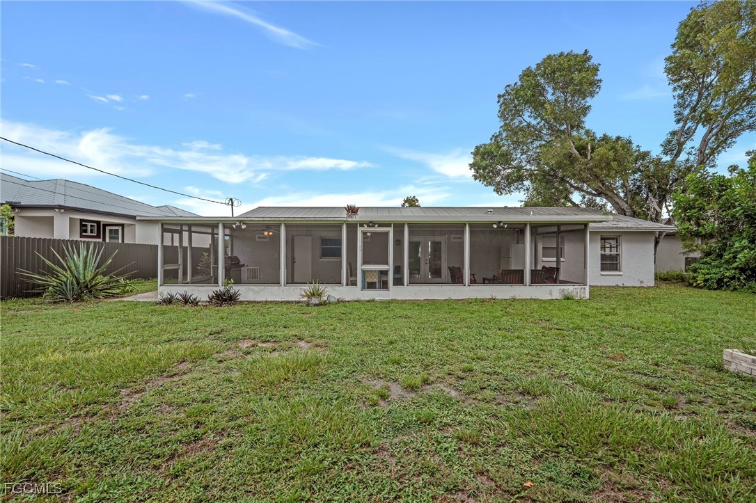 The remodeled kitchen features wood cabinetry, granite countertops, subway tile backsplash, and stainless-steel appliances. A spacious dining area opens through French doors to an oversized screened lanai, perfect for indoor-outdoor living. New dishwasher in 2025 and new water heater in 2024.