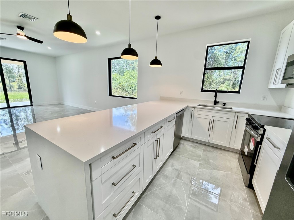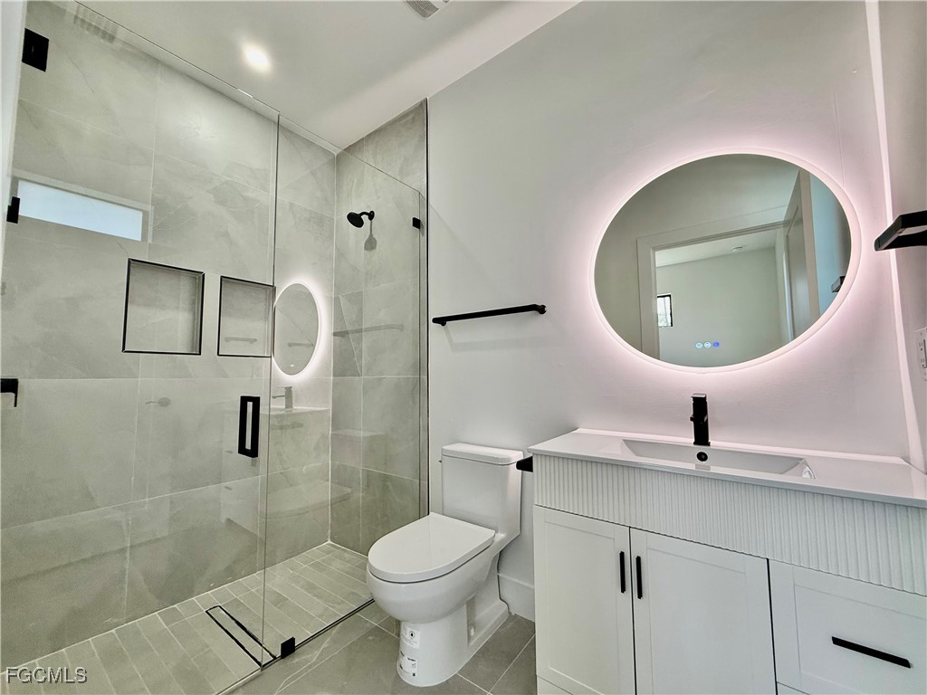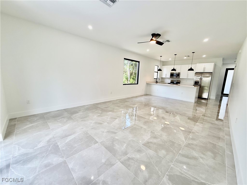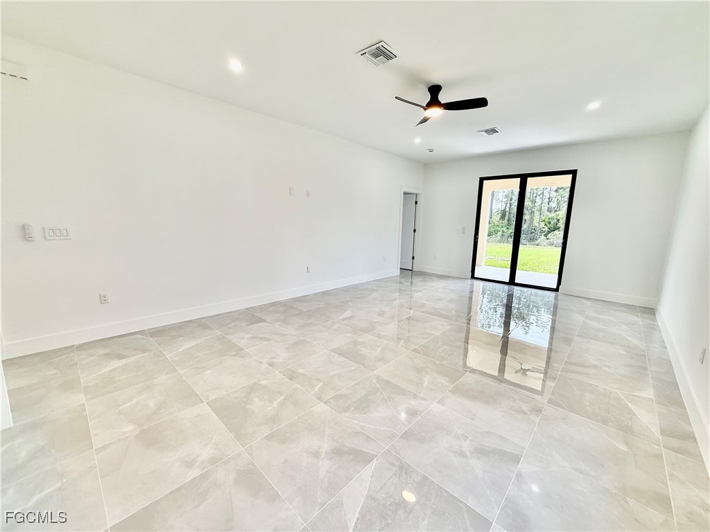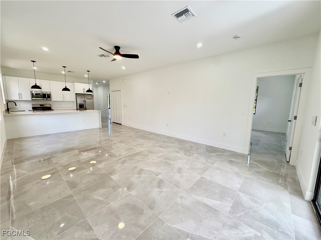 BRAND NEW- READY TO MOVE IN- C.O. HAS BEEN ISSUED. Affordable 3 bedroom 2 bath with DOUBLE GARAGE, UPGRADES GALORE, 24 X 24 porcelain tile floors throughout, QUARTZ countertops in the kitchen with waterfall, soft close doors and drawers, pendant lighting over the breakfast bar, oversized pantry, stainless steel appliances, large fixed glass window in the dining room with plenty of extra natural light, impact resistant windows and doors, quartz tops in bathrooms with frameless glass shower doors, lighted mirrors, porcelain tile showers and soft close doors and drawers, primary bedroom with transom window for extra natural light, ensuite bath and walk in closet, LED lighting throughout, covered lanai with tile floors overlooking the oversized backyard with a canal in the rear for privacy, extra long driveway with plenty of parking for multiple cars, MOVE IN READY HOME. C.O. HAS BEEN ISSUED, quiet low traffic street located just minutes to SR 82, I-75, Ft Myers and SWFL International airport. NO FLOOD INSURANCE REQUIRED- LEHIGH IS THE HIGHEST ELEVATION IN LEE COUNTY.