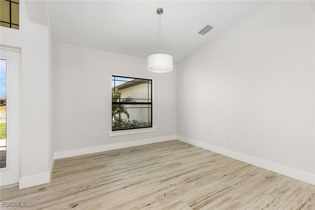 Enjoy the Florida lifestyle in this stunning new construction pool home located in desirable SW Cape Coral. Ready for occupancy. This 4 bedroom+Den/3 bath modern style floor plan will surely impress. Double glass door entryway, foyer opens up to the large living room with vaulted ceilings, dining area and separate den/game room, plenty of room for entertaining. The kitchen is a dream featuring solid wood cabinetry with crown moulding, soft close hardware, Calacatta Quartz counters and stainless steel appliances. Tray ceilings in all bedrooms. 8' doors throughout. Other high end features such as 9"x47" porcelain plank tile flooring throughout entire home. Calacatta Quartz counters in baths and laundry room, 5” baseboard throughout, all impact windows, doors and slider, tray ceilings in all bedrooms and den. Split floor plan featuring three large guest bedrooms, master bedroom suite with two generous size walk in closets and well appointed master bath with free standing tub, spacious shower and double vanity. 13'x26' pool and upgraded "clear view" screen enclosure. Impact resistant windows, door, slider. Oversized lot 85'x125'. Connected to city water, sewer and irrigation