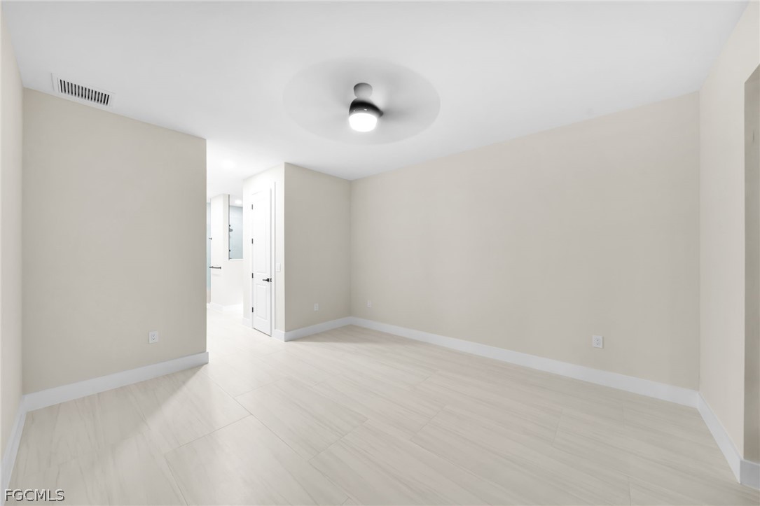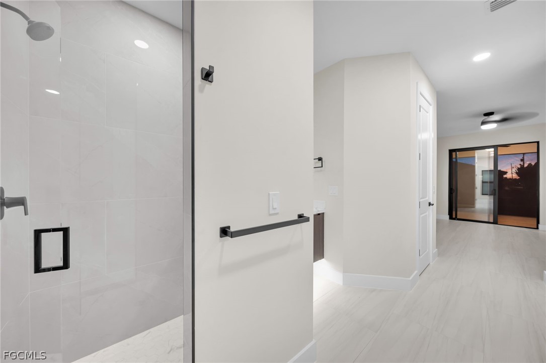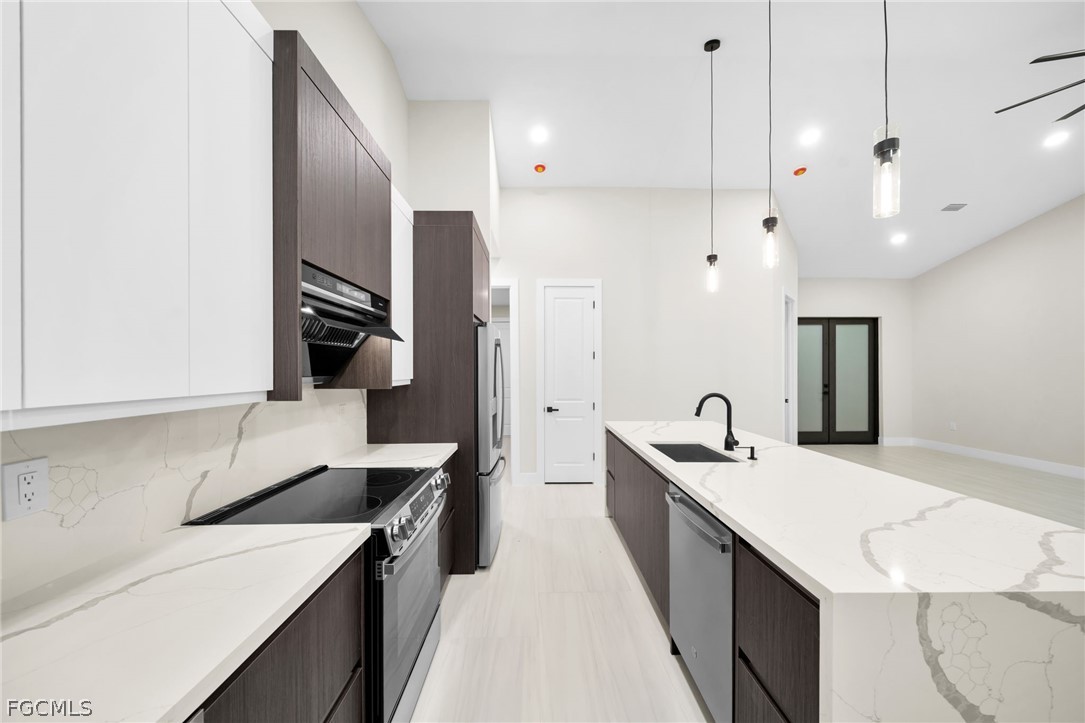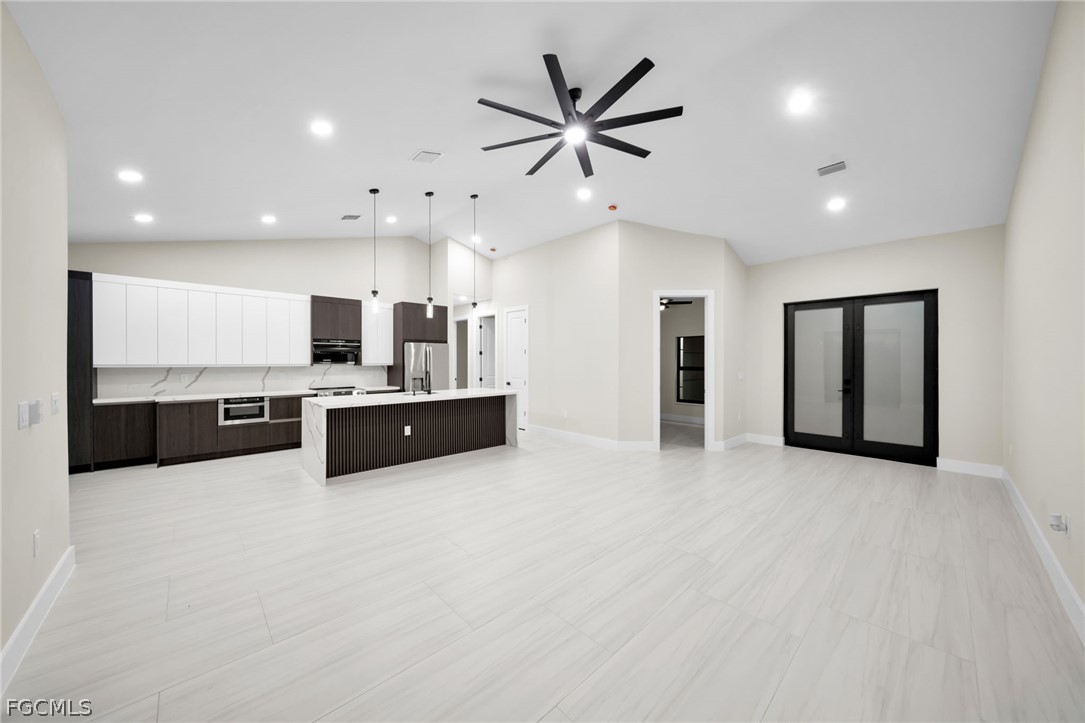 Tile flooring extends throughout the entire home for a clean, low-maintenance finish. The kitchen stands out with a waterfall quartz island, wood backsplash, and premium cabinetry featured in both the kitchen and closets. A whole-house reverse osmosis system provides purified water at every faucet.