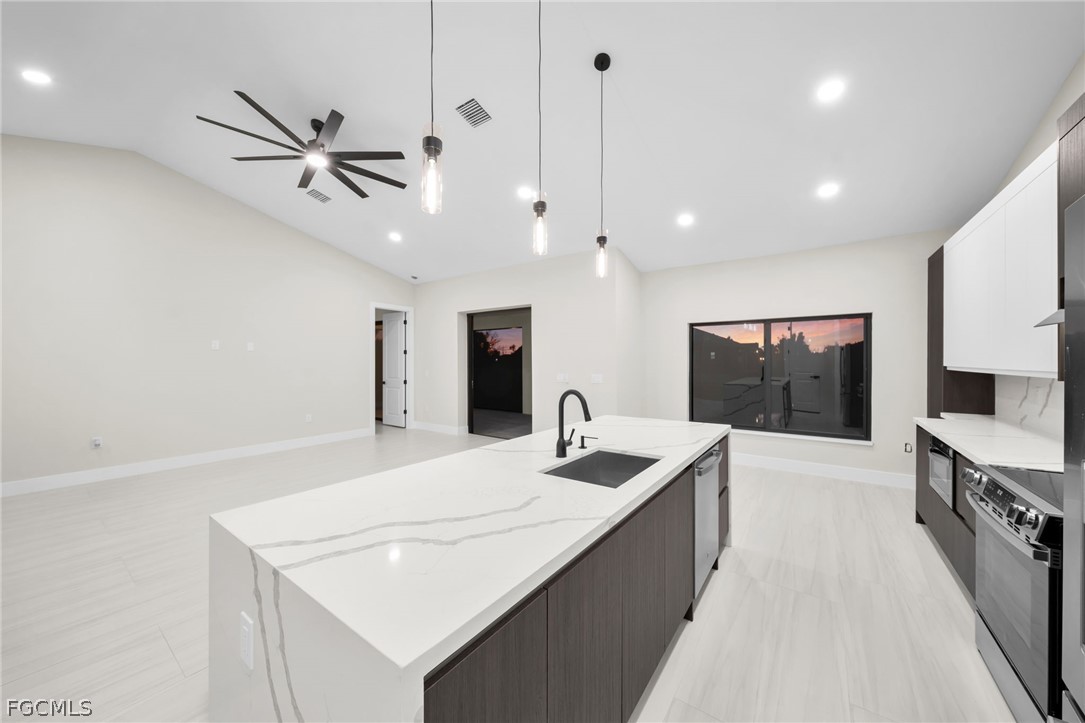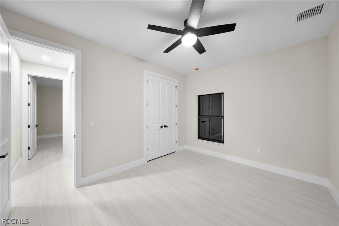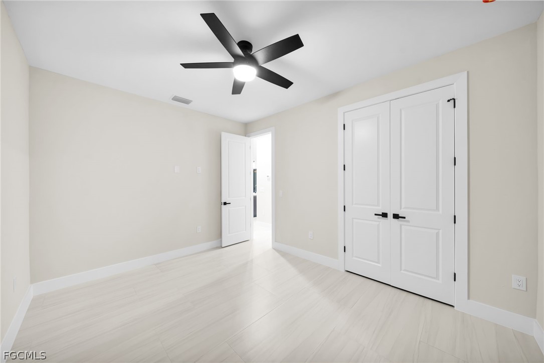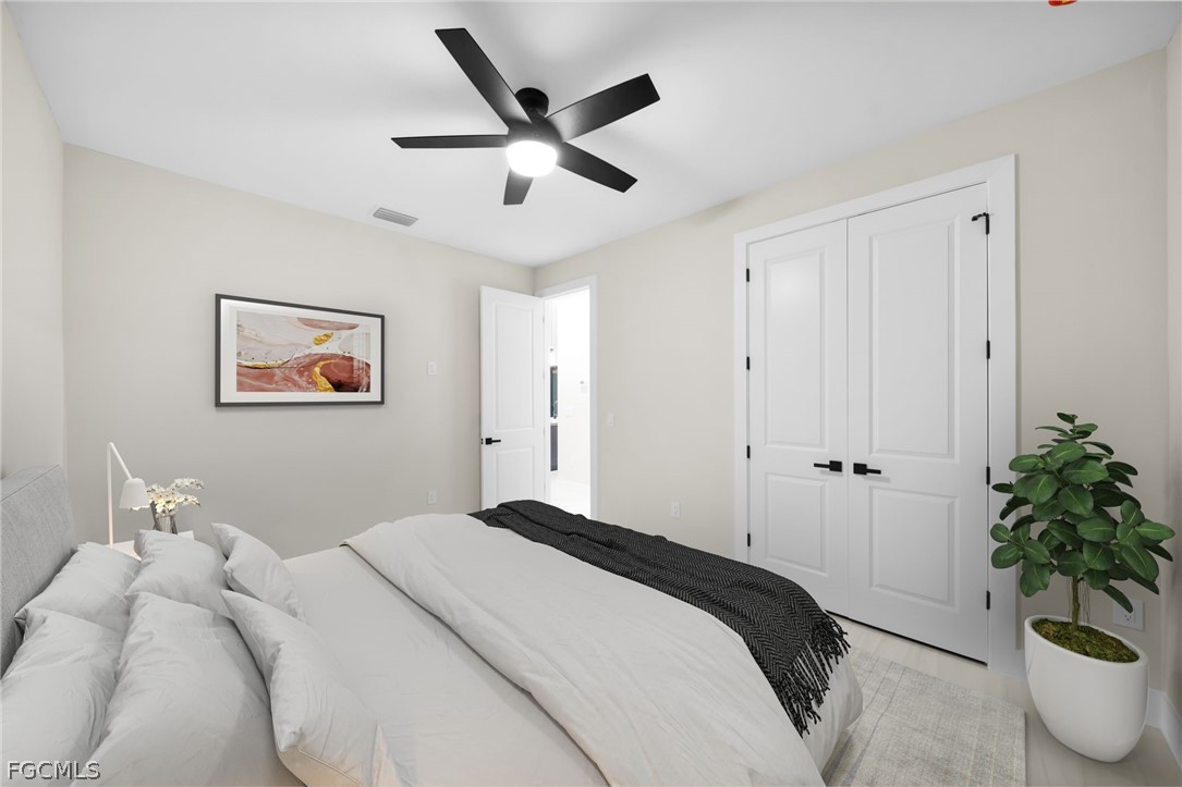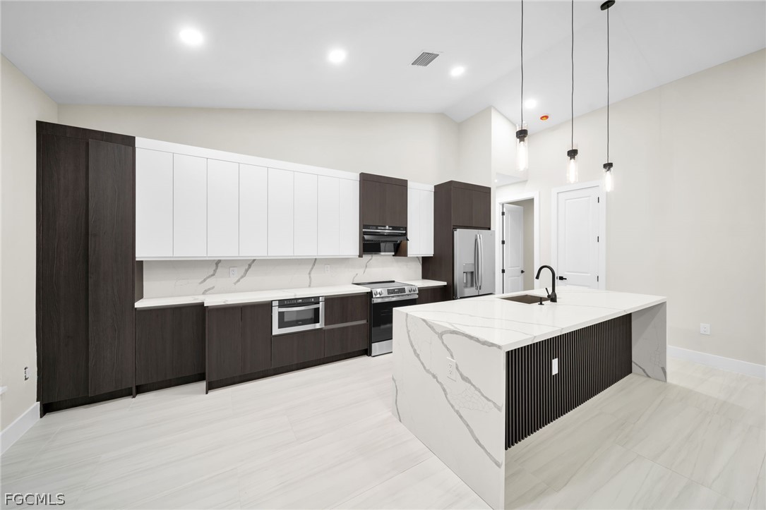 Tile flooring extends throughout the entire home for a clean, low-maintenance finish. The kitchen stands out with a waterfall quartz island, wood backsplash, and premium cabinetry featured in both the kitchen and closets. A whole-house reverse osmosis system provides purified water at every faucet.