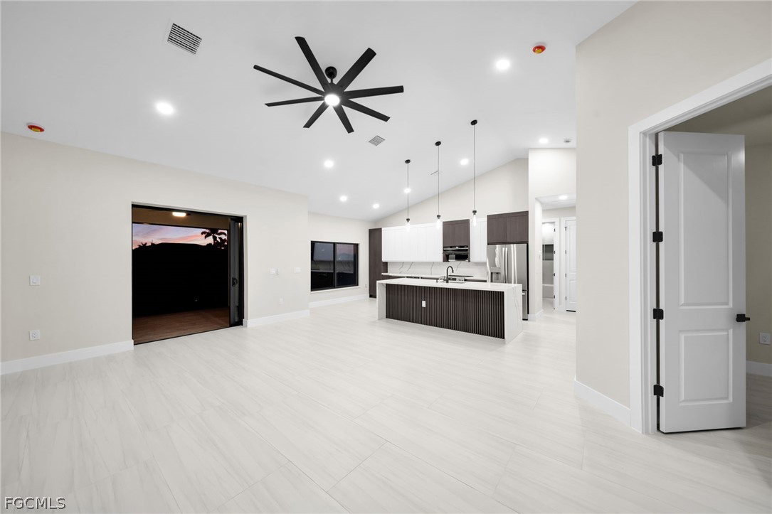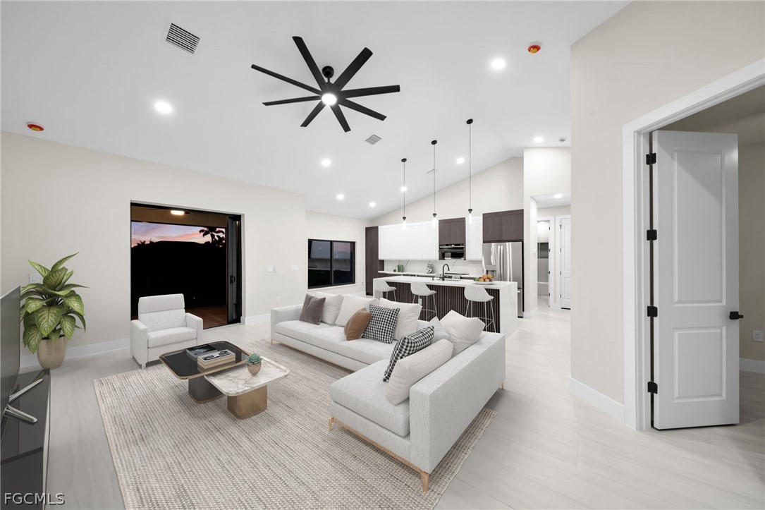 Expansive pocket-style sliding glass doors create a seamless indoor-outdoor flow, opening to tranquil freshwater canal views. Located outside of a flood zone, this property combines serenity with everyday convenience.