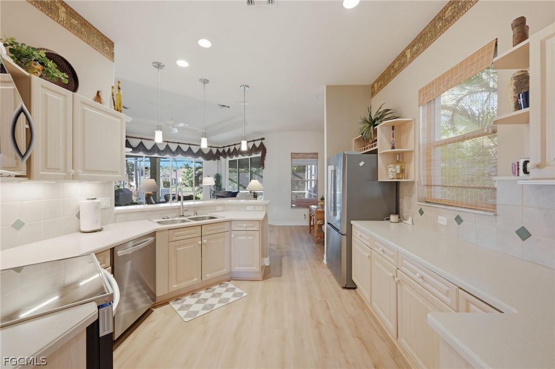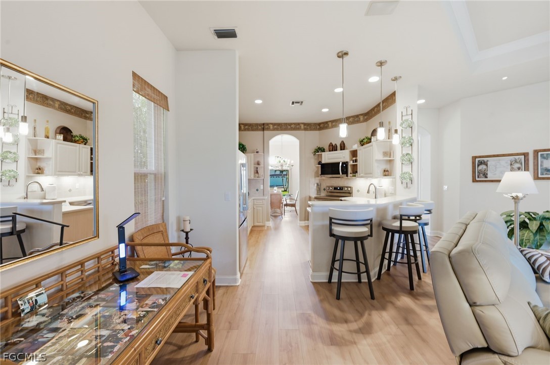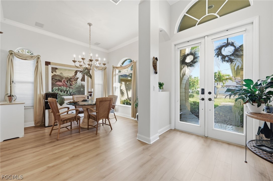 Step inside to find soaring vaulted ceilings with crown molding, new luxury vinyl plank flooring, new stainless steel kitchen appliances, a spacious formal dining room ideal for entertaining, and a versatile den/office that can easily be converted into a third bedroom. The thoughtfully designed layout provides that indoor/outdoor lifestyle we all love here in SWFL. The screened lanai and updated saltwater pool are perfect for relaxing or hosting guests year-round. The paver driveway and extended paver walkway add attractive curb appeal, while major updates provide peace of mind—including a new A/C system (2024) and a roof less than five years old.