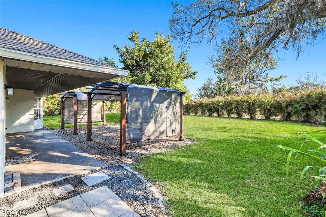 Welcome to Colonial Pines in North Fort Myers — a quiet cul-de-sac community with no HOA restrictions. This well-maintained 3-bedroom home sits on a spacious .52-acre lot, offering the ideal balance of privacy and convenience. Inside, you’ll find tile flooring throughout the home and an updated kitchen featuring granite countertops and stainless steel appliances, all opening seamlessly to the main living area — perfect for entertaining. The split-bedroom layout adds privacy, and every bedroom includes a walk-in closet for generous storage. The owner’s suite also features dual sinks and an updated walk-in shower. Step outside to your backyard pergolas overlooking the expansive yard, complete with mature banana trees and plenty of space to relax, entertain, or simply enjoy the outdoors. Zoned AG-3, the property provides added flexibility while maintaining a peaceful countryside feel. Major updates include a new roof (2023), newer A/C, and newer water heater. Conveniently located near shopping, dining, and everyday essentials, this home offers space, comfort, and freedom in one of North Fort Myers’ most established neighborhoods.