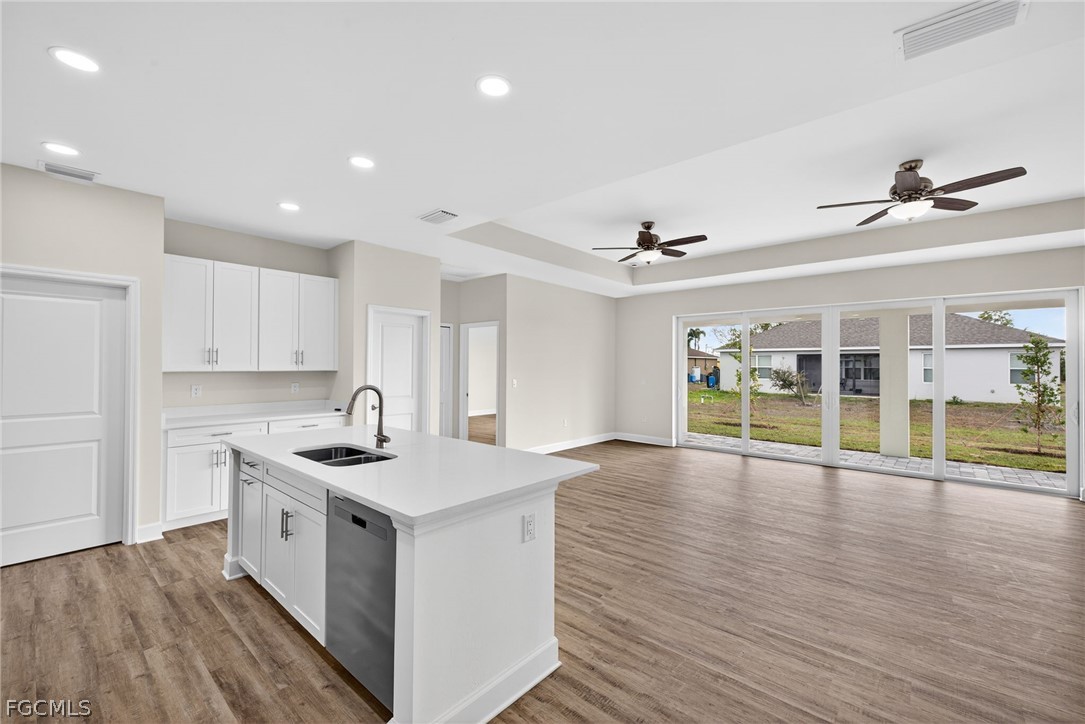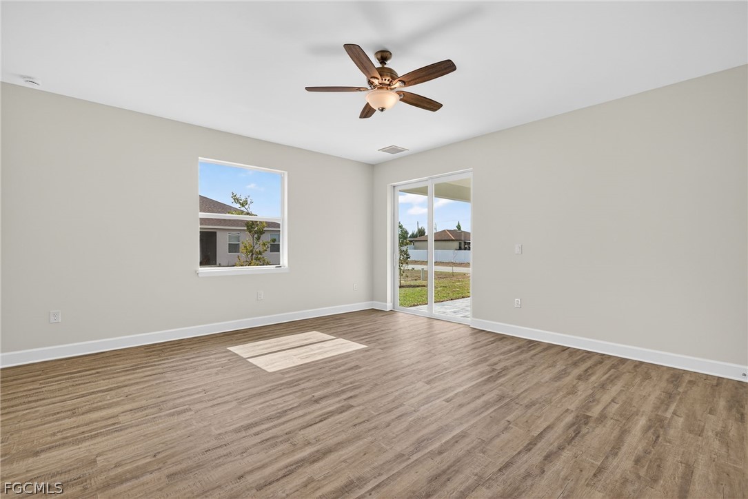 New Construction Cape Coral | Corner Lot | Dual Primary Suites | 3 Bathroom | 3-Car Garage | Move-In Ready. Introducing The Bluewater Cove, an expansive single-story new construction home in Cape Coral offering 4 bedrooms, 3 bathrooms, and a rare dual primary suite layout ideal for multi-generational living, guests, or a private office retreat. The bright open-concept floor plan features soaring tray ceilings, a spacious great room, and seamless indoor-outdoor living. The chef-inspired kitchen includes quartz countertops, soft-close all-wood cabinetry, stainless steel appliances, a large island with breakfast bar, and an oversized walk-in pantry. The main primary suite offers direct lanai access, dual vanities, a large glass-enclosed shower, and a walk-in closet. The second primary suite includes its own private bath and walk-in closet, providing flexibility and privacy. Two additional bedrooms share a third full bathroom in a split-bedroom floor plan. Enjoy outdoor living on the 1,000 sq ft under-truss screened lanai with plenty of room to add a custom pool and outdoor oasis. Additional features include impact windows and doors, an elevated lot outside the flood zone, and a spacious 3-car garage. Conveniently located near shopping, dining, entertainment, and with easy access to Fort Myers and Southwest Florida beaches. Built by Sunlife Homes and backed by a 1-year workmanship and 10-year structural warranty, with energy-efficient systems and smart home readiness. One or more pictures may be virtually staged. This is the Bluewater Cove Plan.